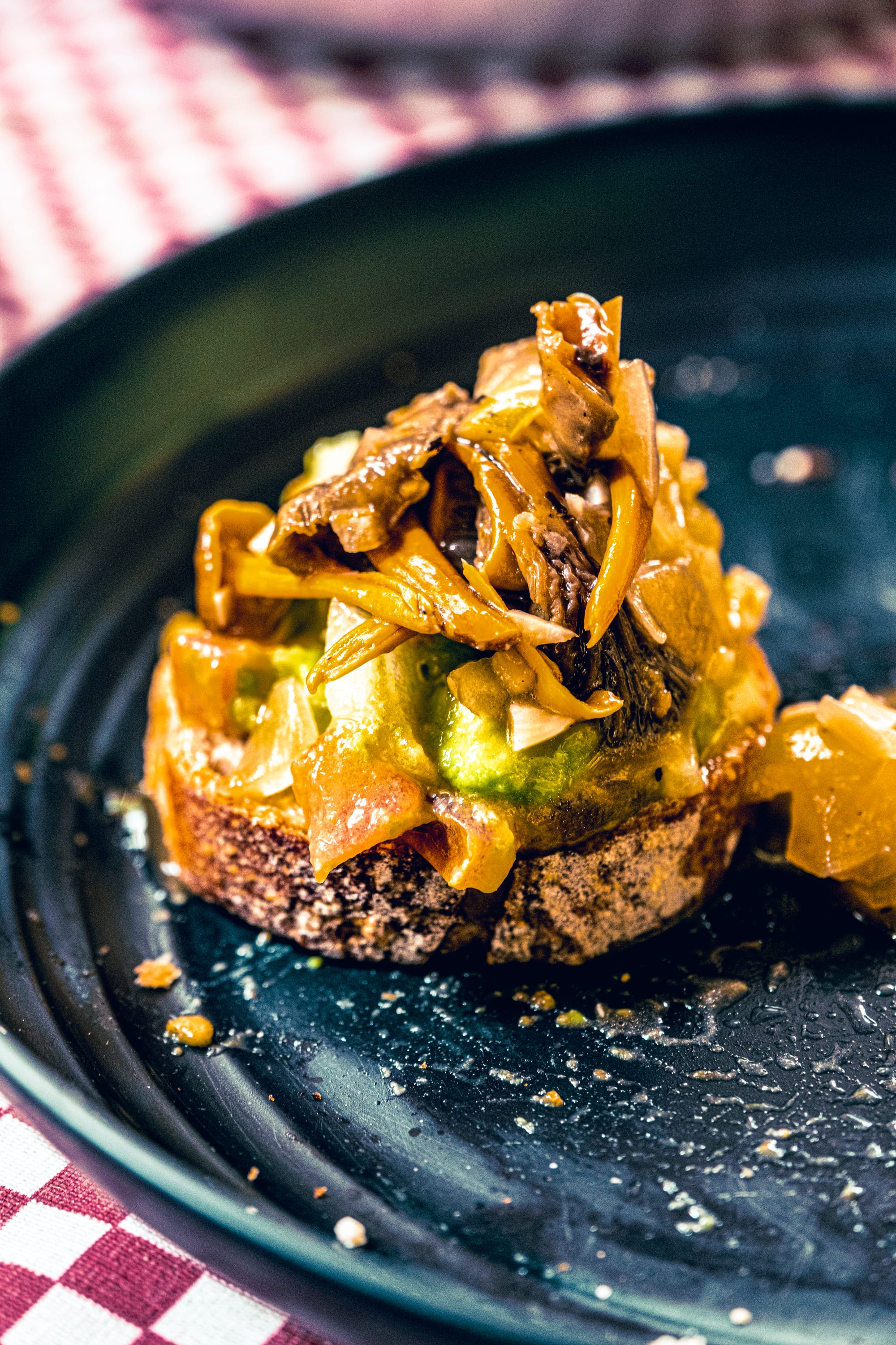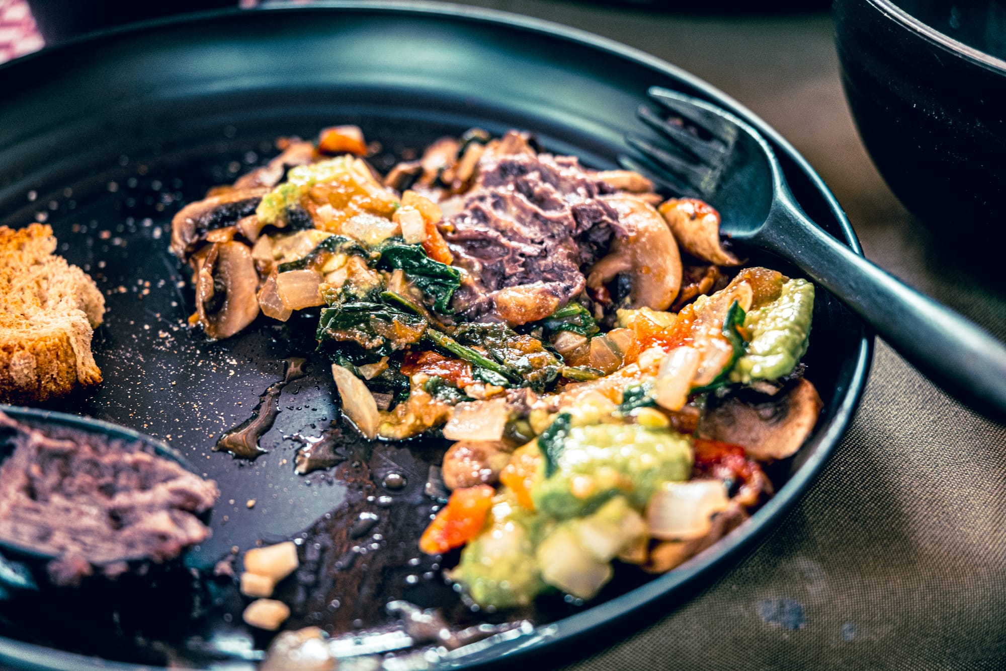 We ate a vegan version—sautéed mushrooms with salt and lime, cooked with spinach and tomato.
