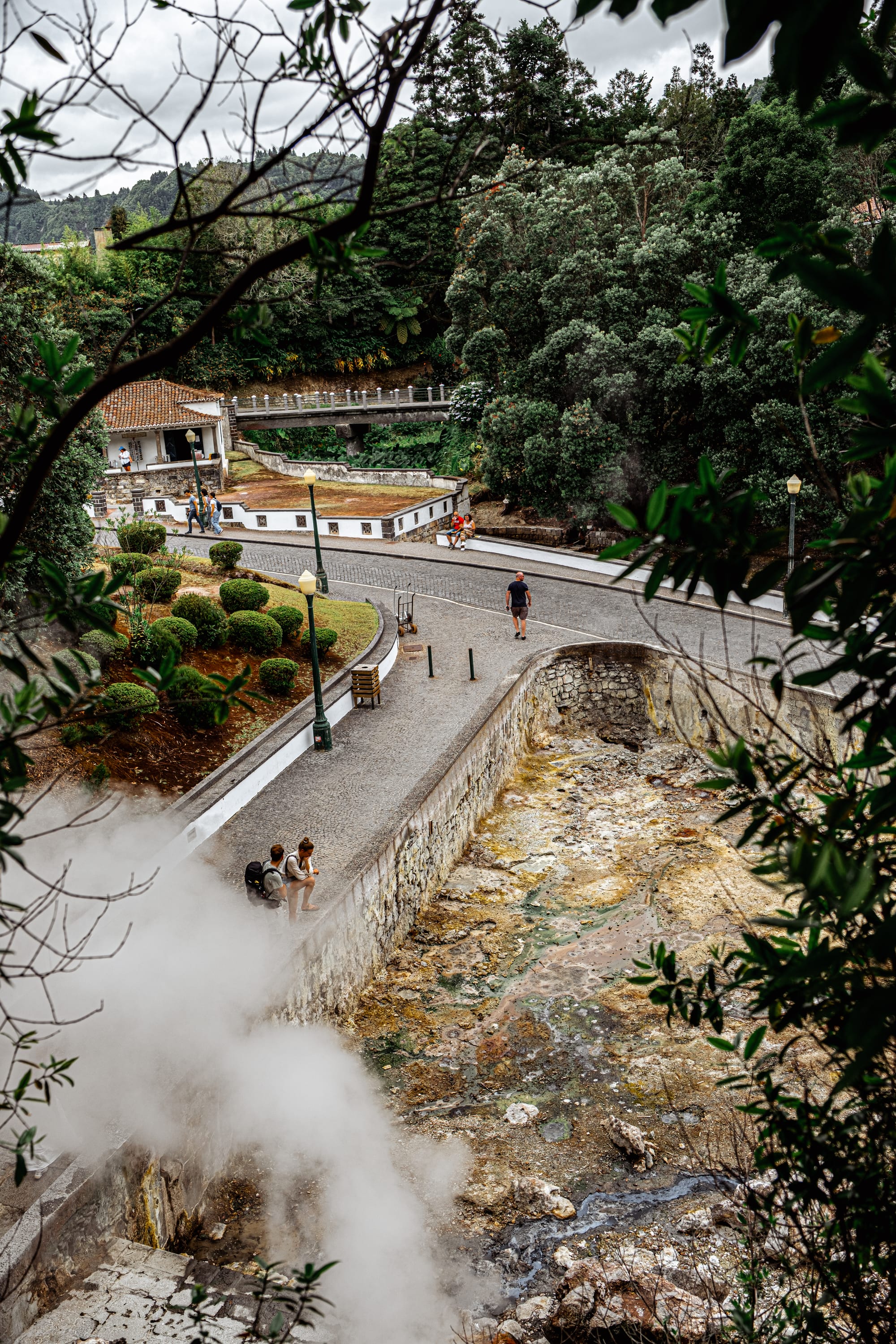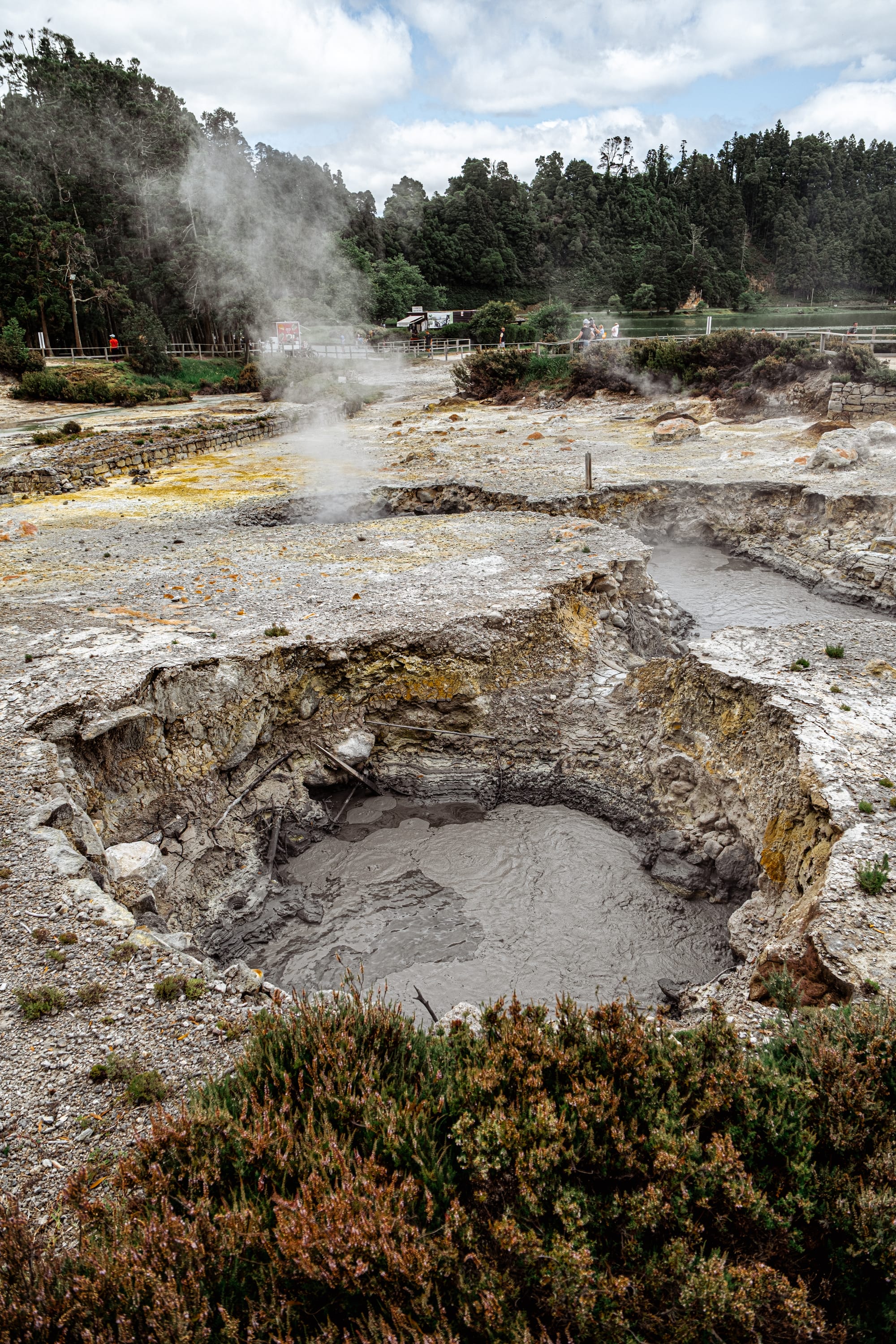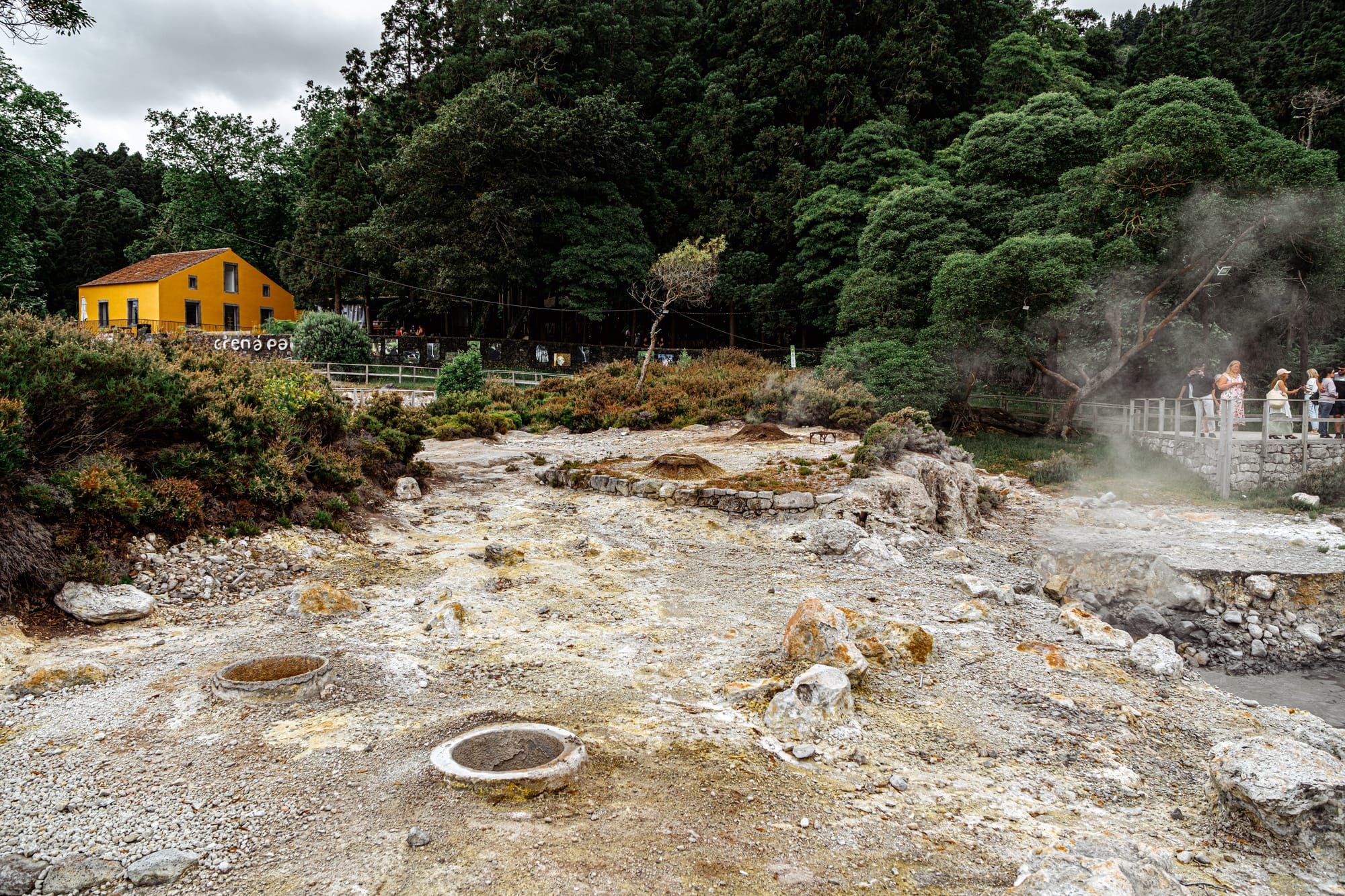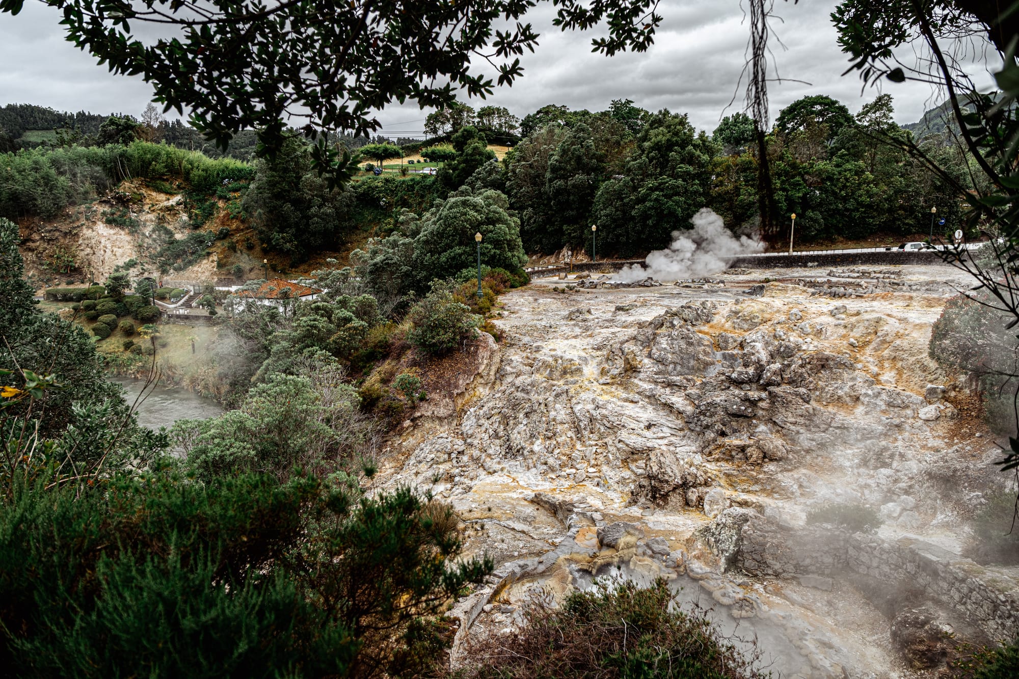 Tangled trees and thermal edges surround the caldeiras, spilling into the lakeside beyond