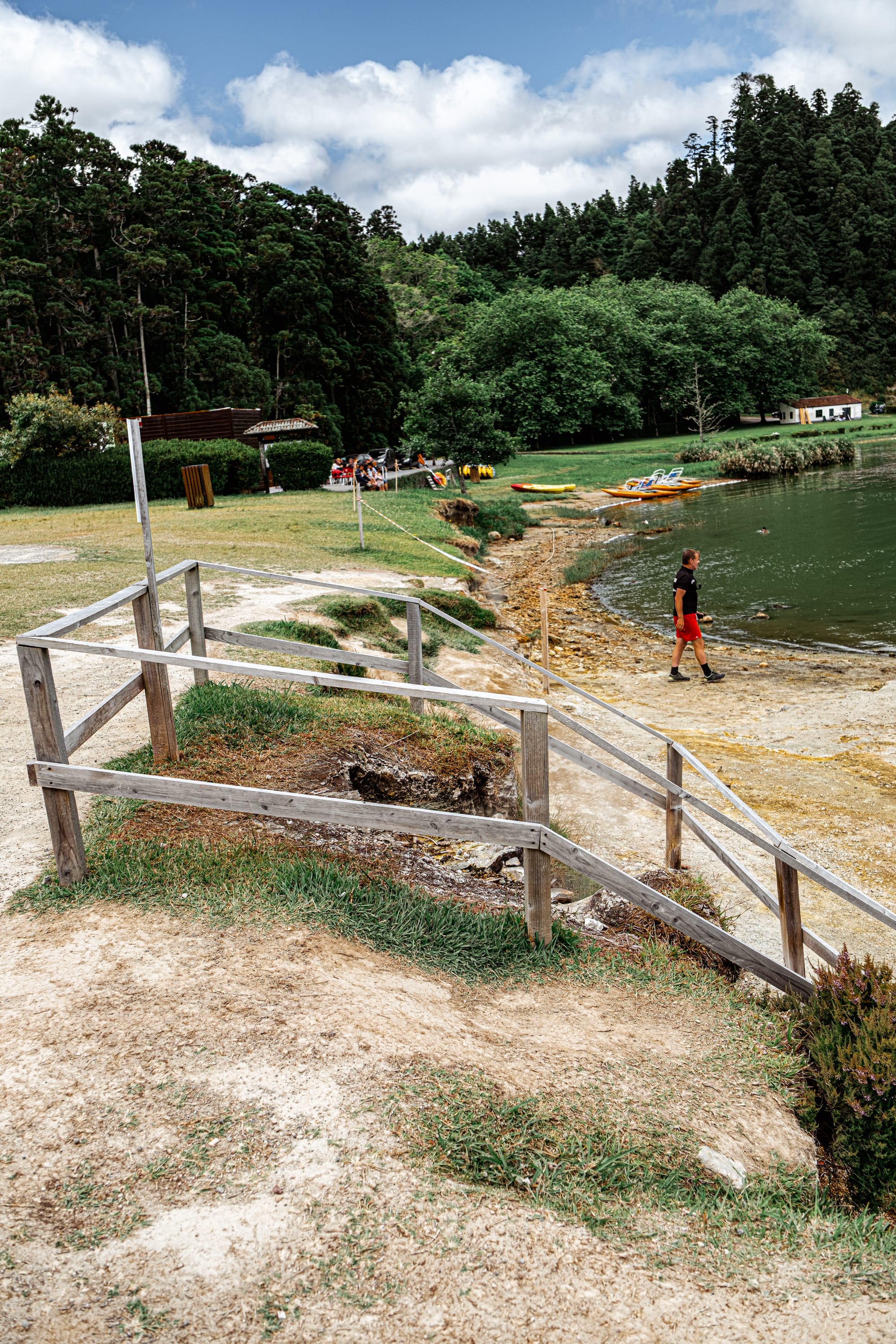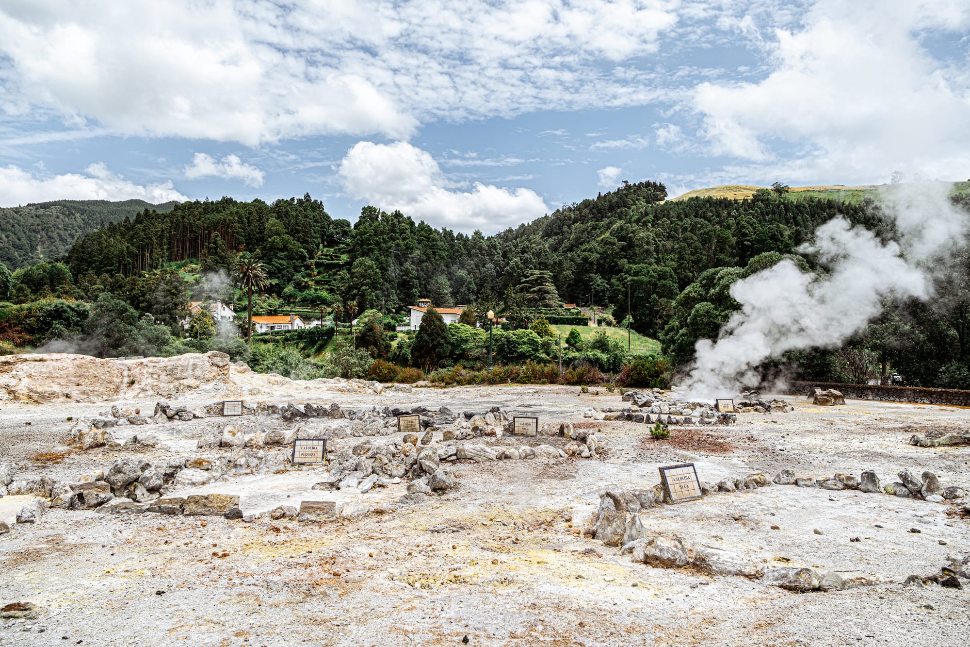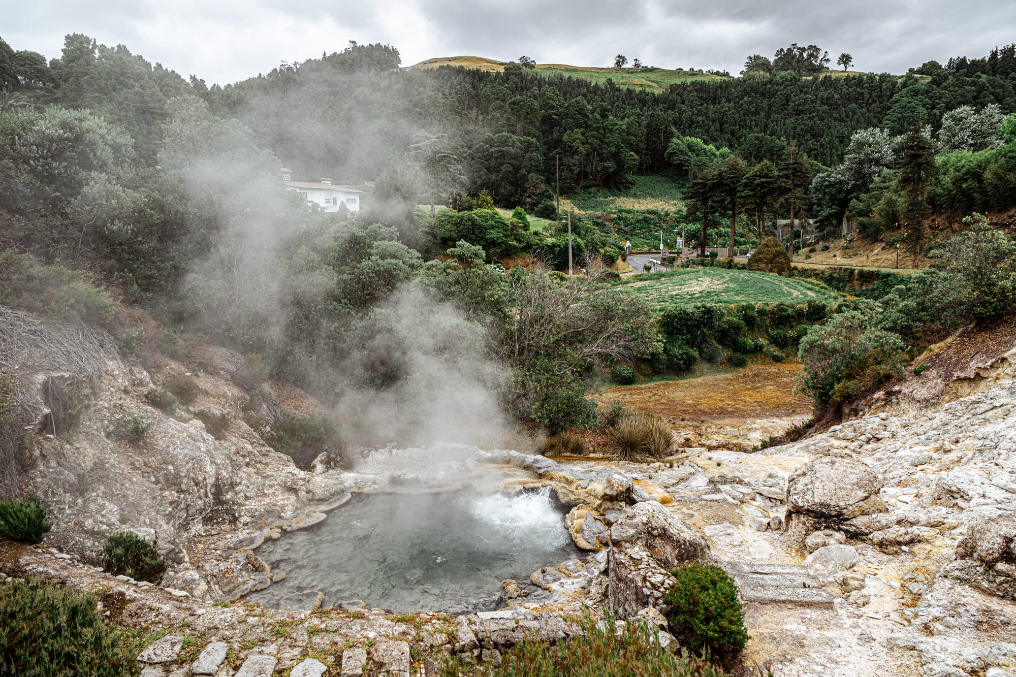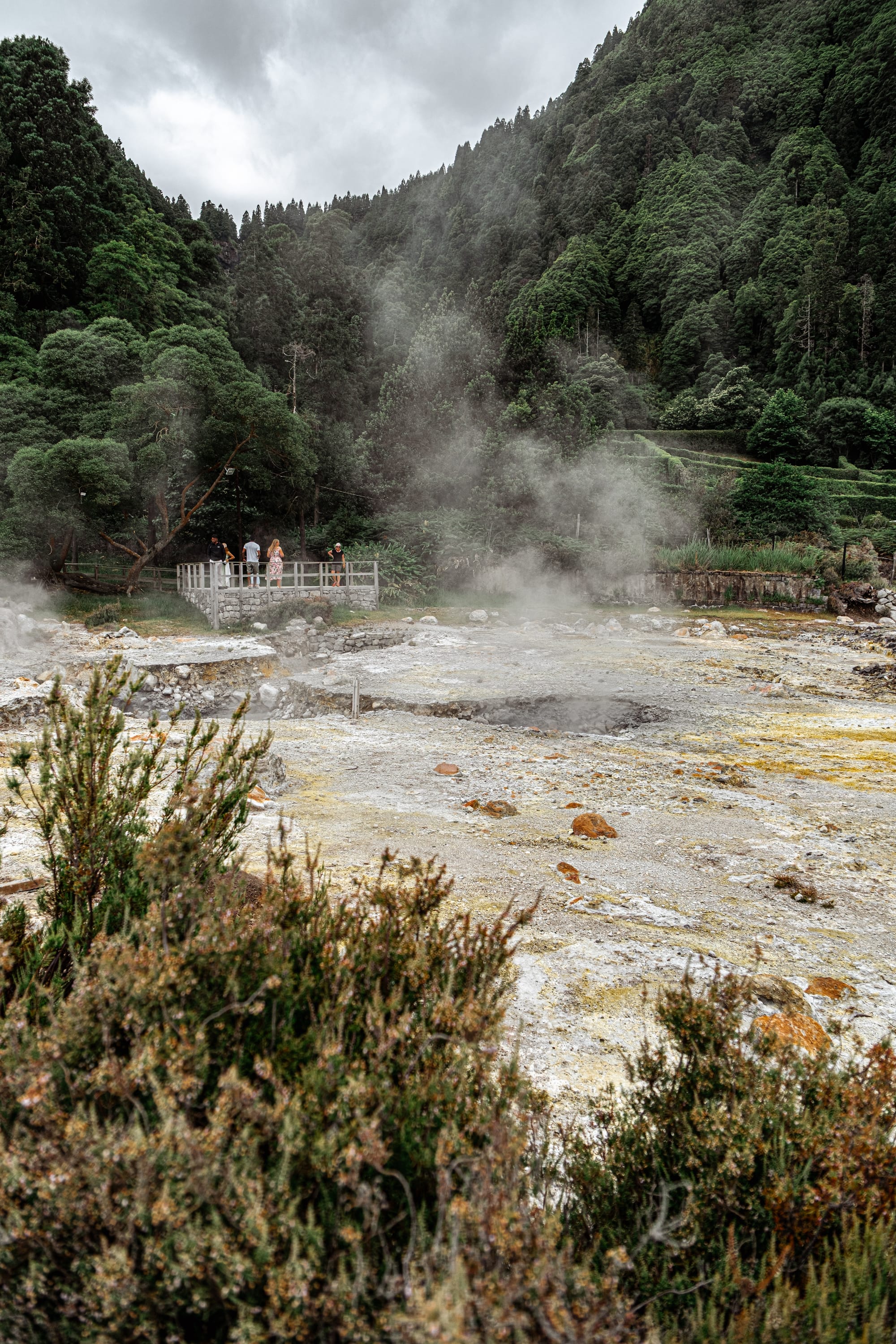 Tangled trees and thermal edges surround the caldeiras, spilling into the lakeside beyond