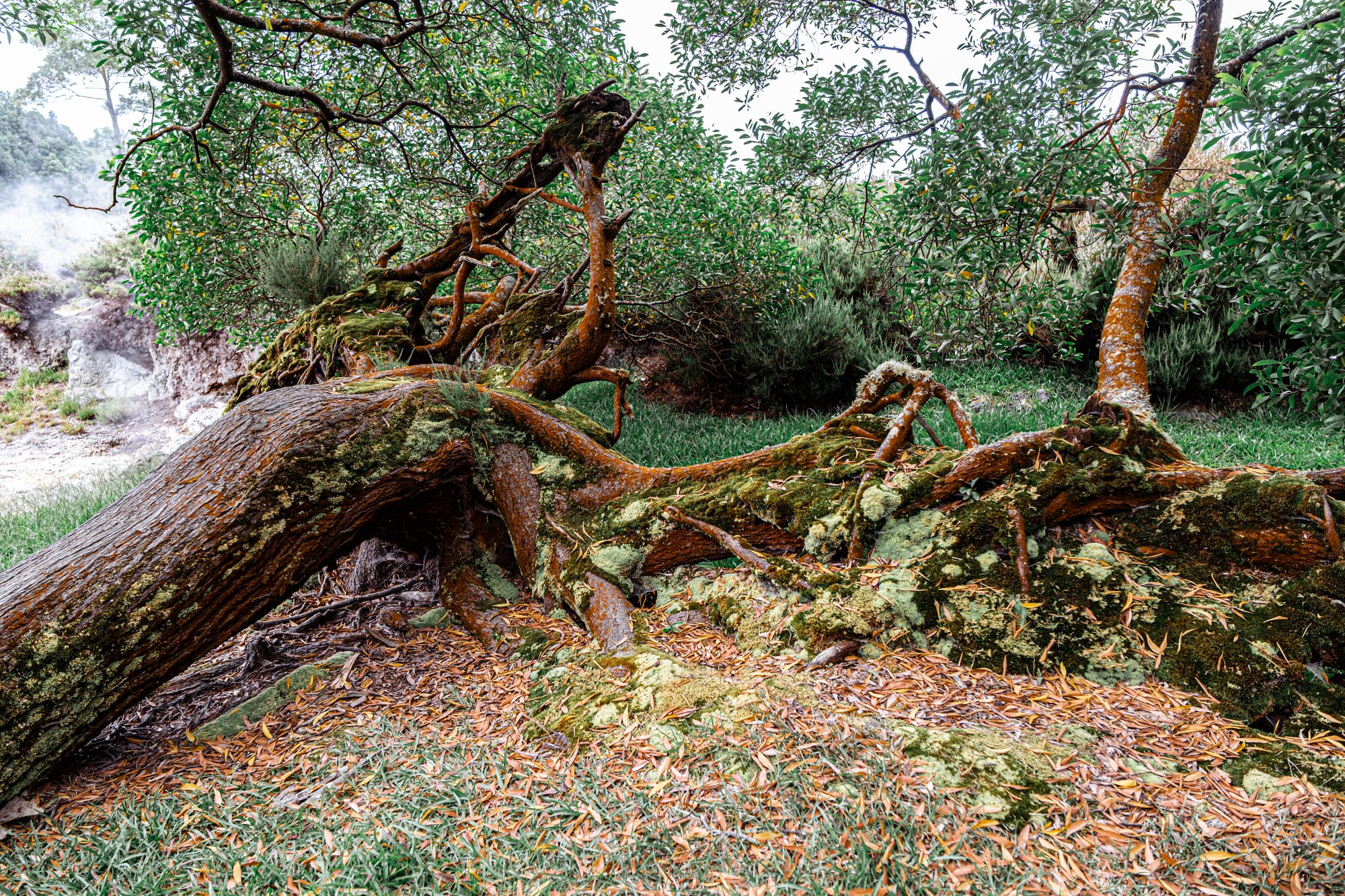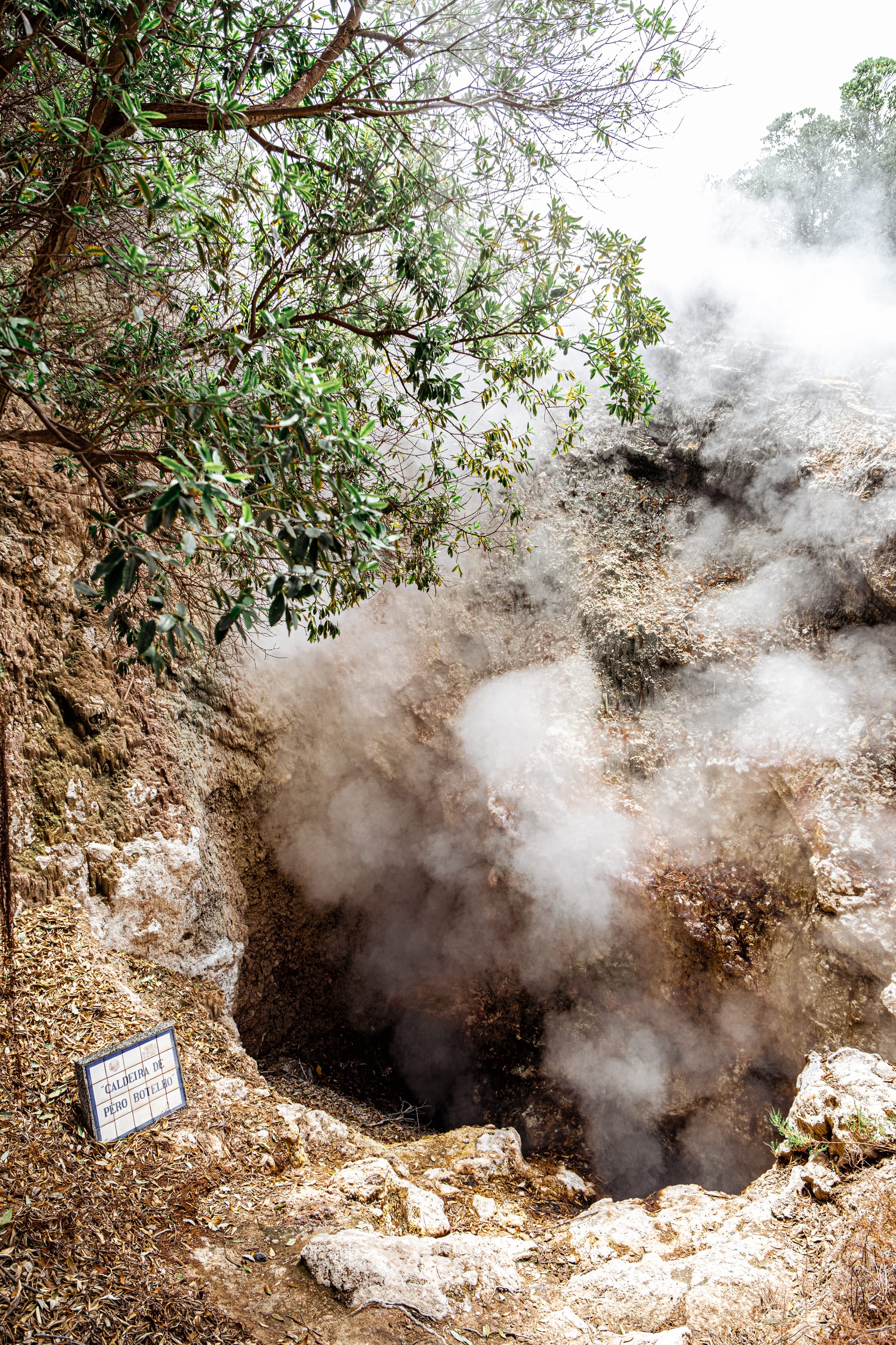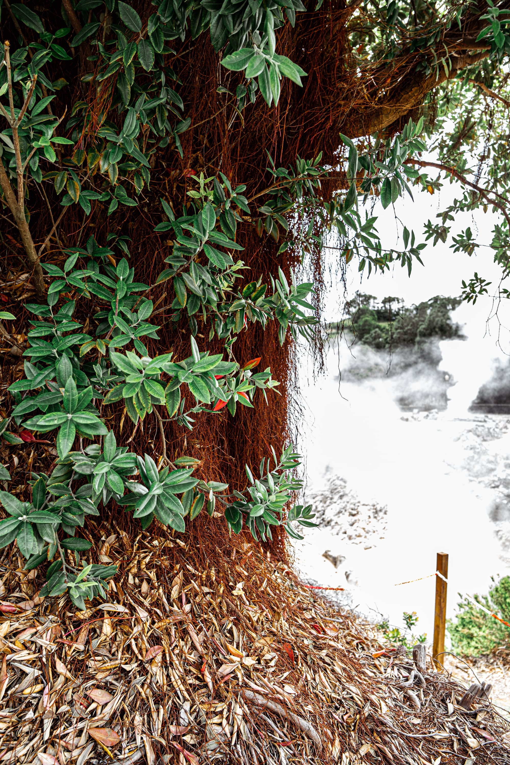 Tangled roots and rising steam frame the vivid, mineral-stained ground of the caldeiras