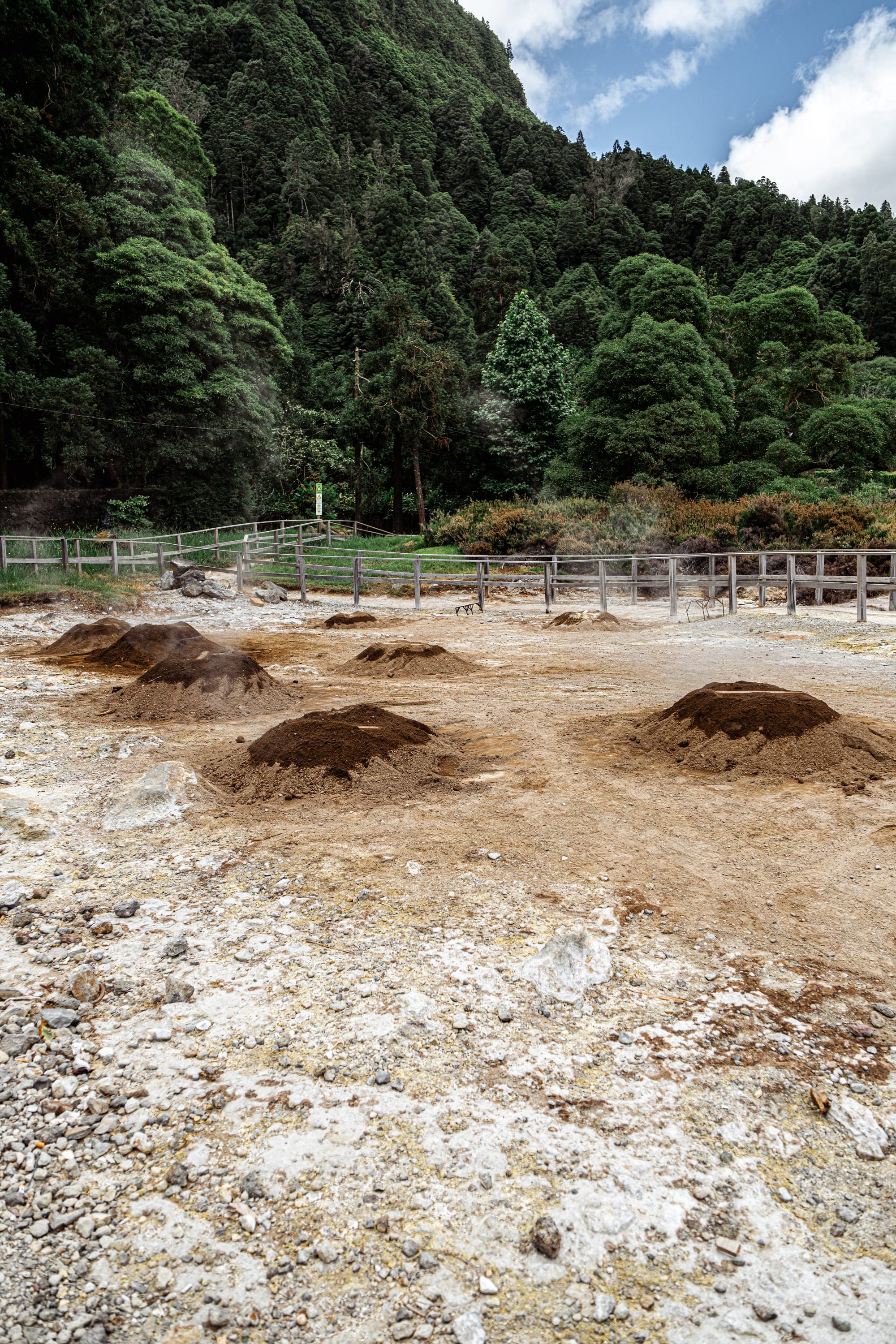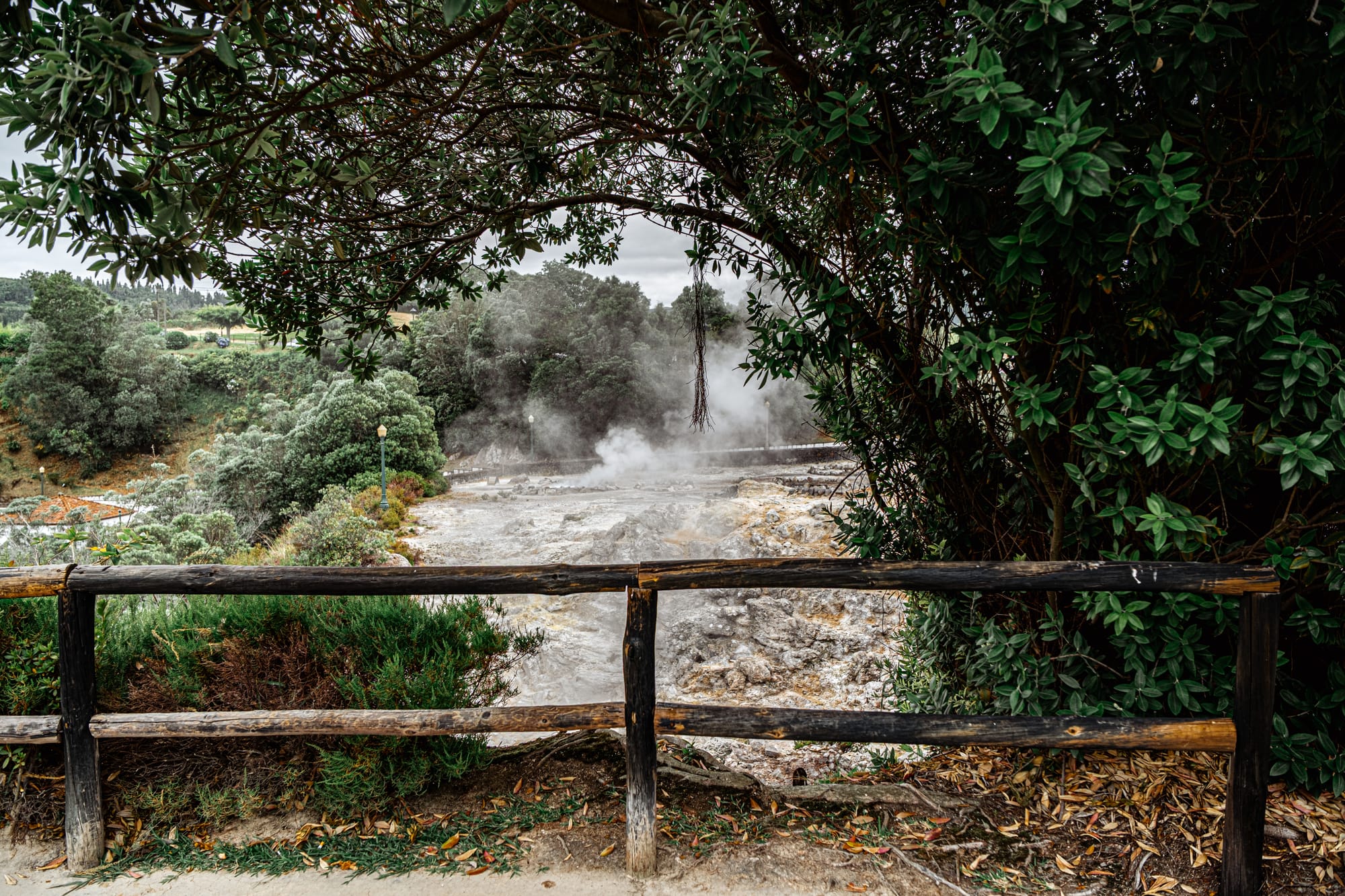 View across the steamy caldeiras, framed by trees and wooden fencing