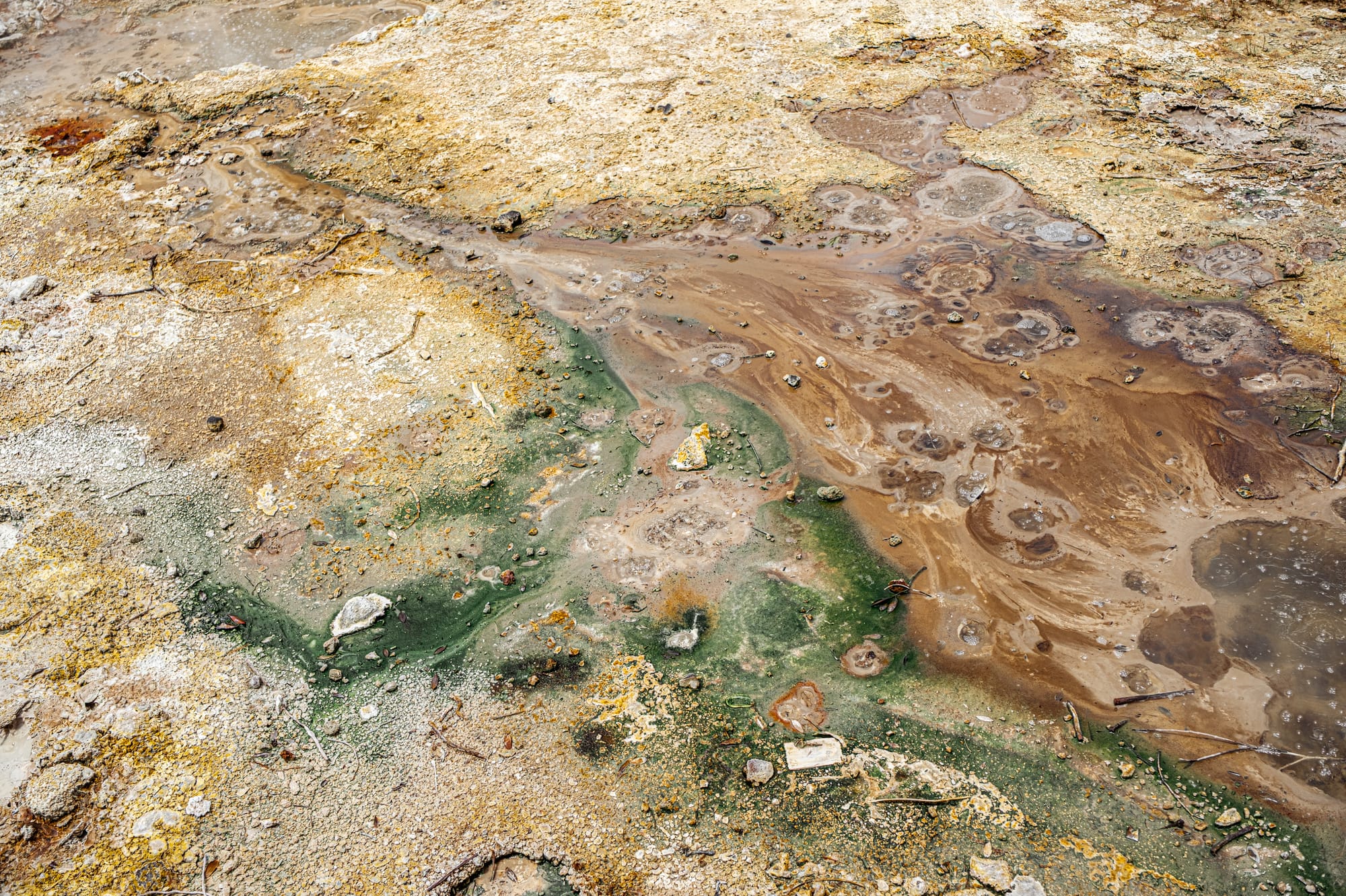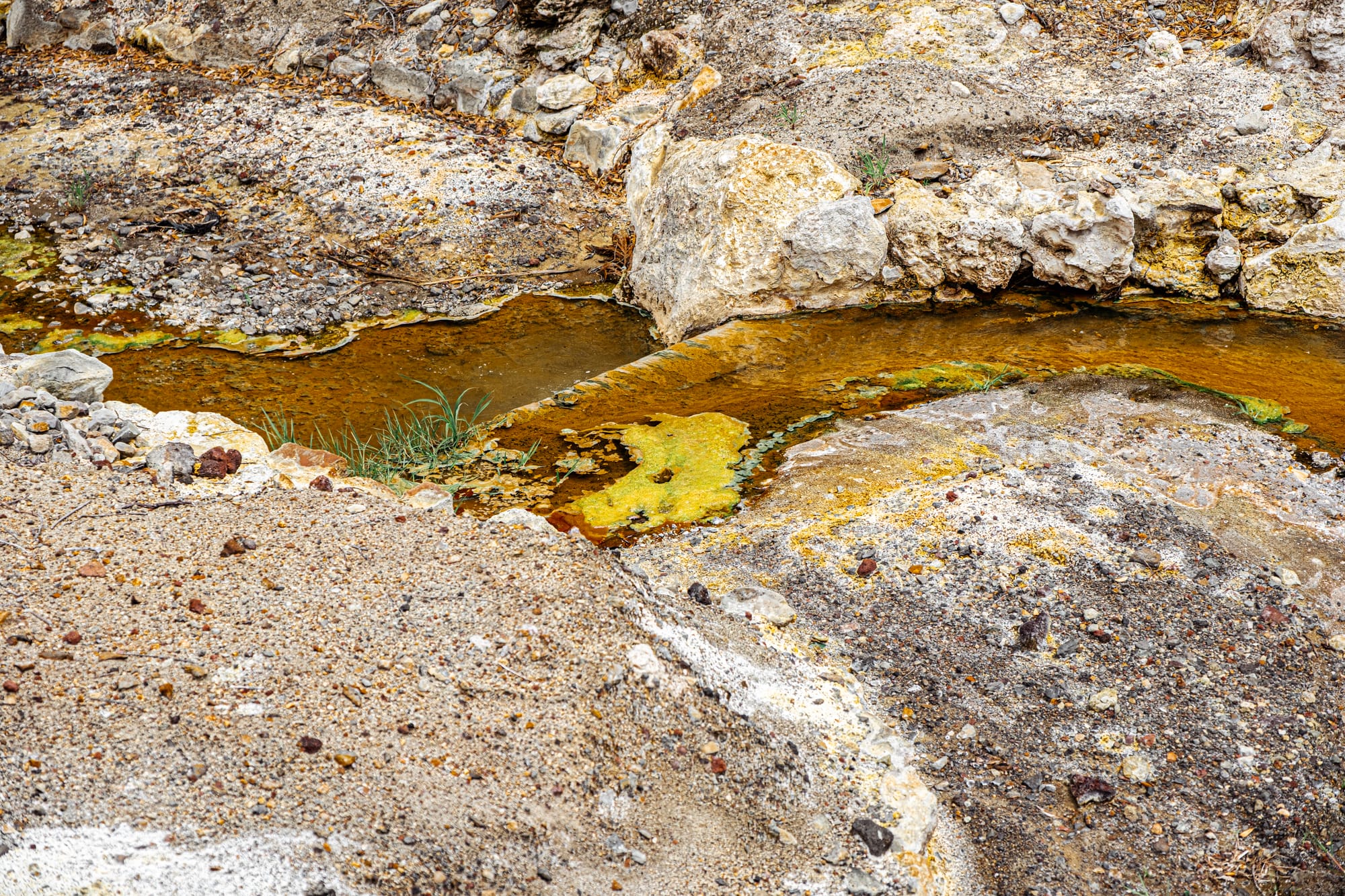 Mineral-rich ground textures where sulfur, iron, and algae meet in volcanic runoff