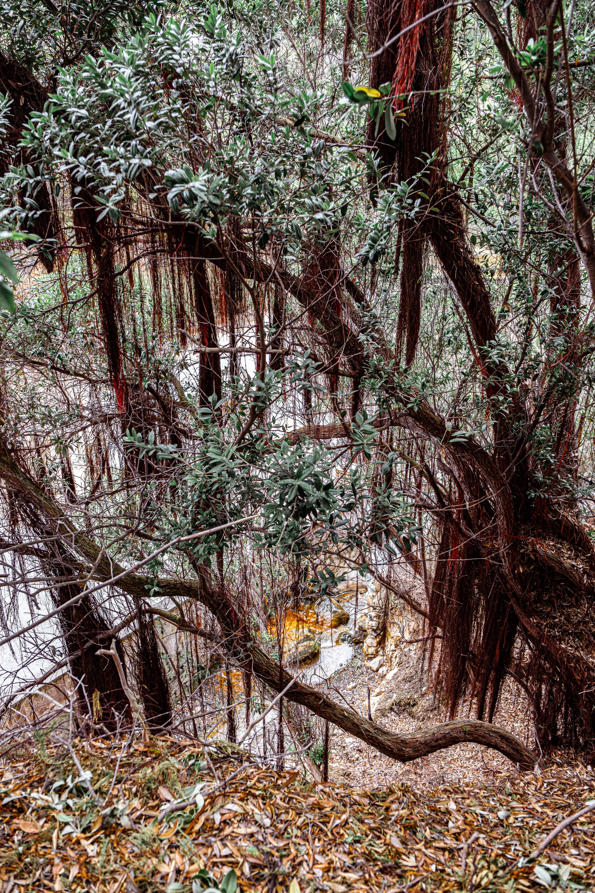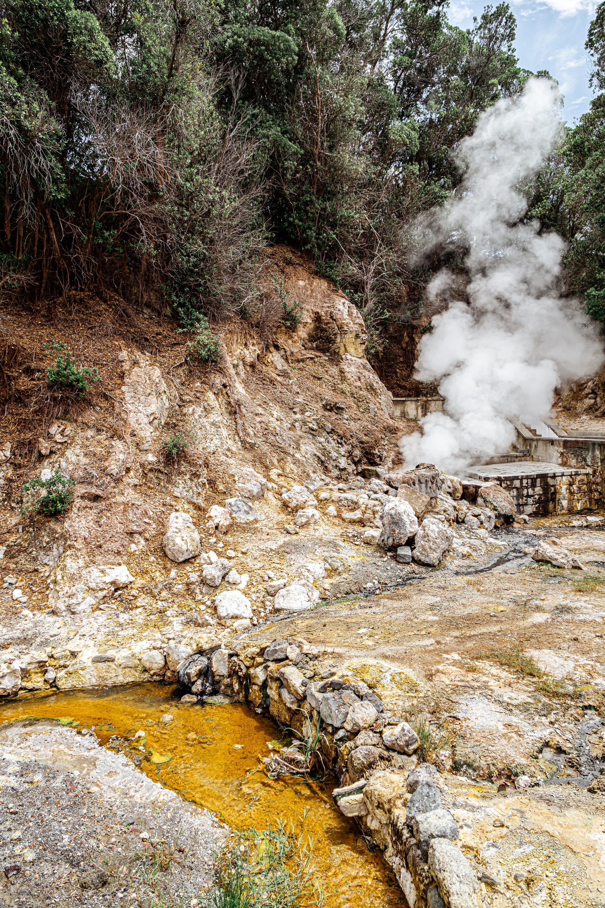 Geothermal streams winding beneath trees and through lush greenery