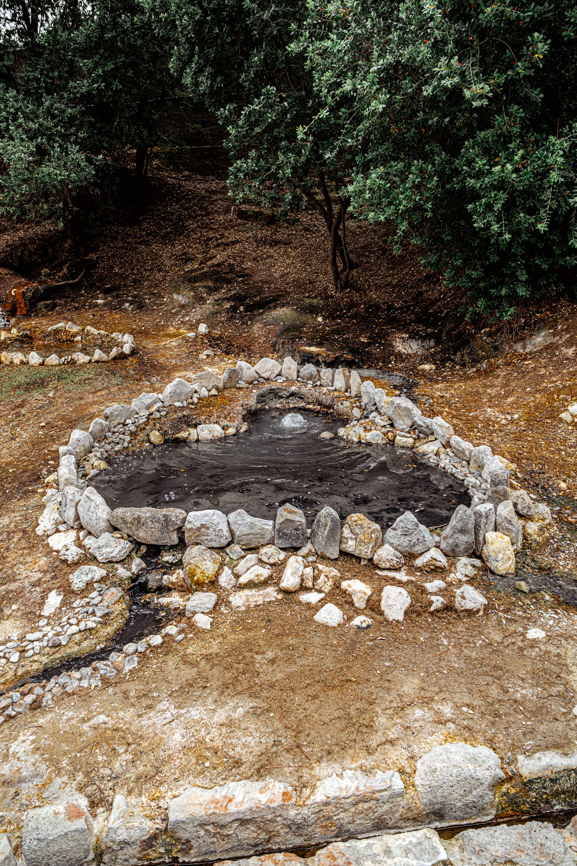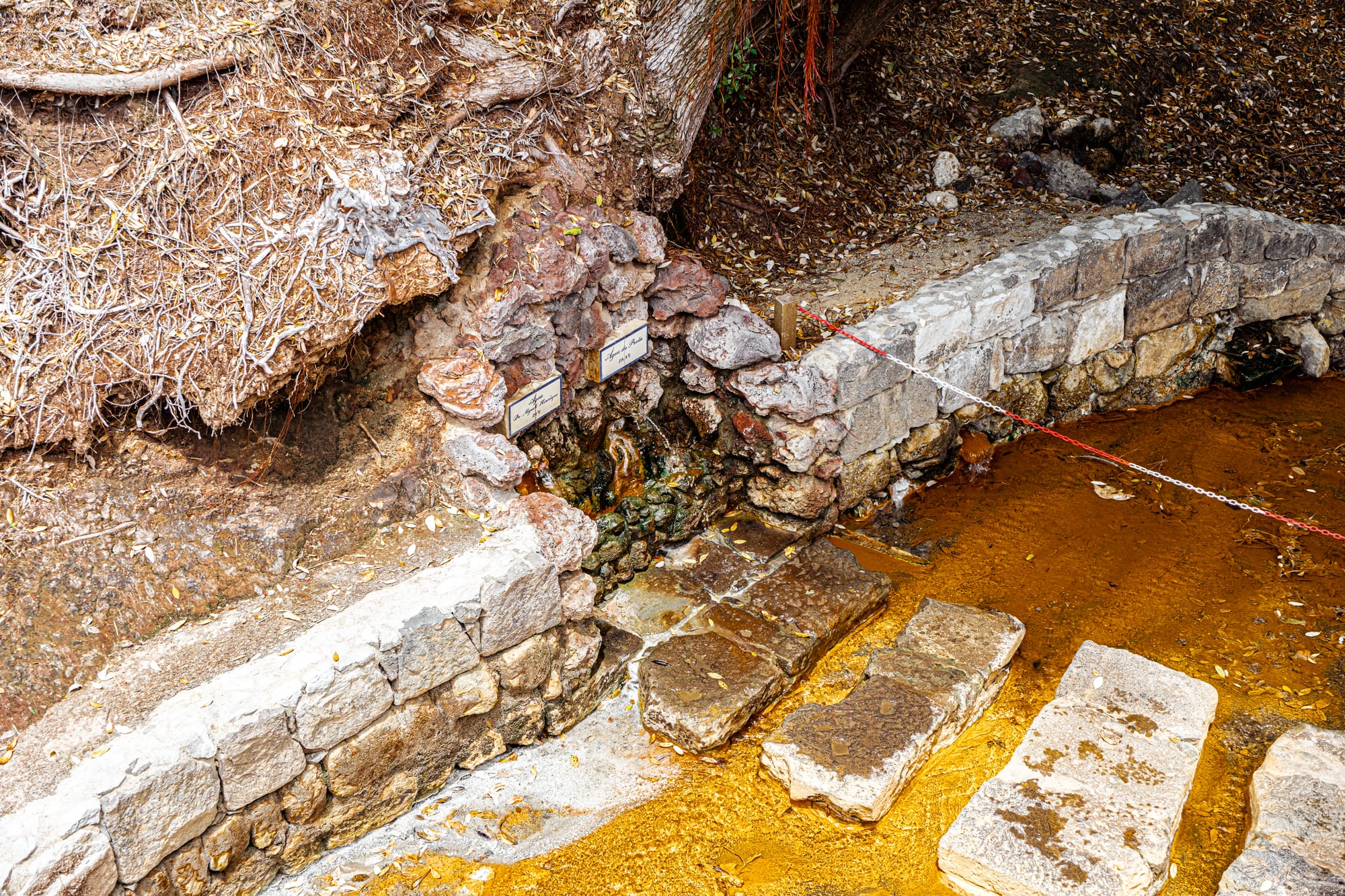 Thermal springs tucked into stonework, still flowing with mineral-rich water