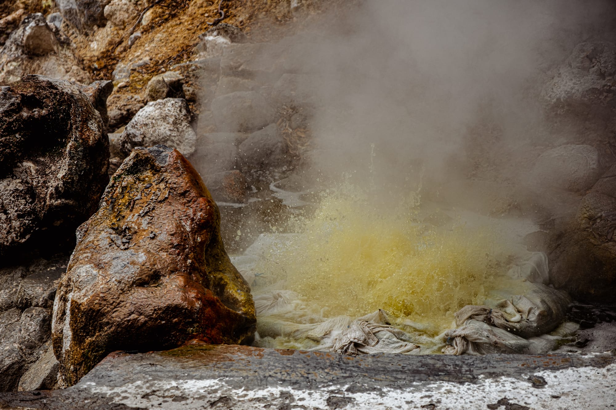 Boiling yellow sulfur springs and steaming caldeiras nestled in the hillside