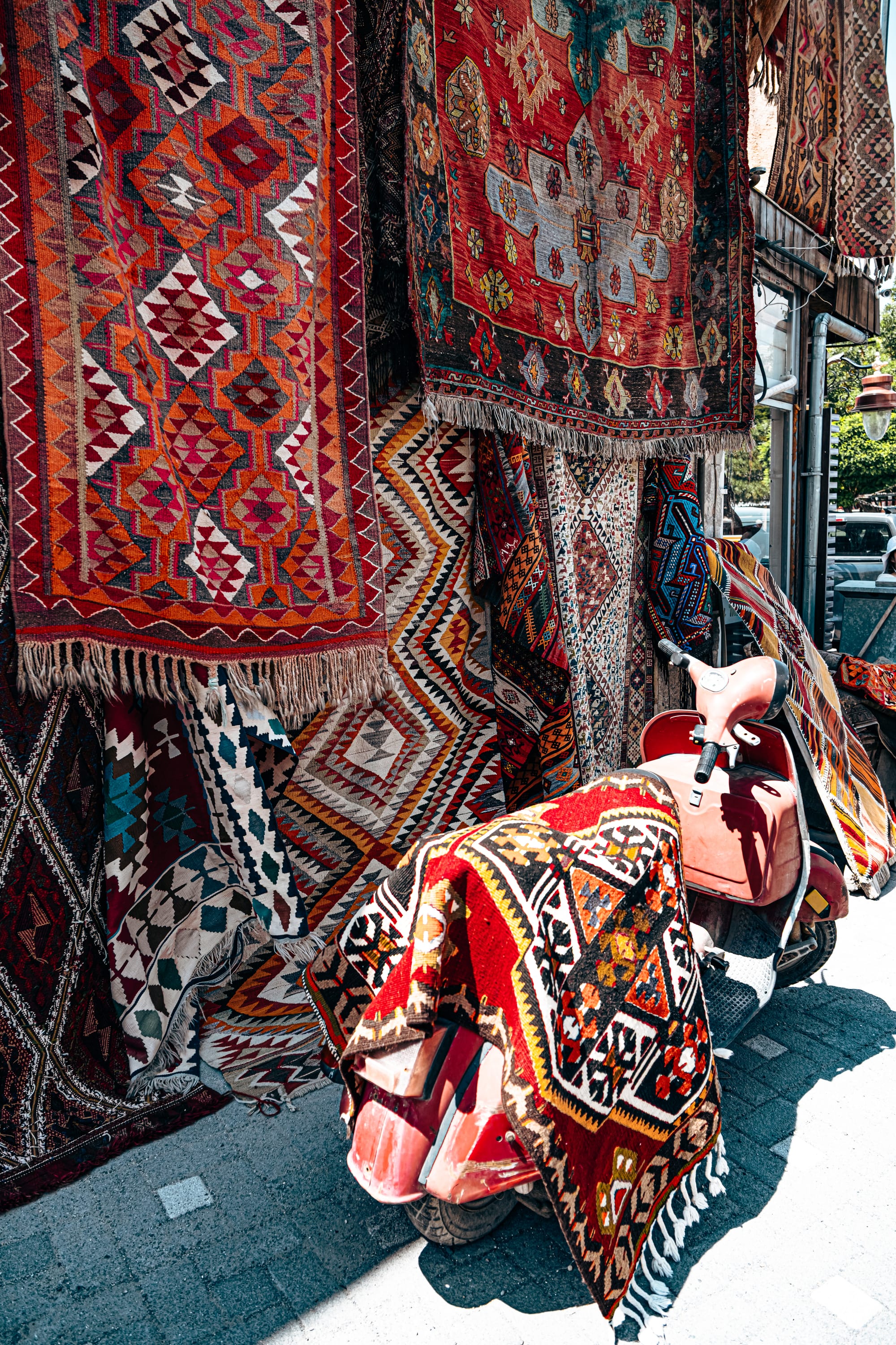 The vibrant exterior of Galerie İkman bursts with hanging Turkish rugs, drawing visitors in from the street