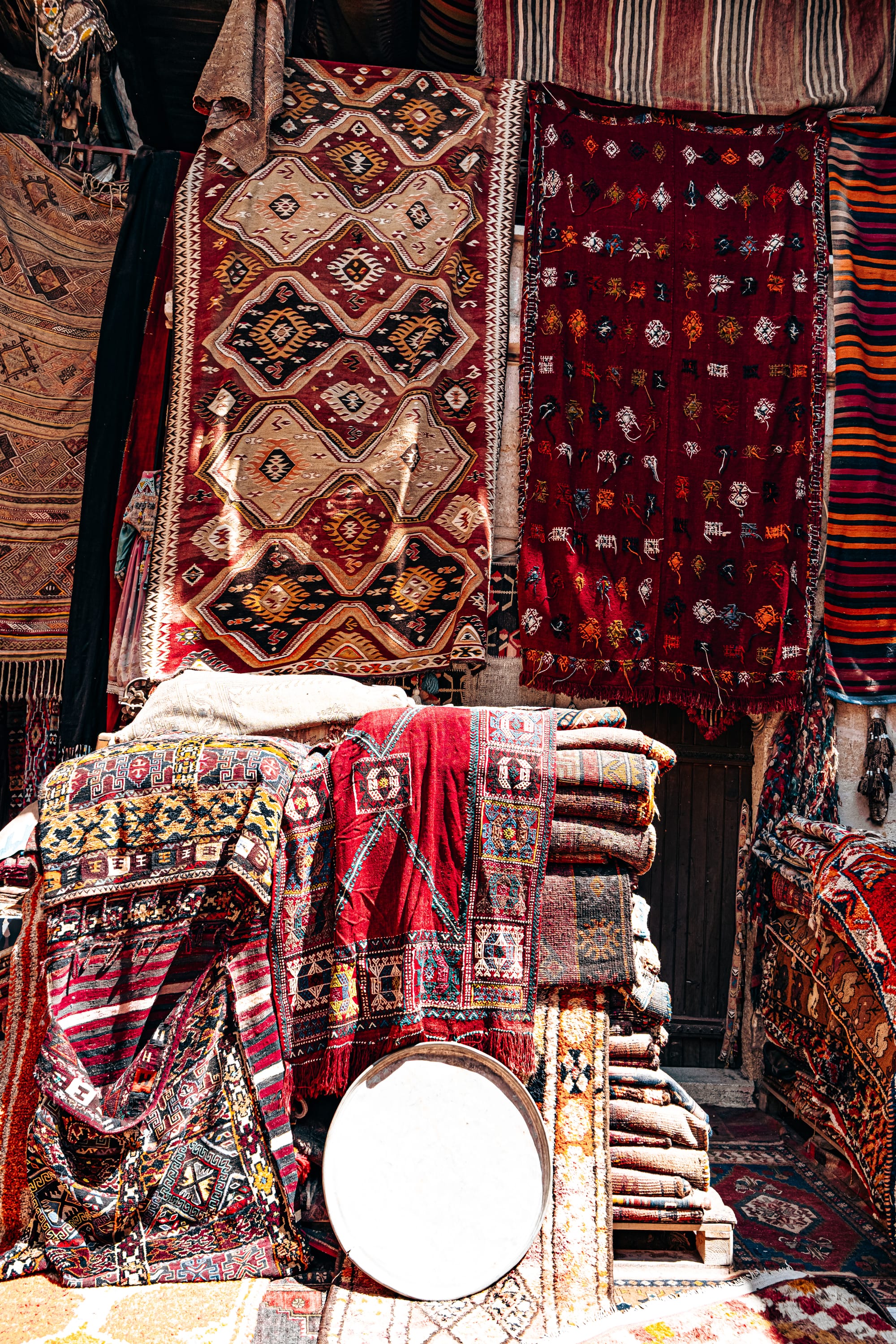 From the moment you step inside, you’re surrounded by an explosion of intricate patterns and rich colors. Rugs of every size and design drape from the walls and ceilings, cascade over staircases, and cover the floors, creating a layered tapestry of visual interest. Handwoven kilims, ornate carpets, and antique textiles blend seamlessly with decorative items like copperware, woven baskets, stringed instruments, and ceramic pots.