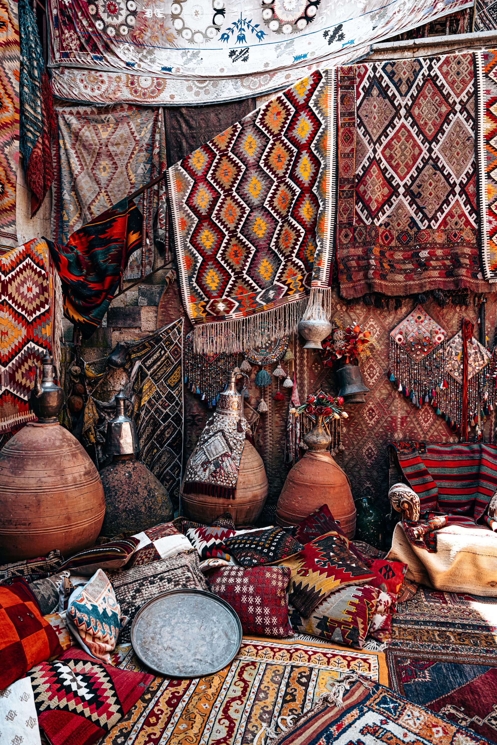 A display at Galerie İkman in Göreme featuring patterned rugs, colorful kilim pillows, large clay vessels with metal tops, woven wall hangings, and a round metal tray, arranged in a dense and vibrant composition