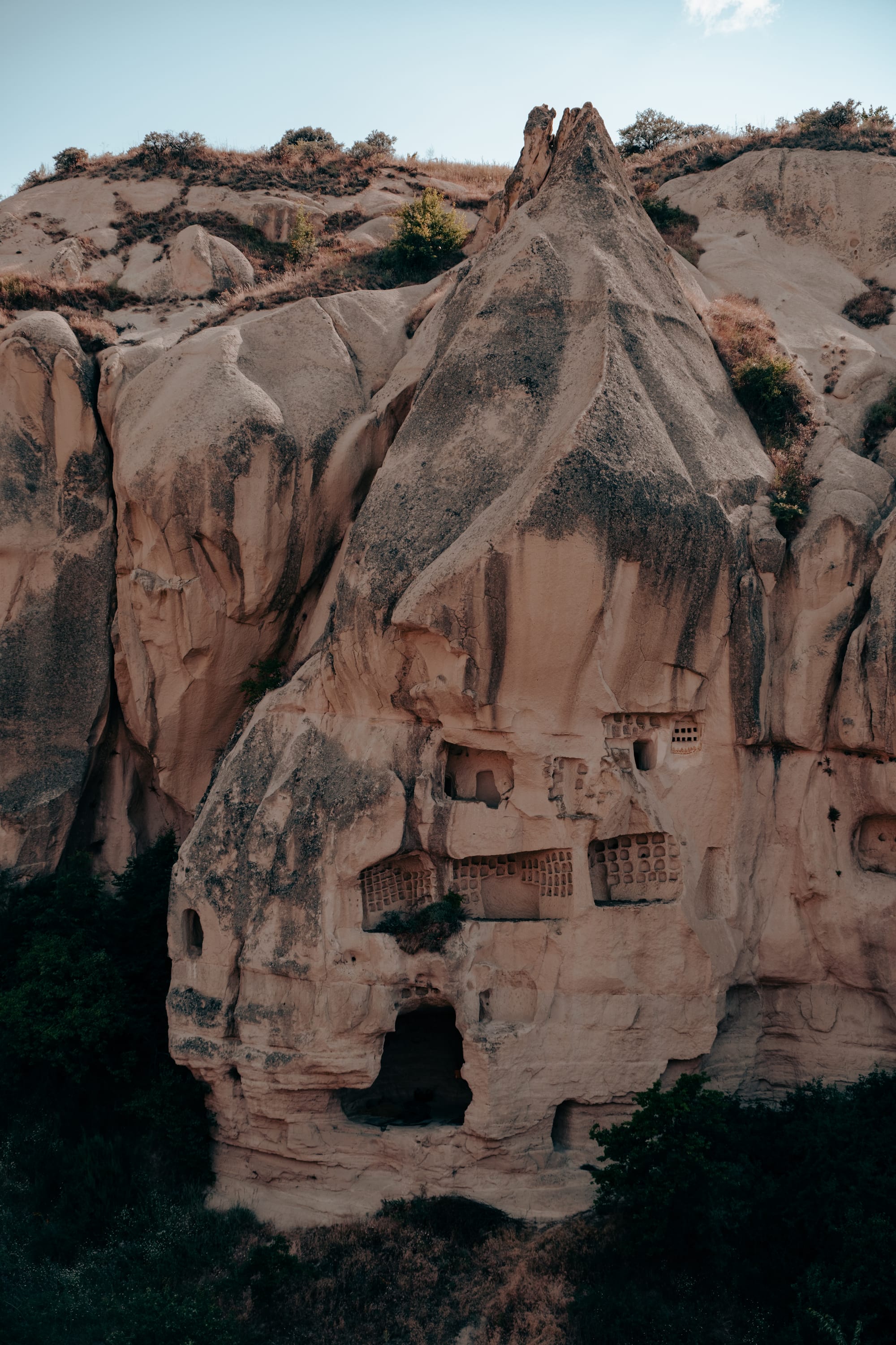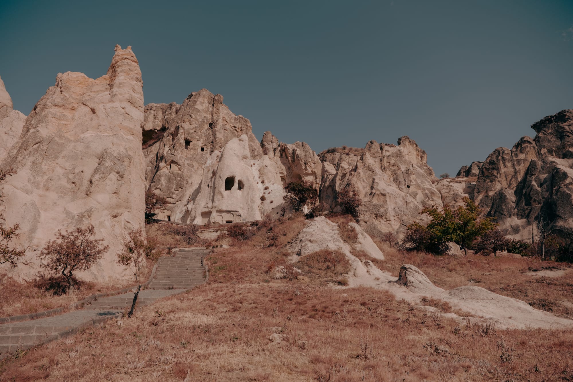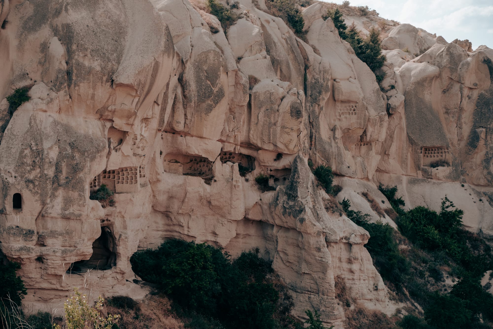 Rock formations with multiple carved cave entrances and dwellings at Göreme Open Air Museum in Cappadocia