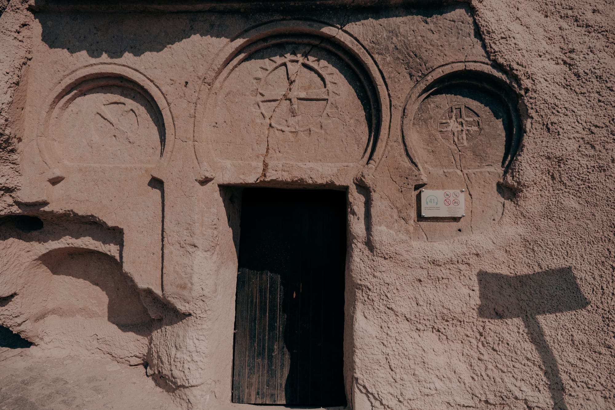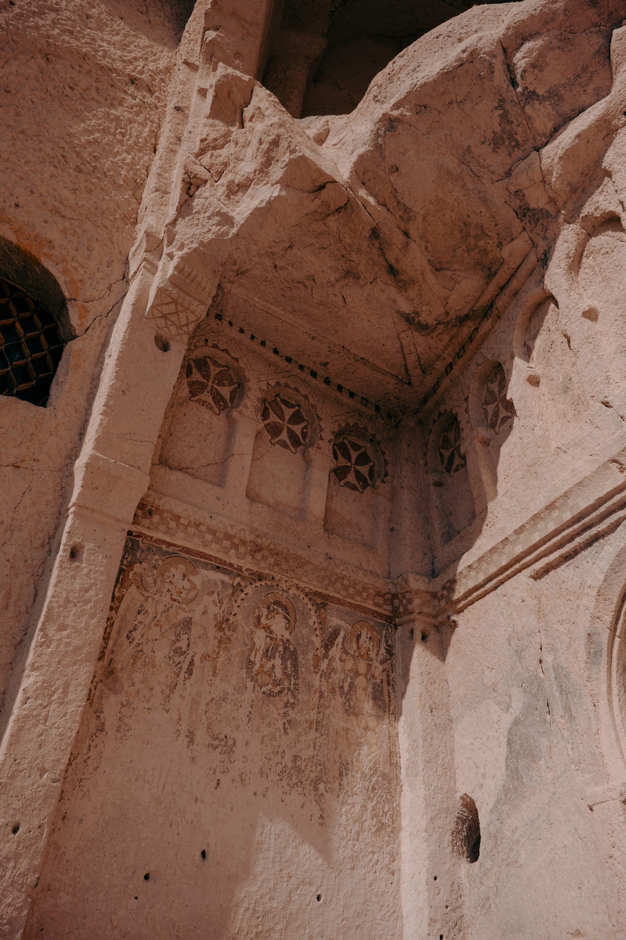 Carved with simple red ochre patterns, this 11th-century chapel reflects symbolic art of the early Byzantine period.