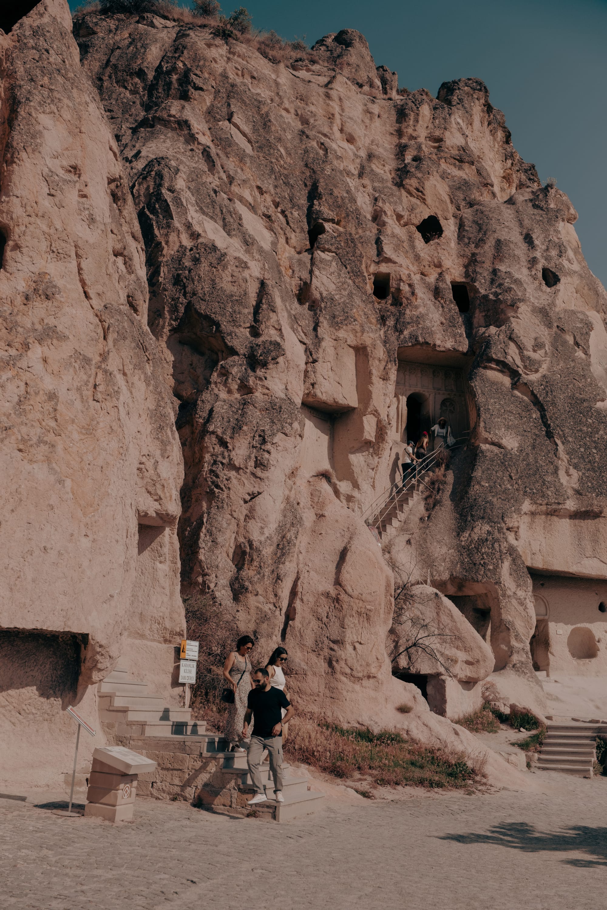 Two visitors stand outside a rock-carved entrance at Göreme Open Air Museum, showcasing its ancient architecture