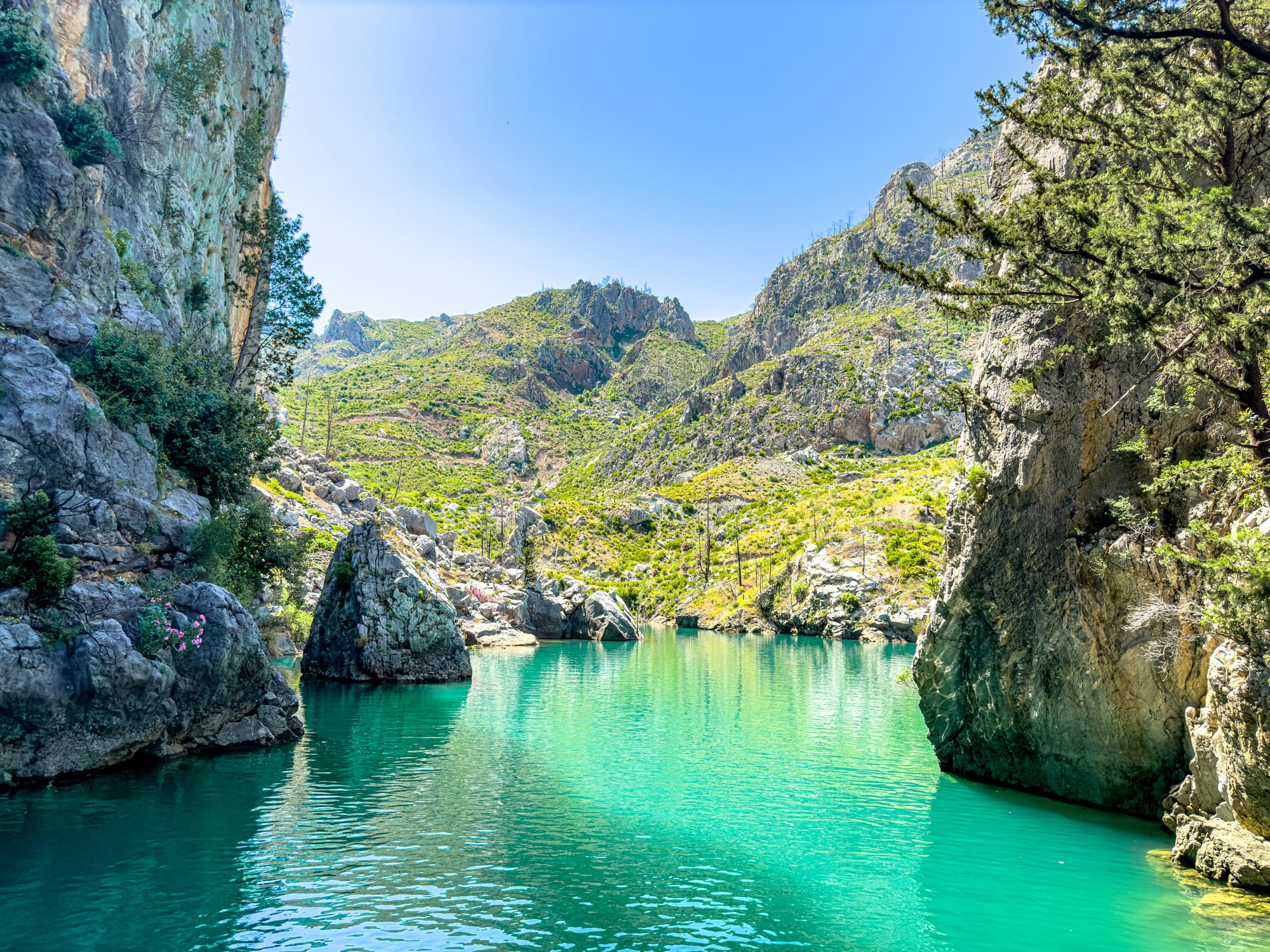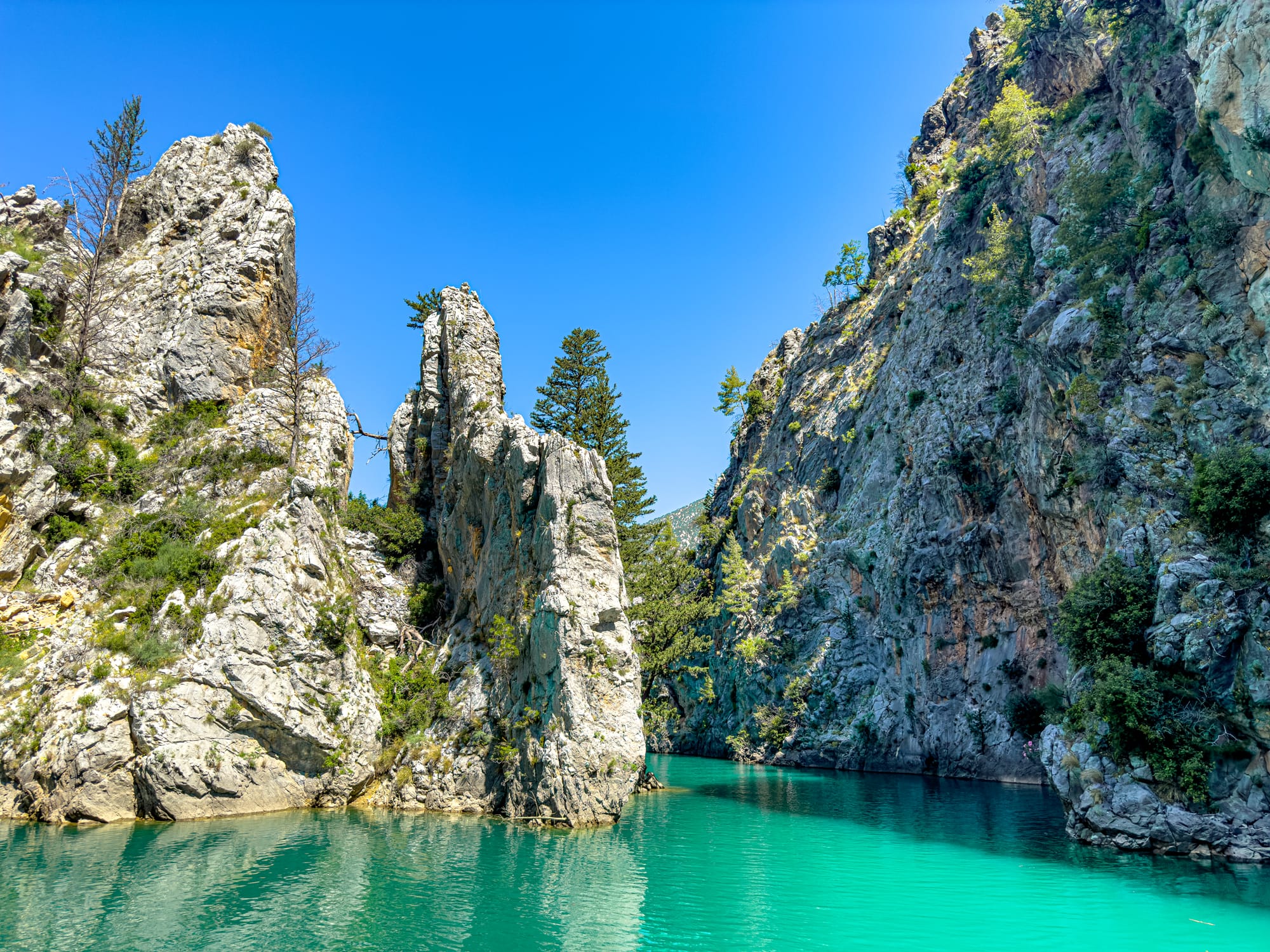 The Green Canyon is part of a unique ecosystem. Its shores are lined with stone pines, junipers, and wild olives. In spring and early summer, bursts of pink oleander bloom near the waterline. The cliffs are home to eagles and falcons, while turtles and waterfowl often circle the boat, unbothered by its slow drift.