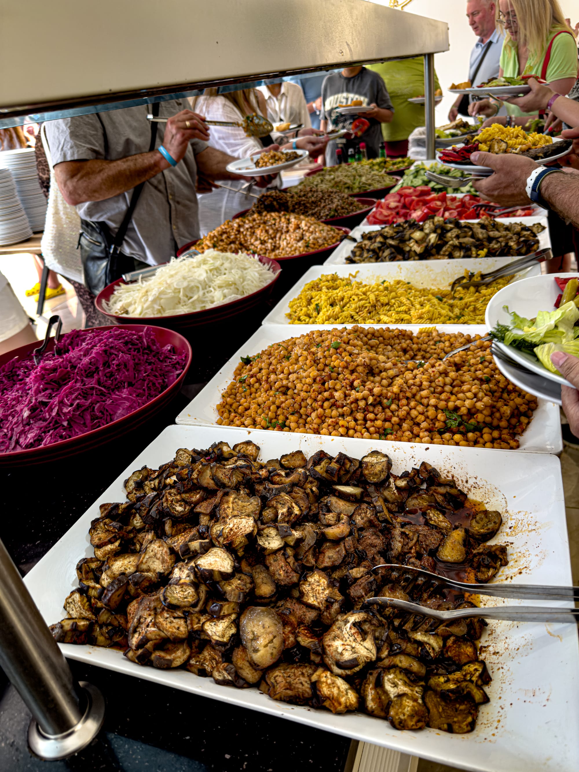 Midway through the tour, the boat docks at a restaurant overlooking the canyon. You disembark and walk into a breezy covered patio with sweeping views of the water below. The buffet-style lunch is a pleasant surprise: fresh vegetables, lentil dishes, bulgur salads, grilled mushrooms, olive oil dips, pickles, and fruit. While fish and meat are available, the array of plant-based options is generous and satisfying.