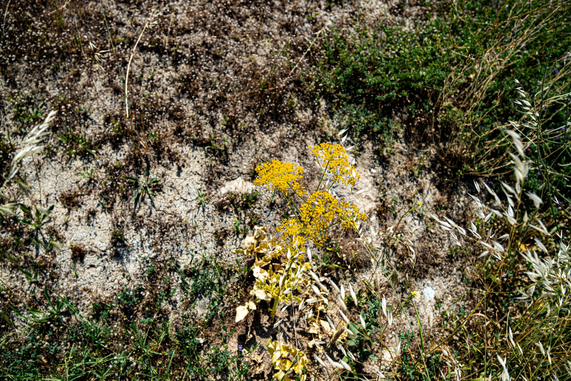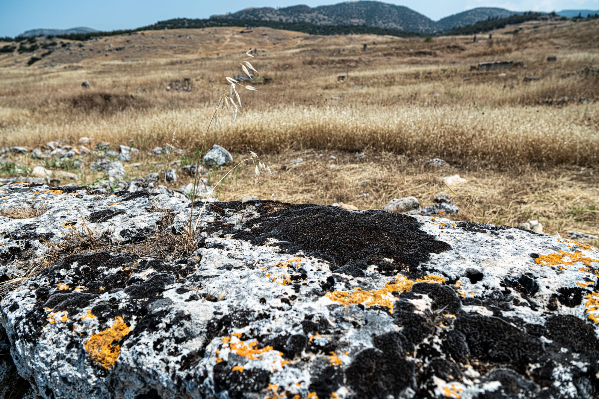 Wildflowers, lichen, and sun-bleached grasses grow freely between the ruins of Hierapolis