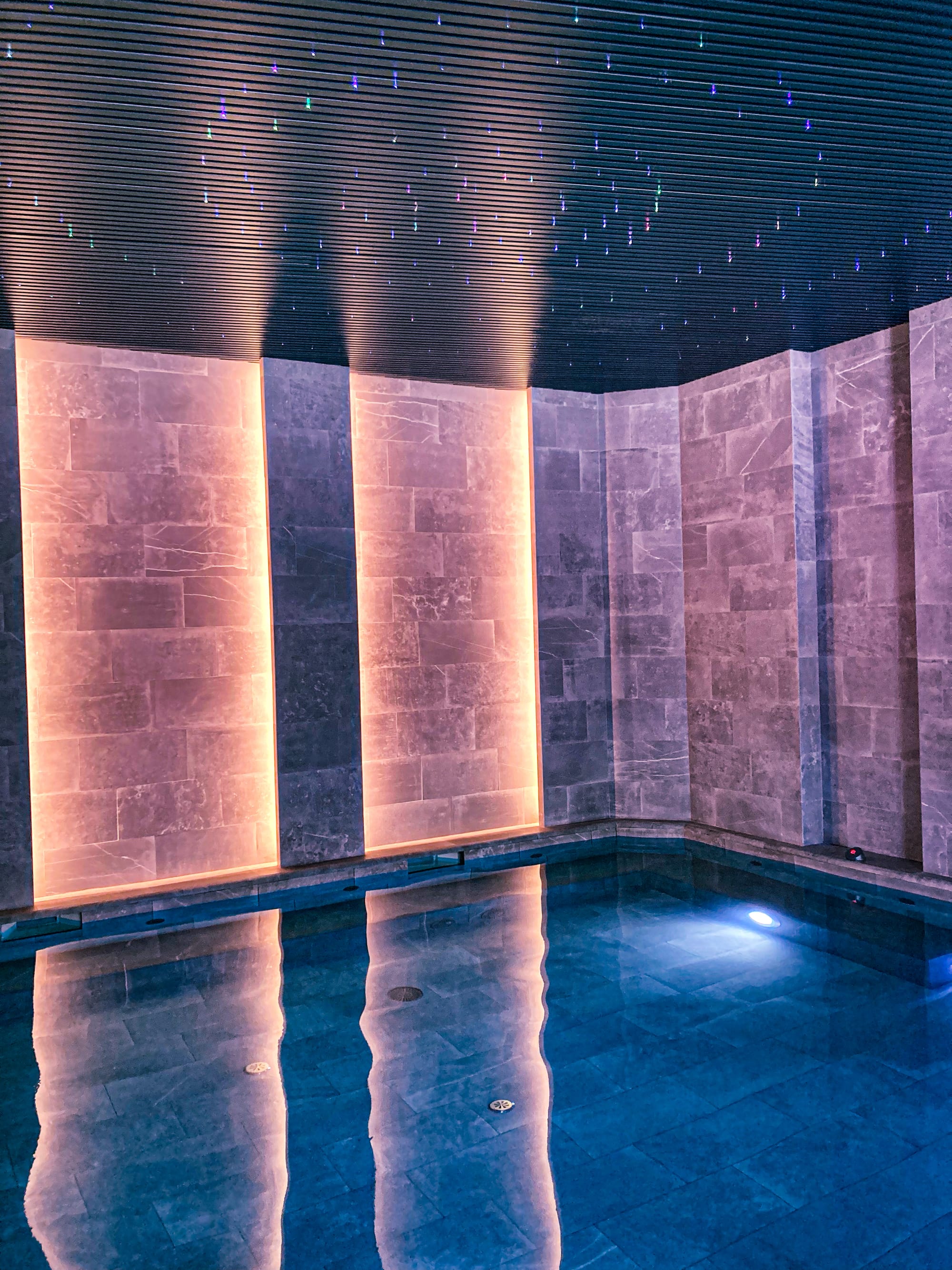Just as restorative are the tiled heated loungers. They’re contoured to the body and warmed to just above body temperature, making them a perfect place to rest between circuits of pool and sauna.