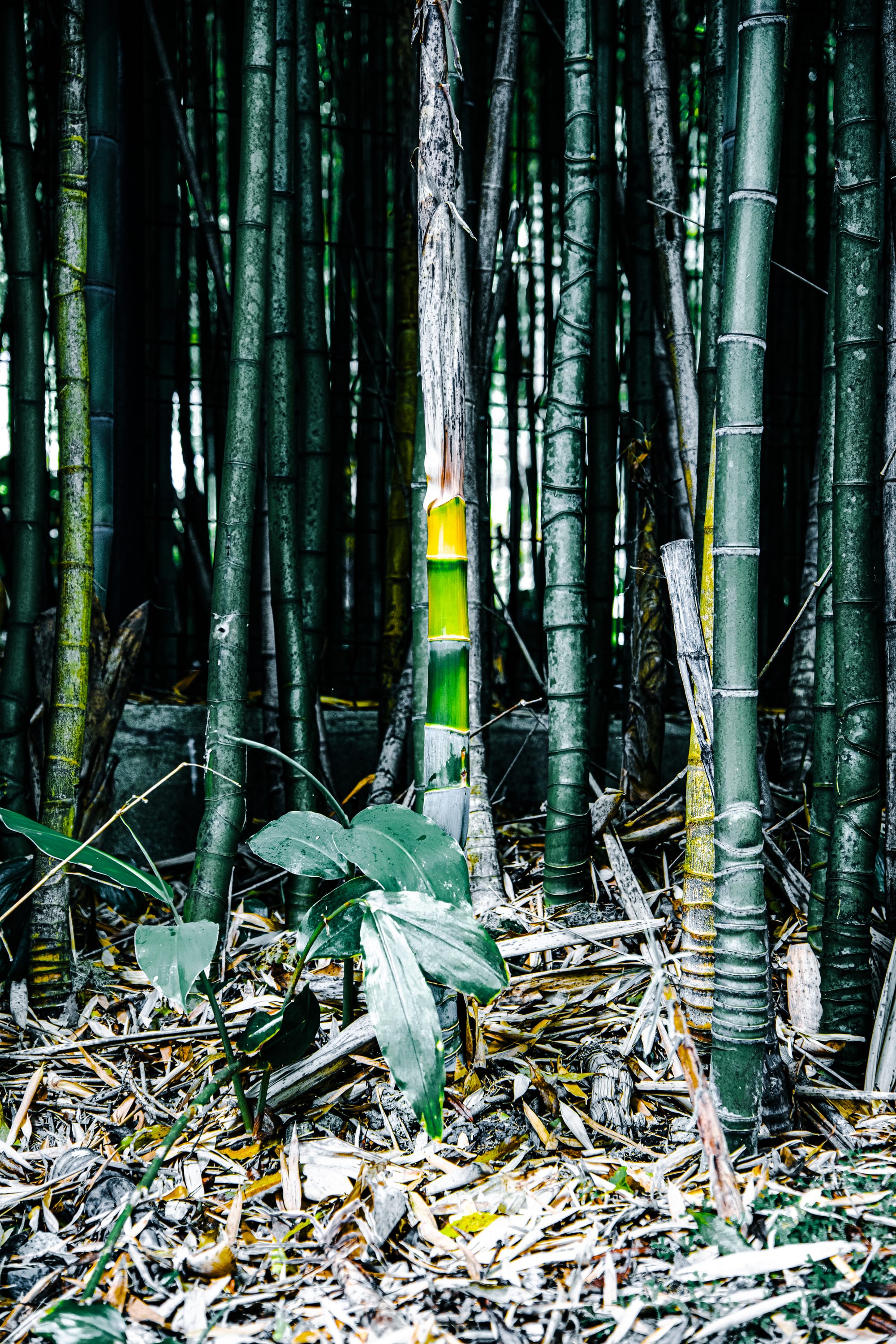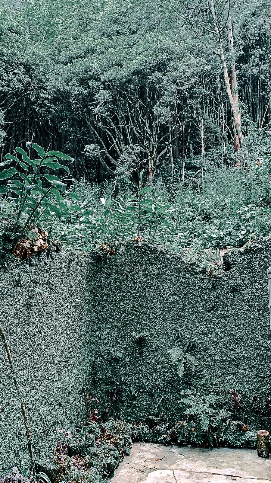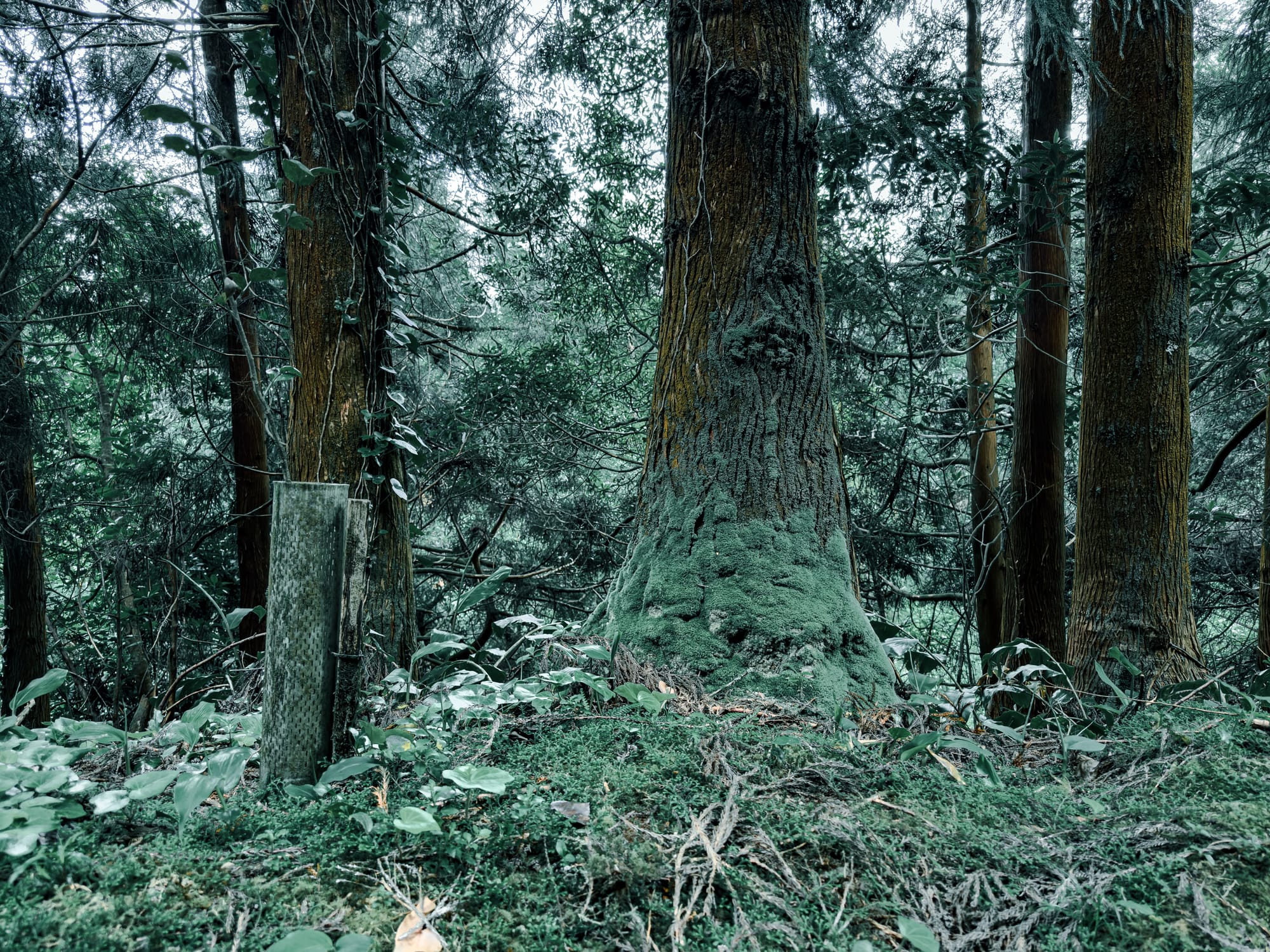 Photos capture this well: dark greens, angular shadows, the kind of filtered light that makes even a simple tree trunk feel sculptural.