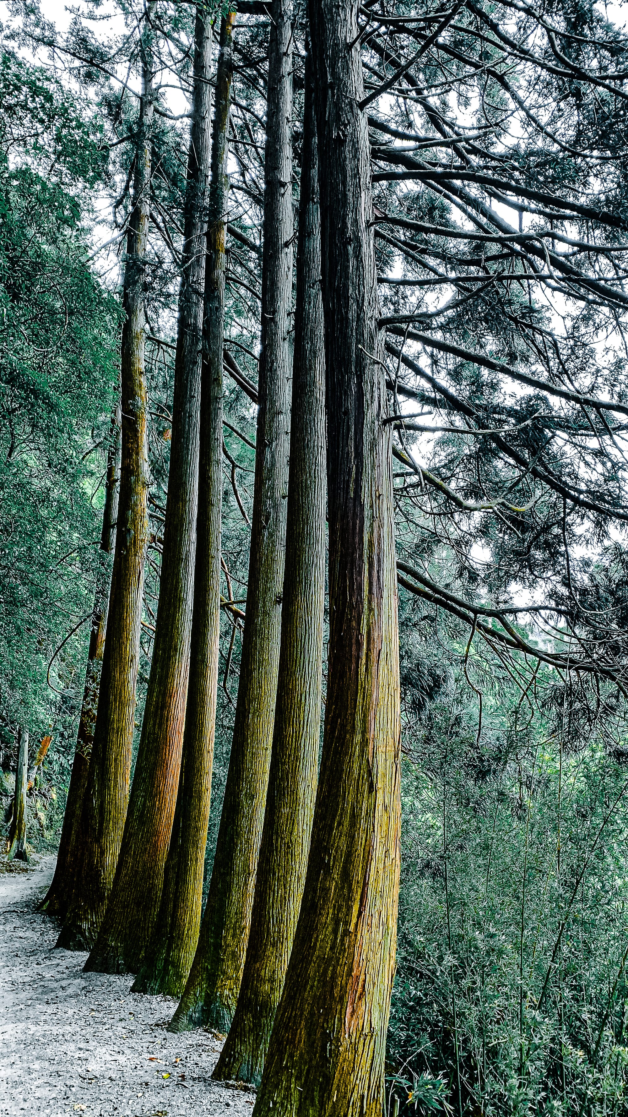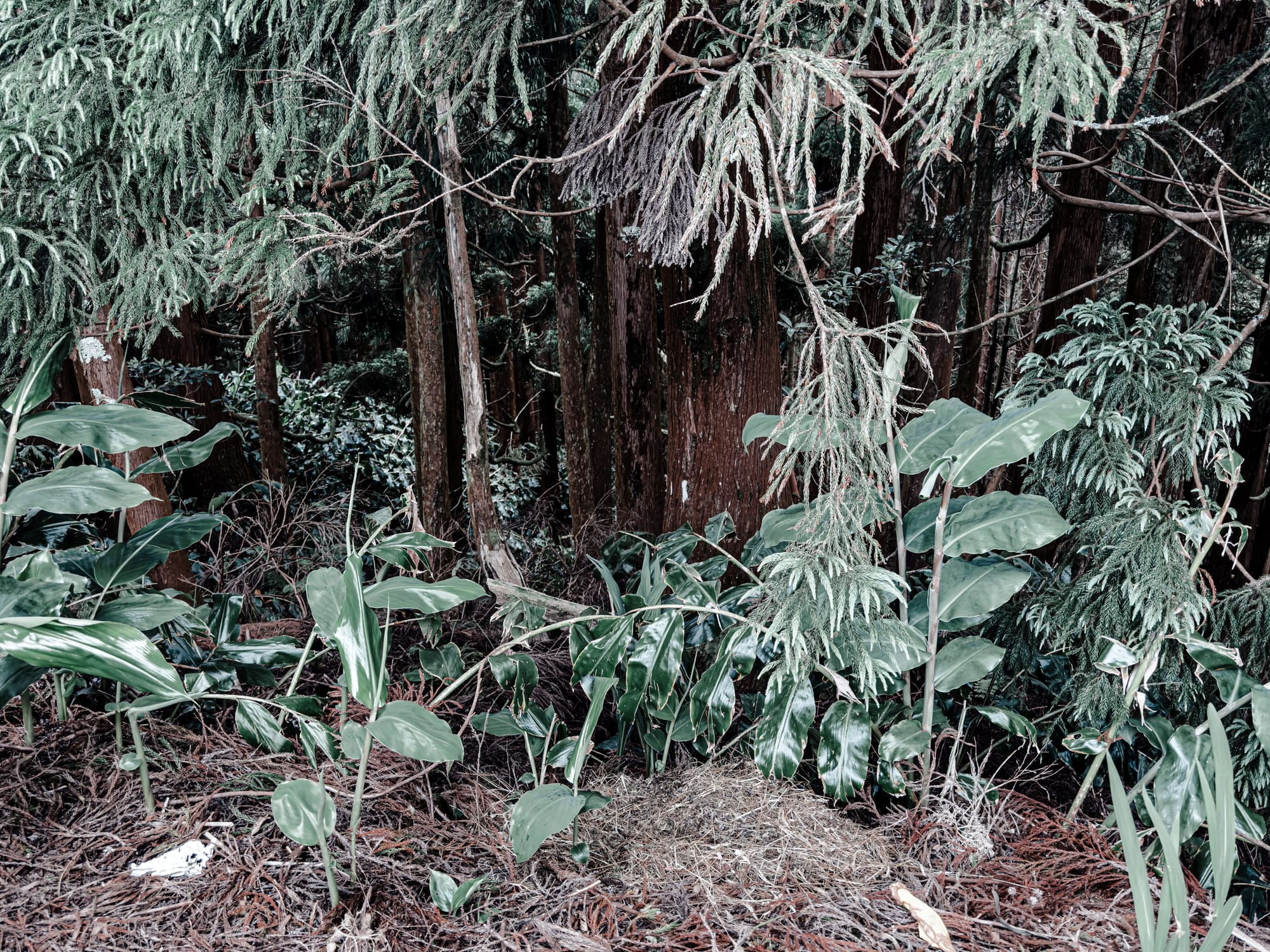 The path winds on through distinct ecological pockets. In one stretch, a grove of towering Japanese cedars rises close to the trail—straight and dense, with high, symmetrical limbs. The bark ranges from soft gray to orange-brown, each trunk slightly flared at the base, like the stance of a dancer. Needles scatter across the trail, creating soft footing that smells of resin and rainfall.