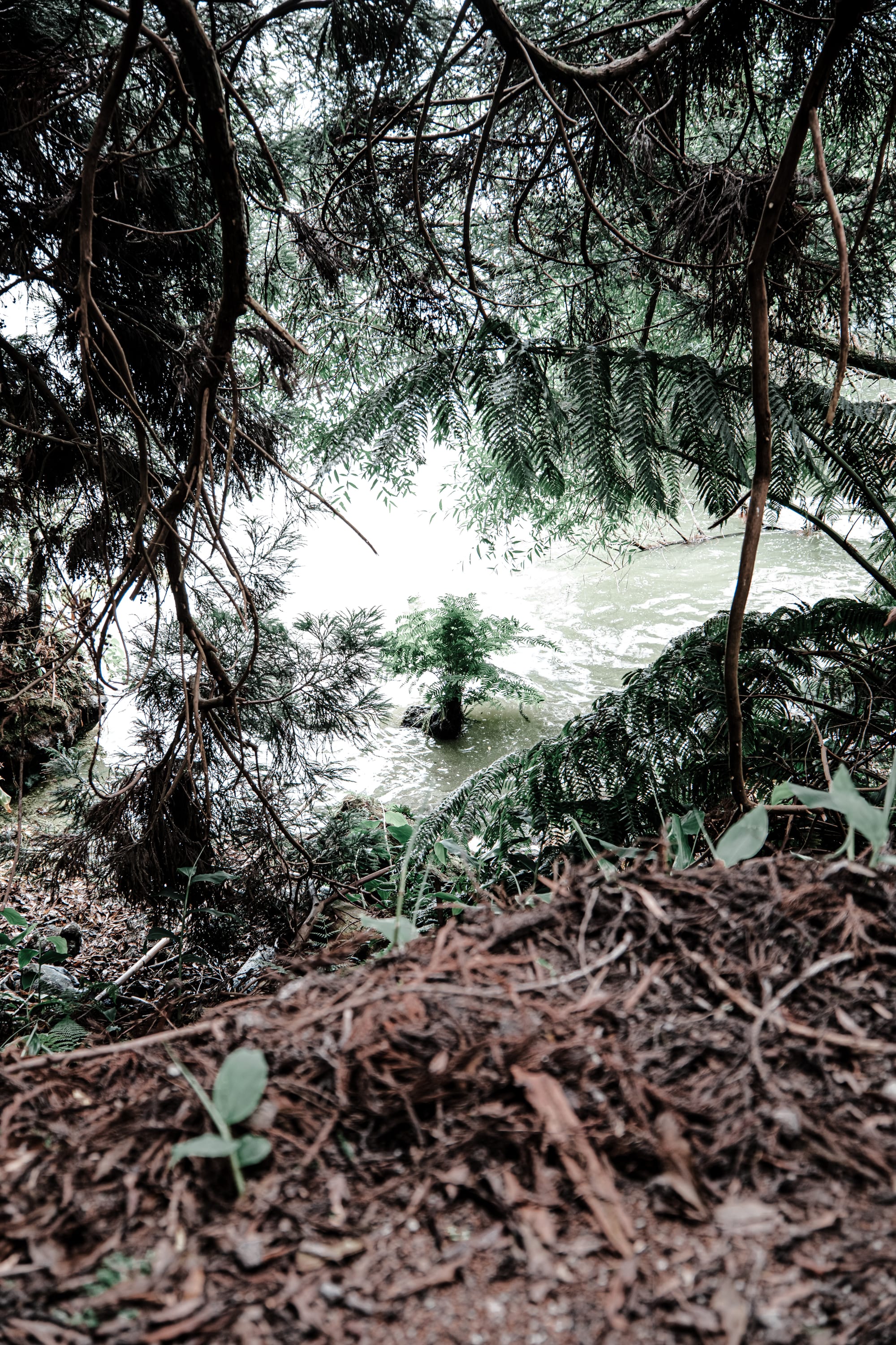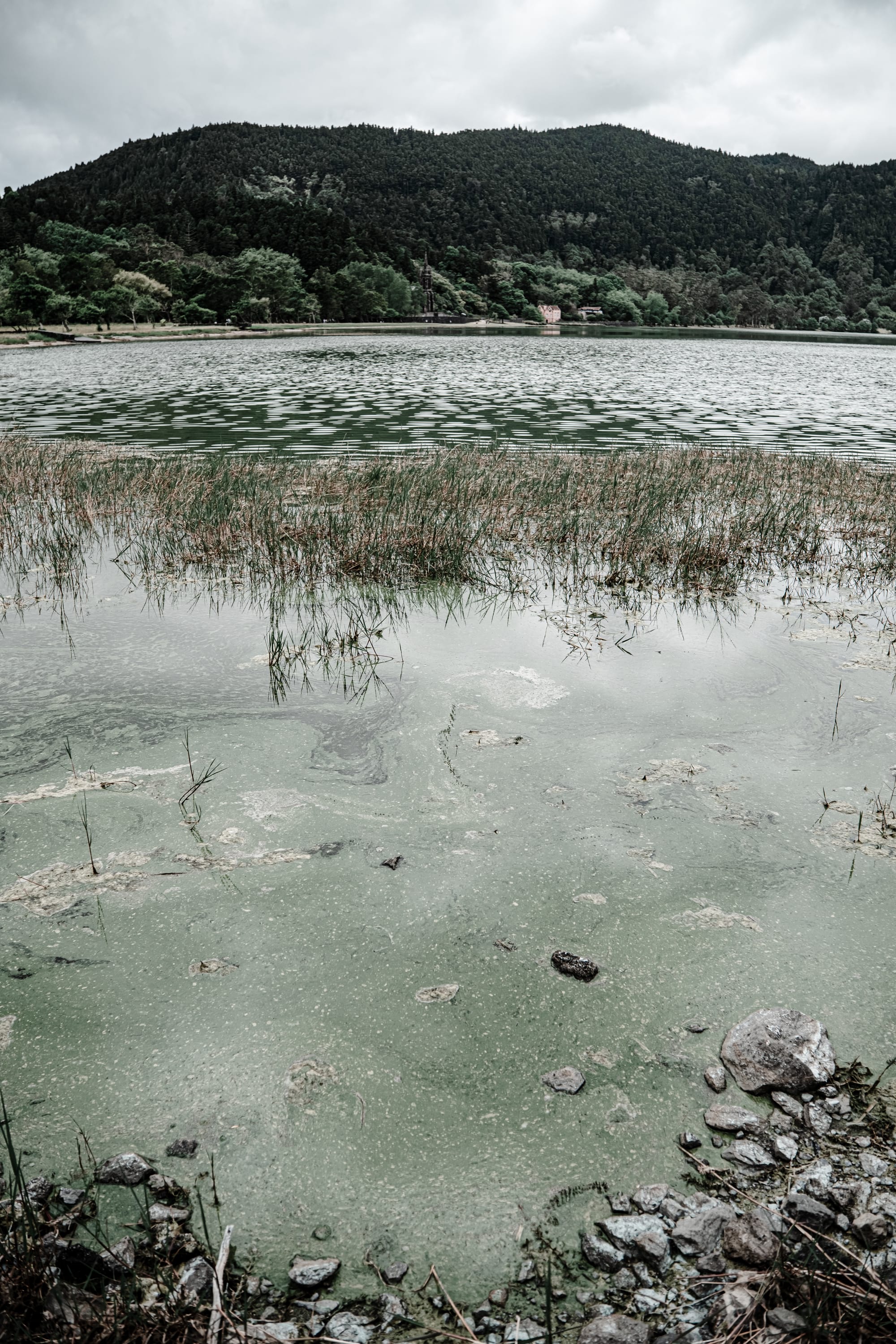 Edge views of Lagoa das Furnas, where reeds, runoff, and overhanging ferns trace the lake’s shifting shoreline
