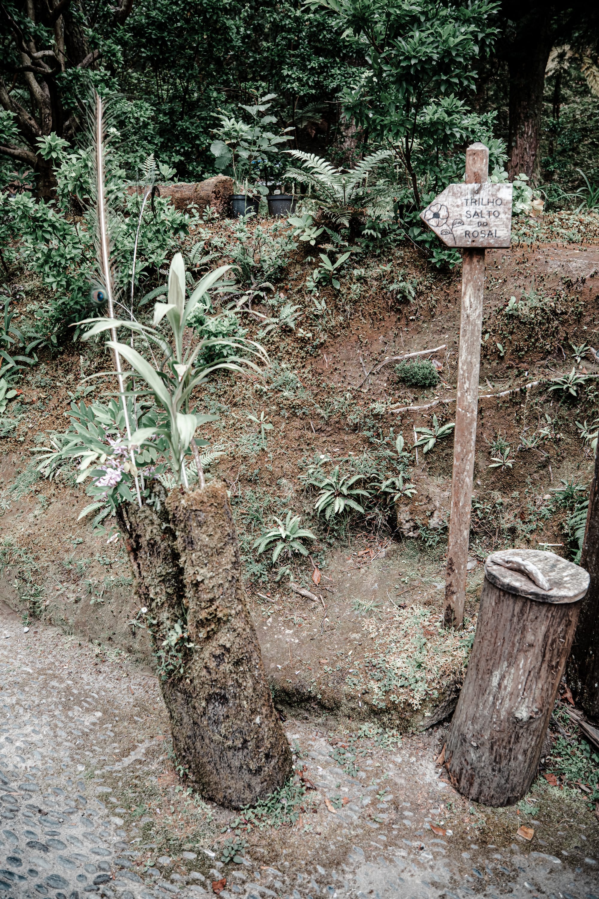 Hand-carved trail markers and mossy signposts hint at the layered human presence throughout the Furnas Lake forest paths