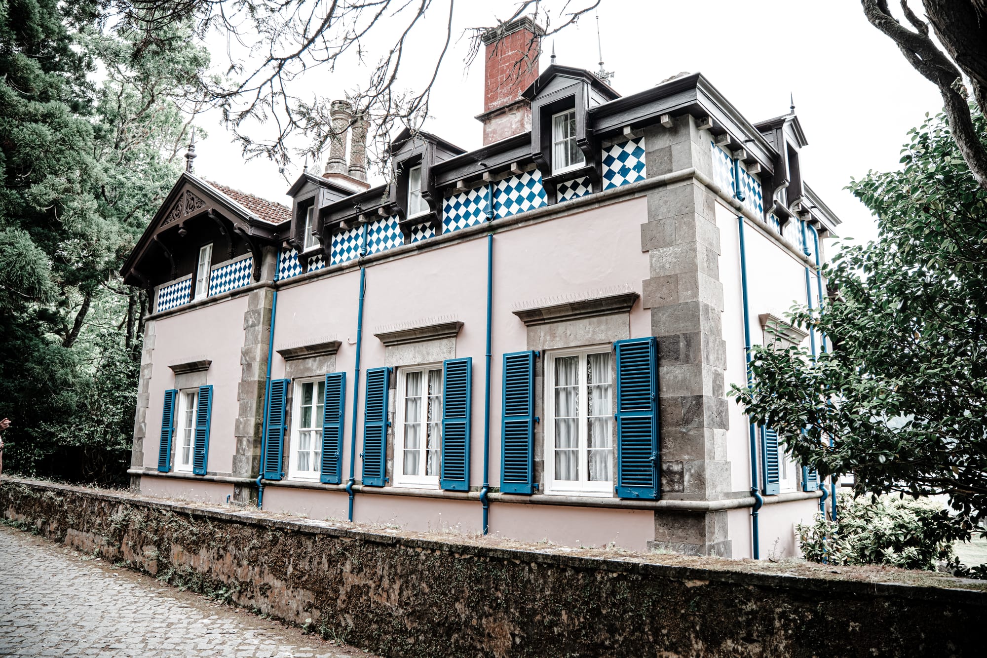 Verdant forest undergrowth gives way to a pastel mansion trimmed in blue—where jungle meets architectural whimsy