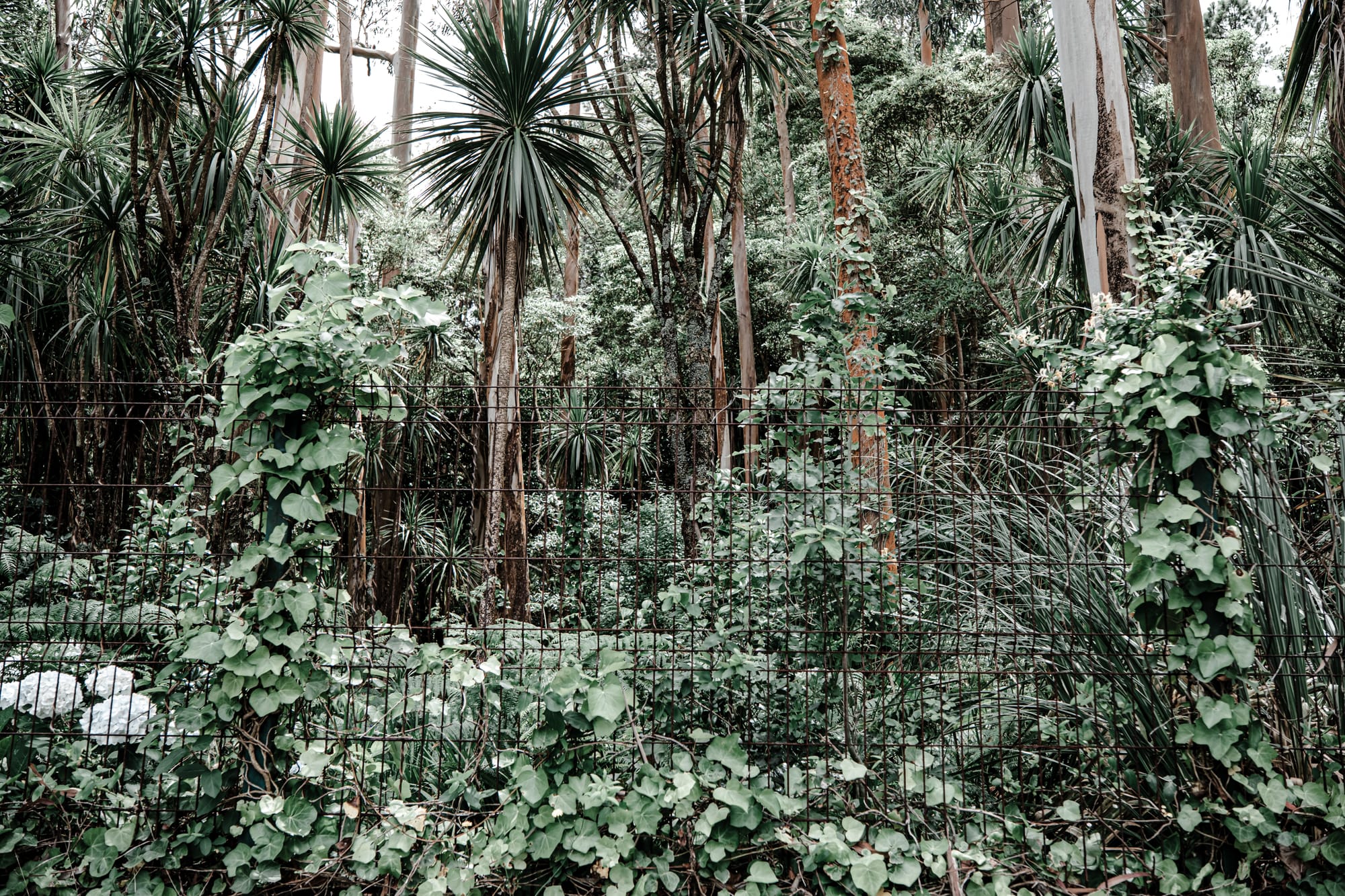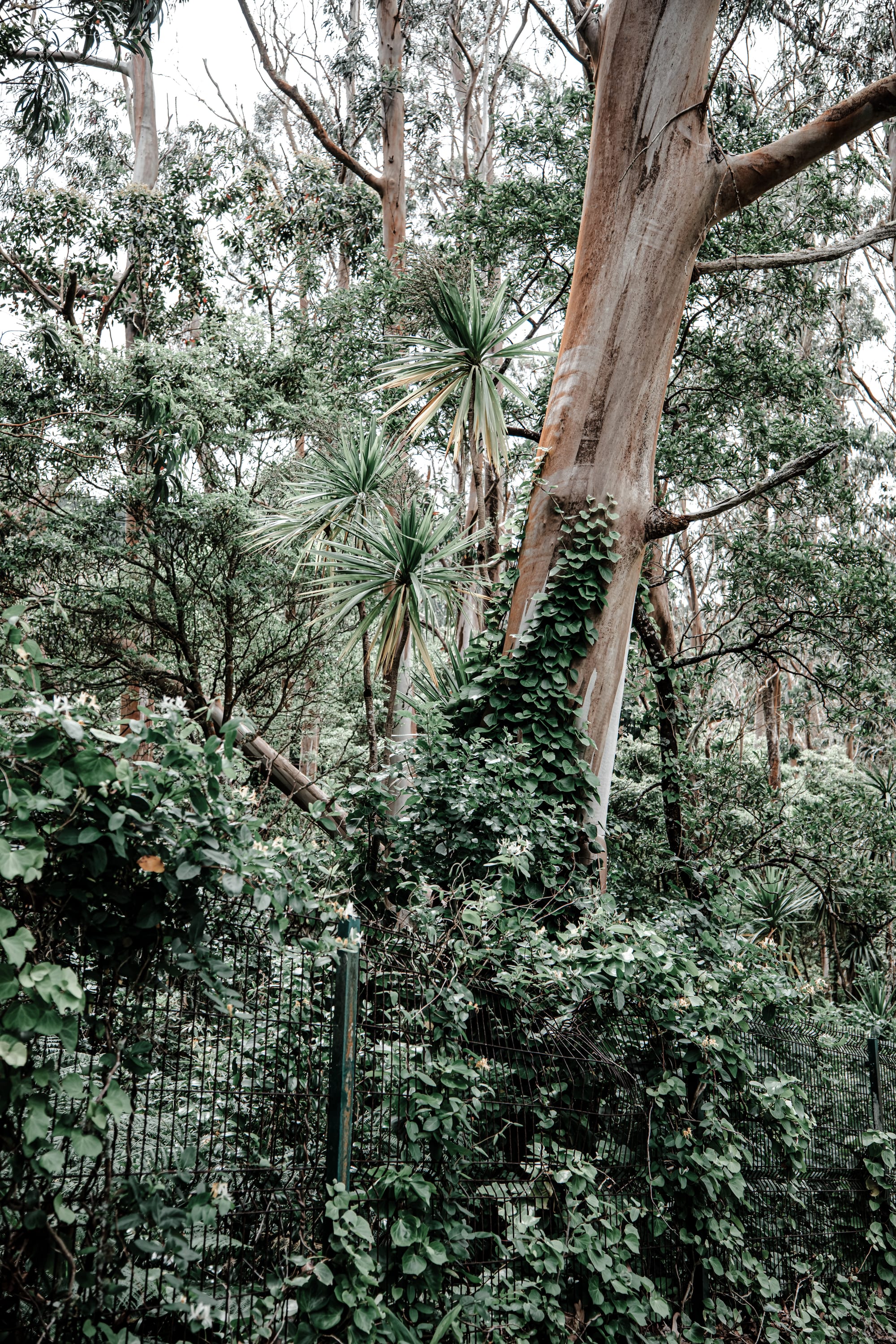 Vines climb eucalyptus trunks and wire fencing as dracaena palms cluster in the undergrowth