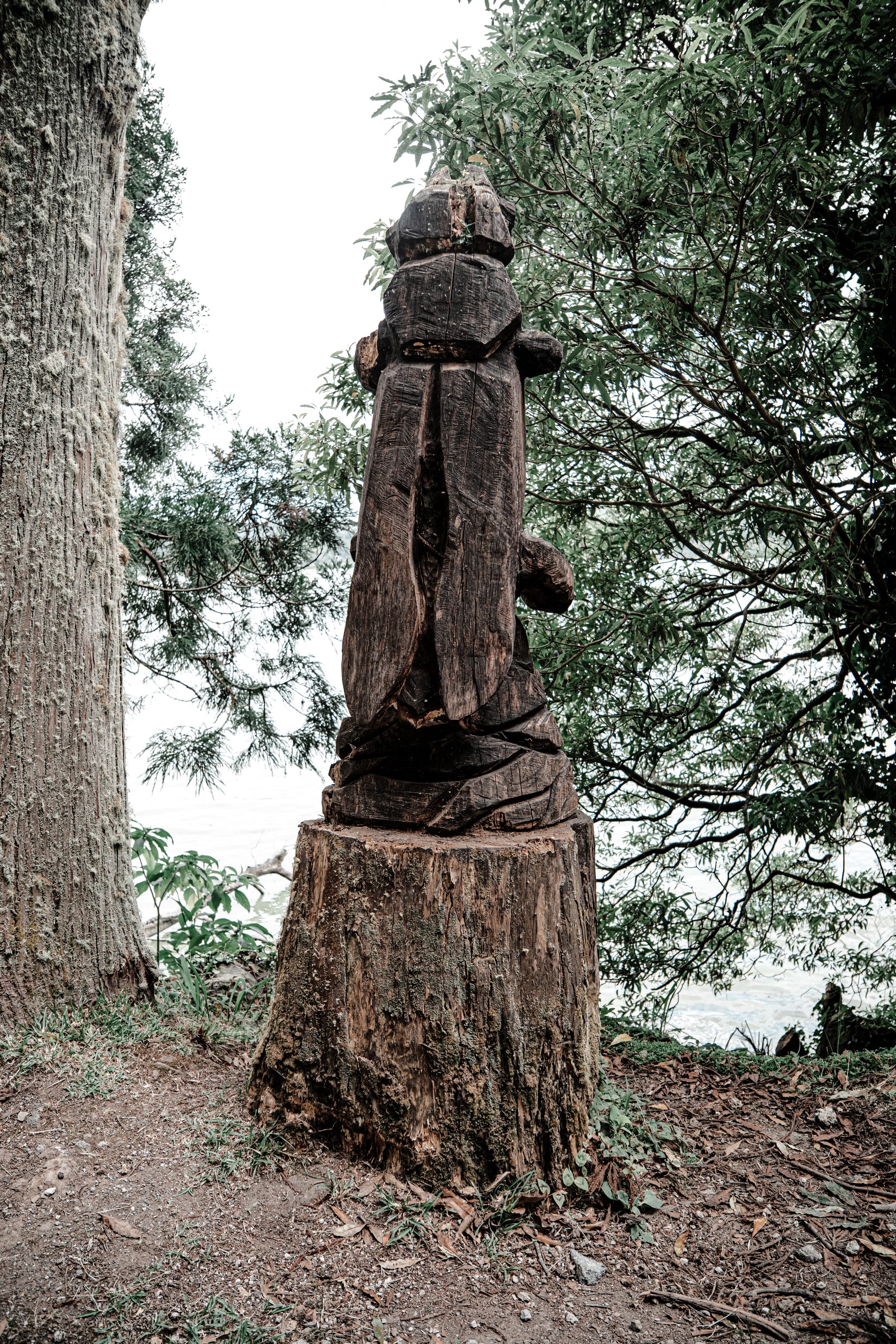 A carved wooden sculpture, worn and darkened by weather, sits at the base of a tree stump, watching the path.