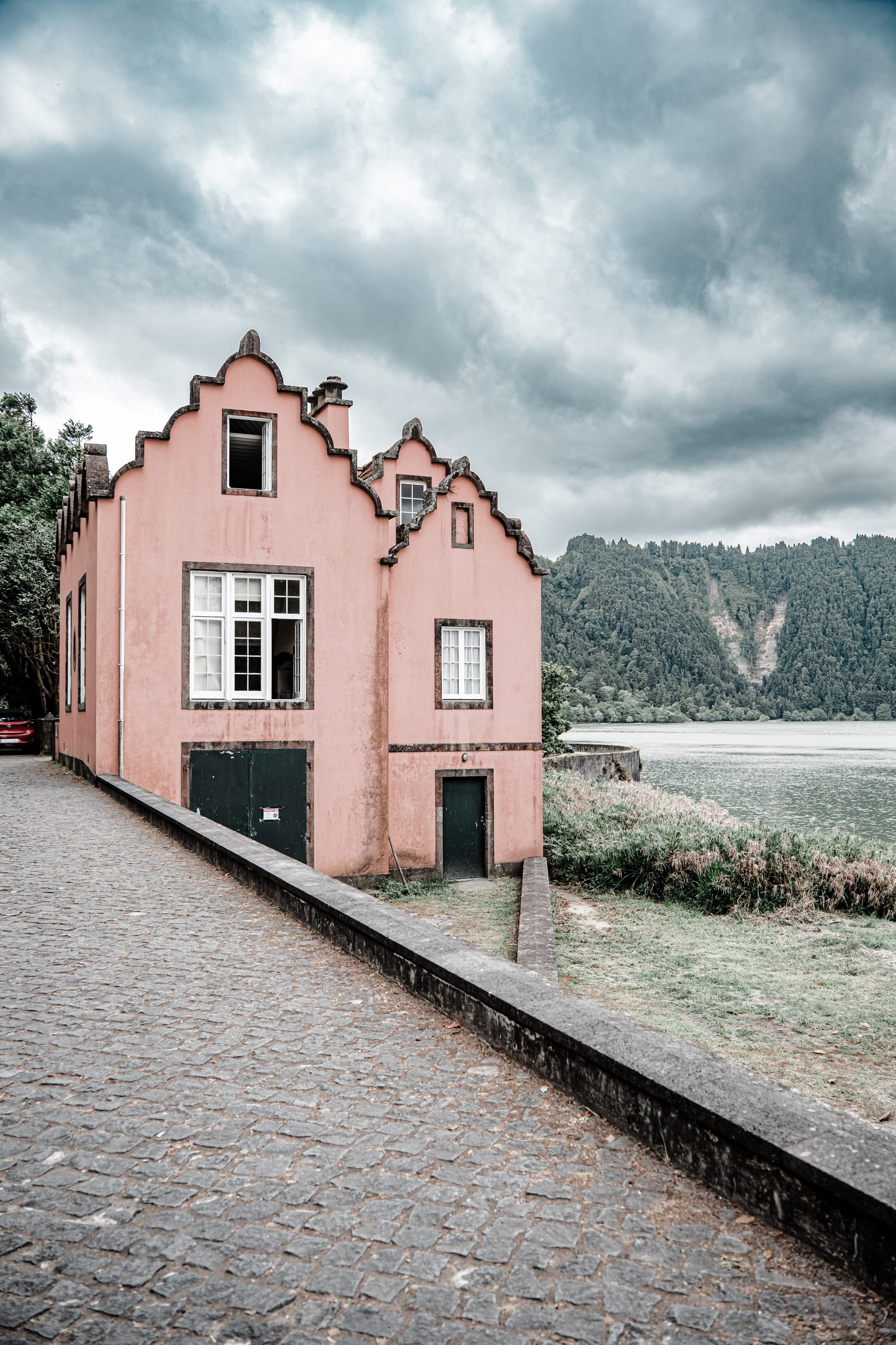 About halfway around the lake stands the Capela de Nossa Senhora das Vitórias. Built in the late 19th century in memory of a lost wife, it’s sharp-edged and solitary—tall spire, dark stone, narrow windows. Moss softens its base. The reddish volcanic rock is mottled with lichen and streaks of black where rain has gathered and run.