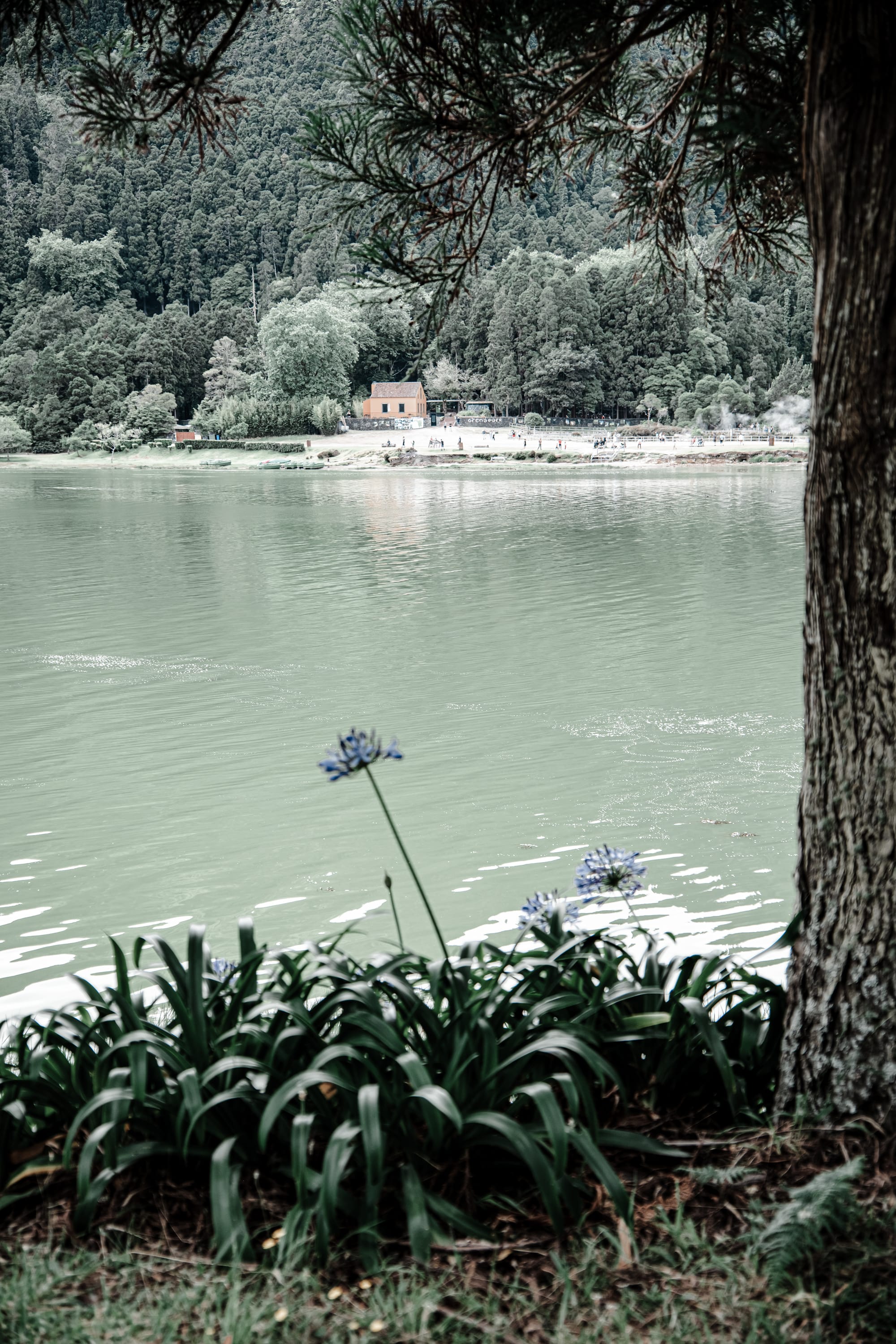 The lake surface stays mostly still. It’s pale, milky green, occasionally streaked with darker patches of wind. Along the shoreline, purple agapanthus and stone pines frame views across the water. Ducks move quietly in single file, threading lines through reflection.