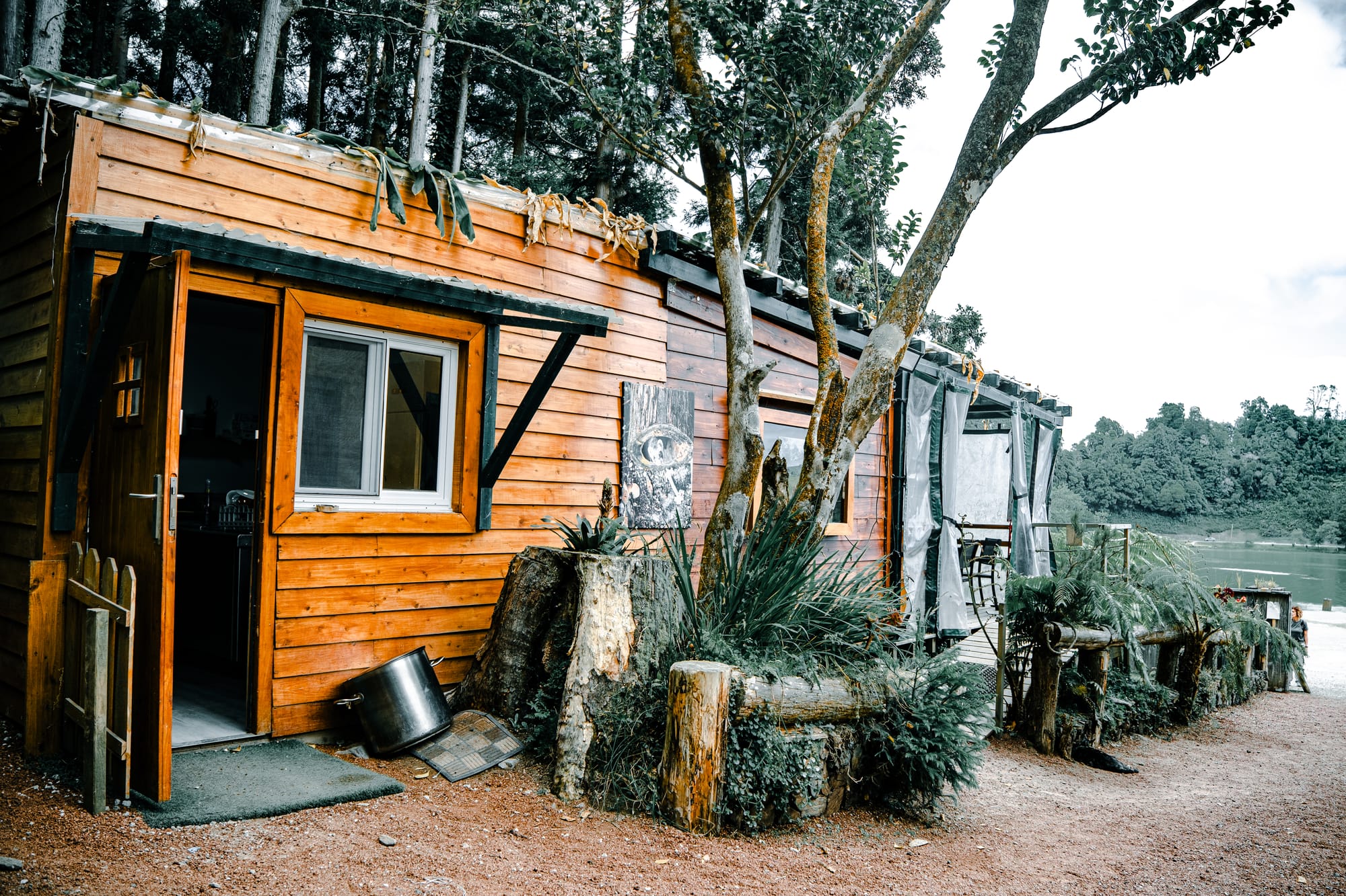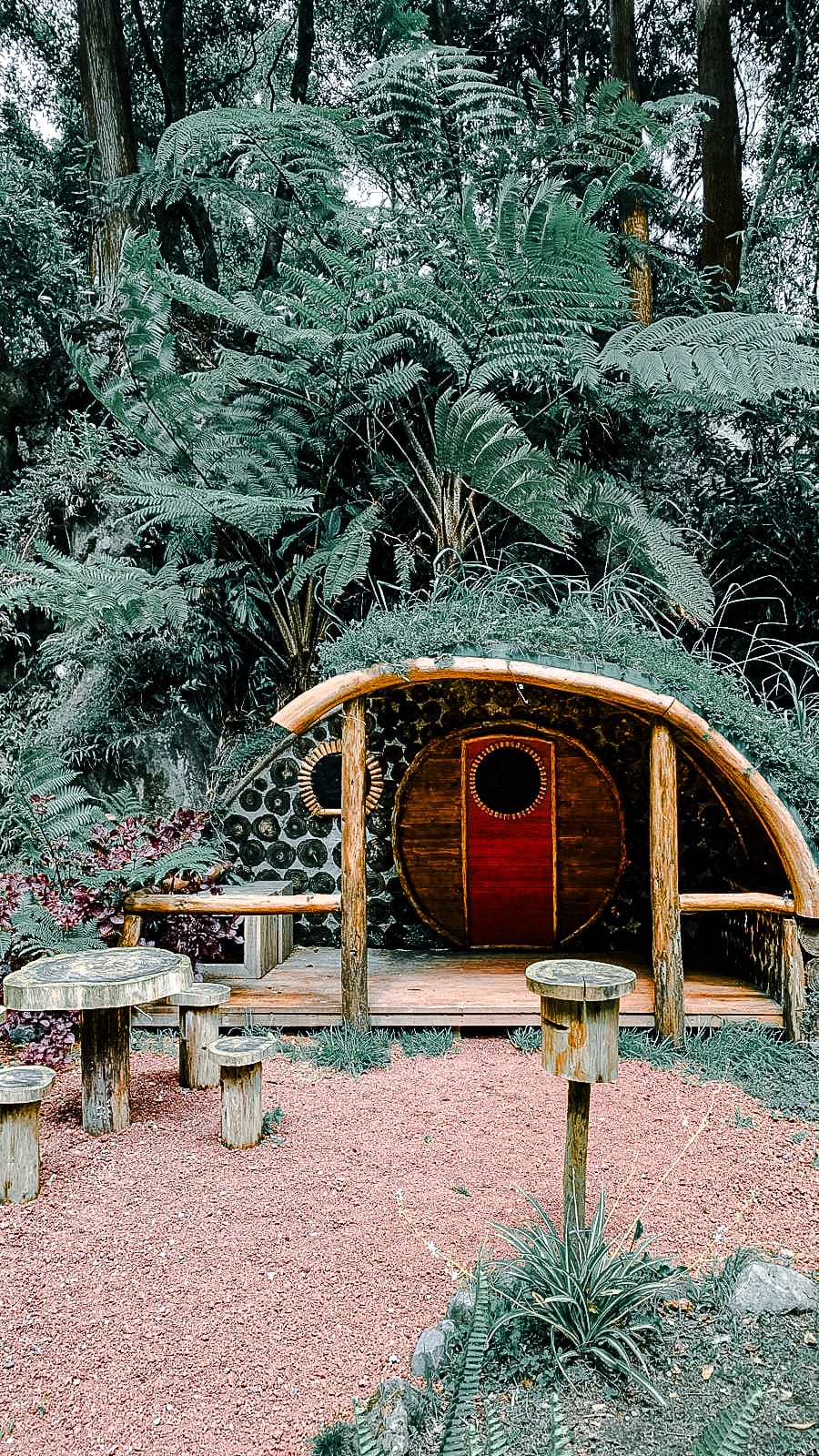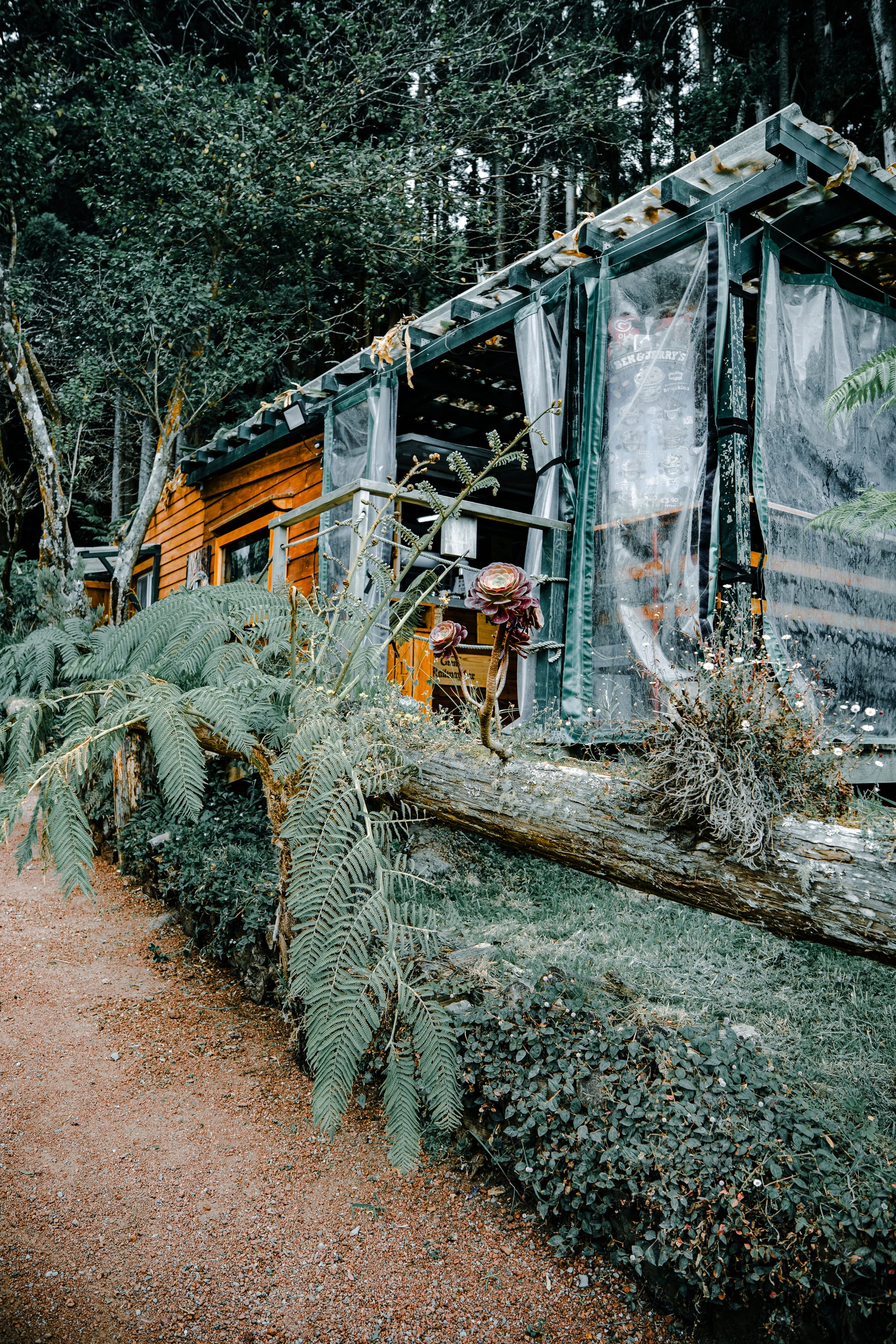 A wooden cabin restaurant tucked along the trail, surrounded by ferns, succulents, and volcanic soil.