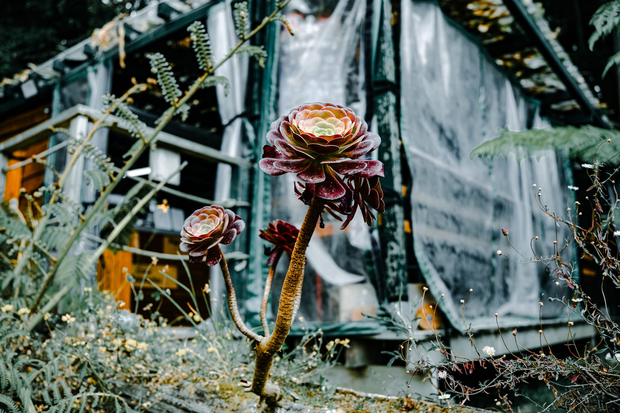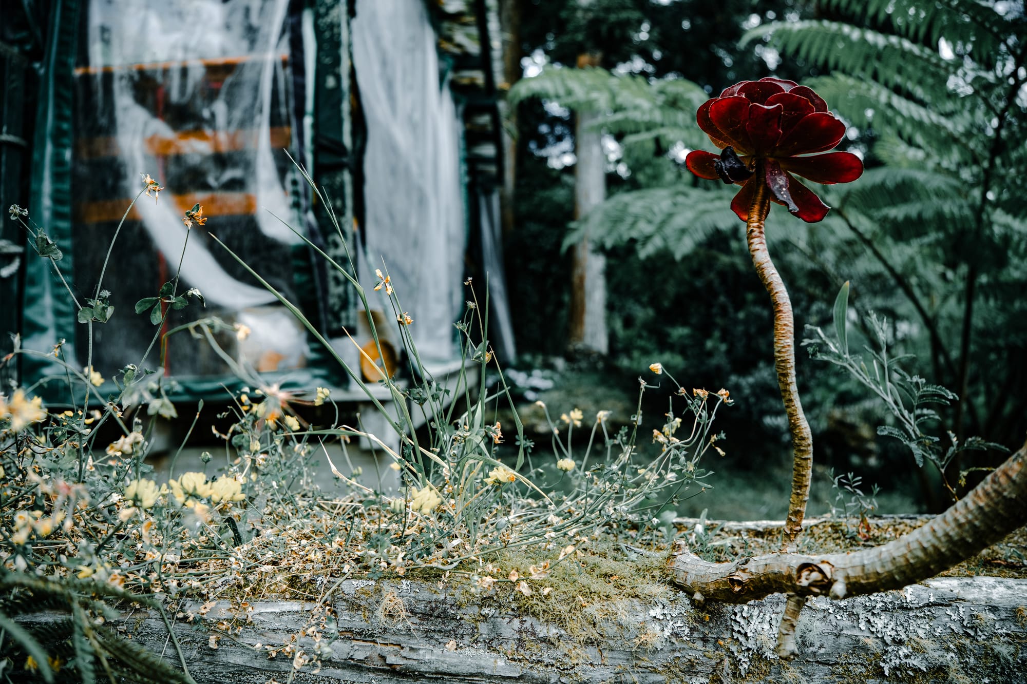 Succulents rise from mossy logs, their layered rosettes deepening in hue as they reach for the filtered light of the forest edge