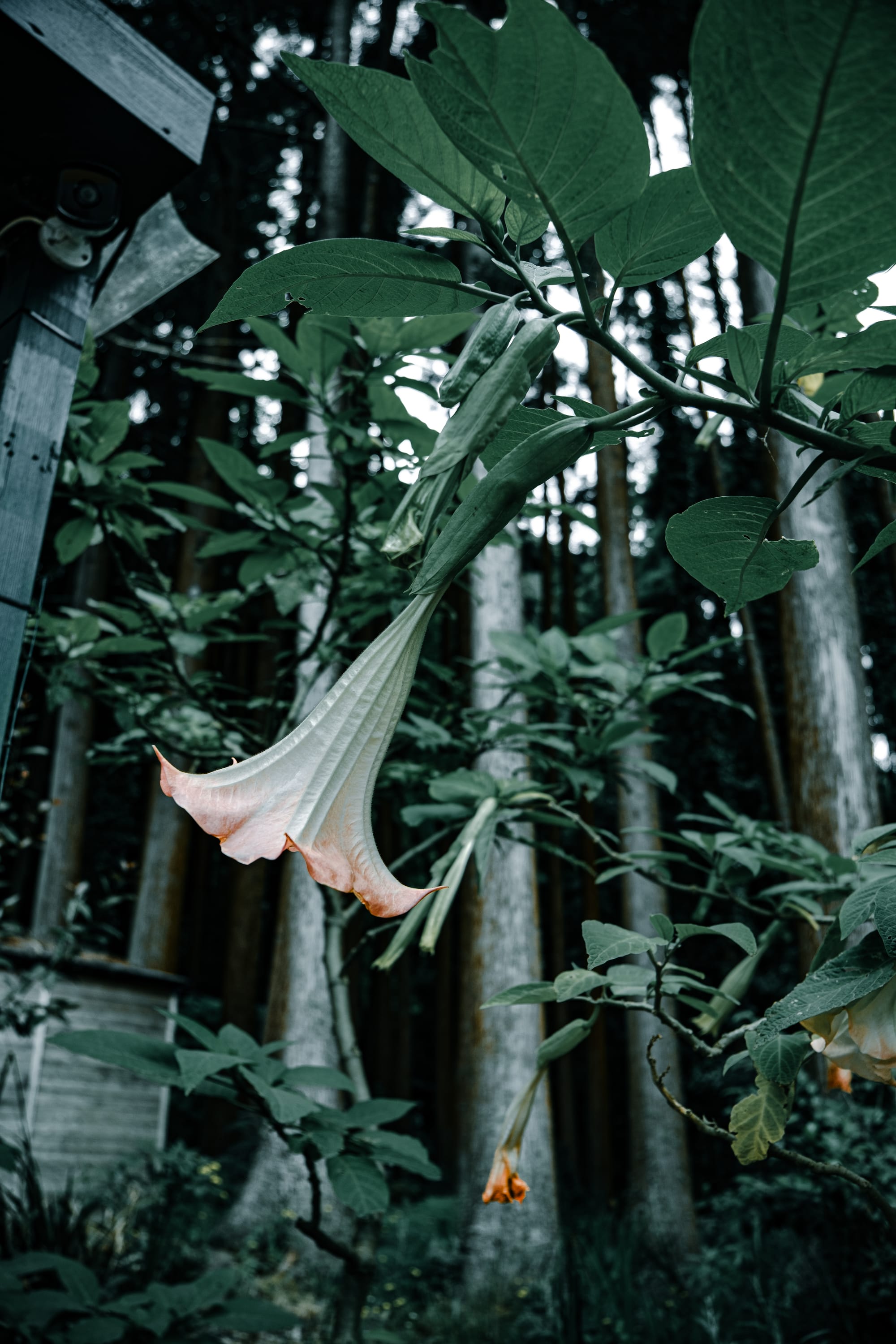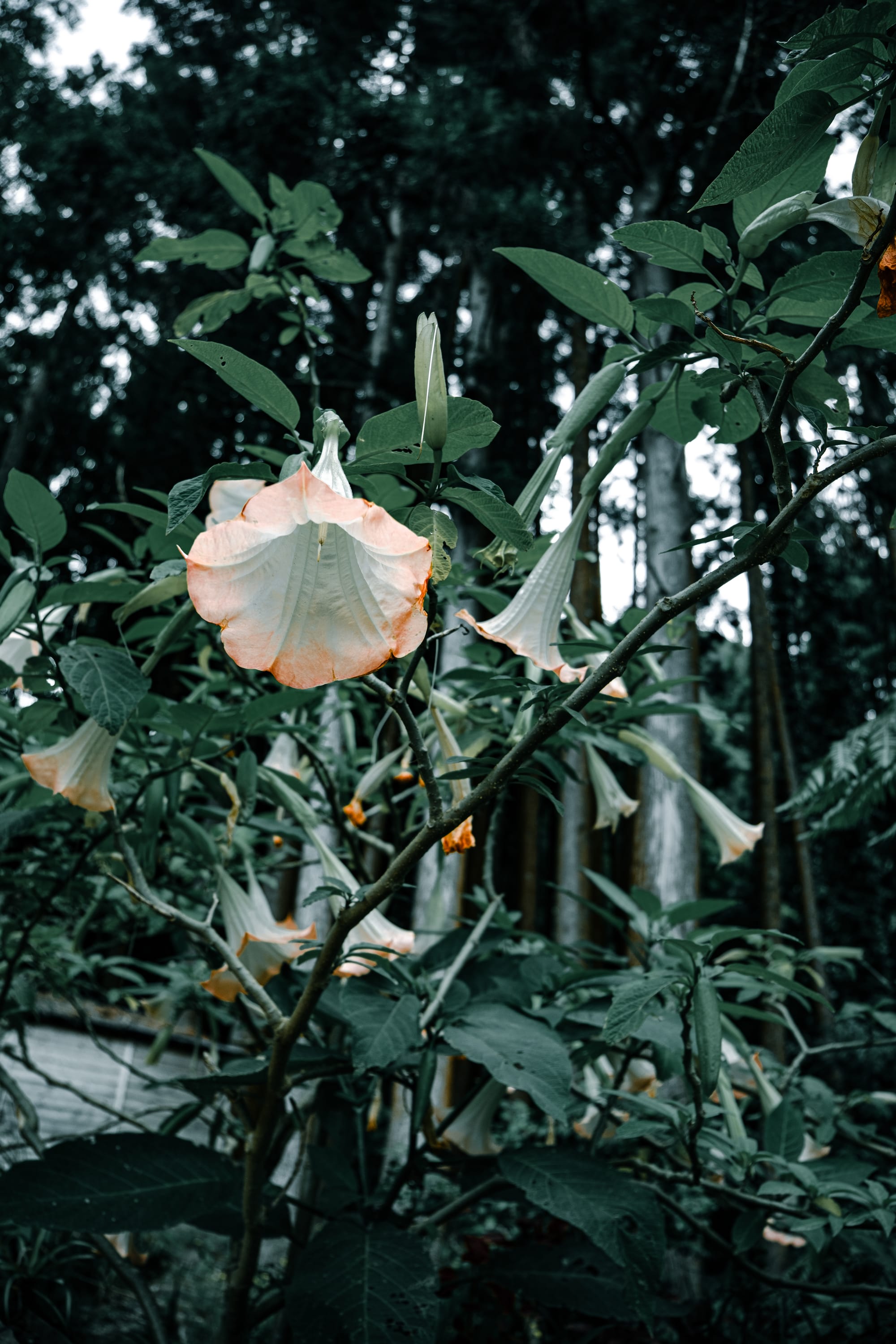 Blooms hang like pale trumpets, their delicate peach-tinged edges softening the dark geometry of the forest behind them