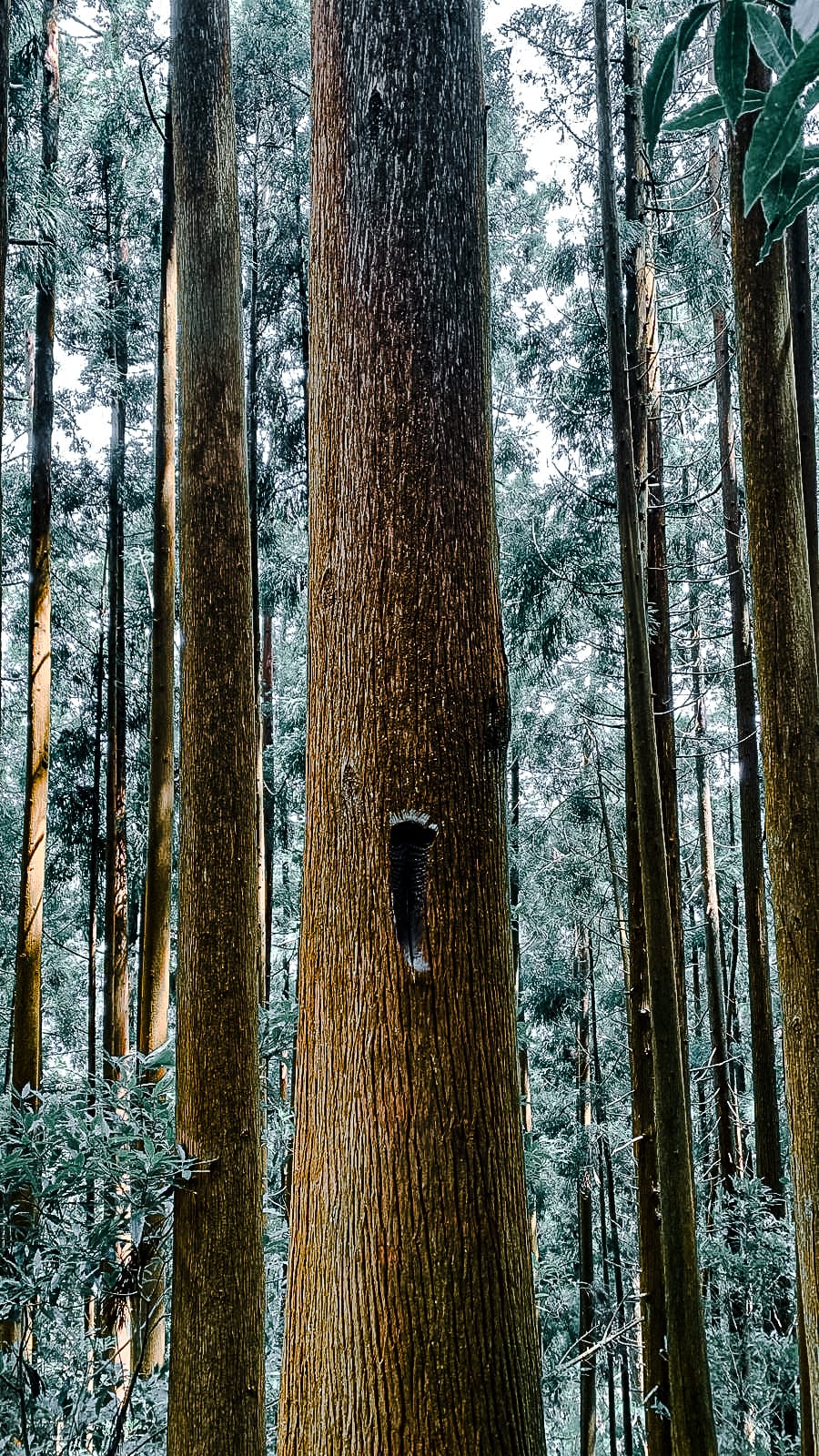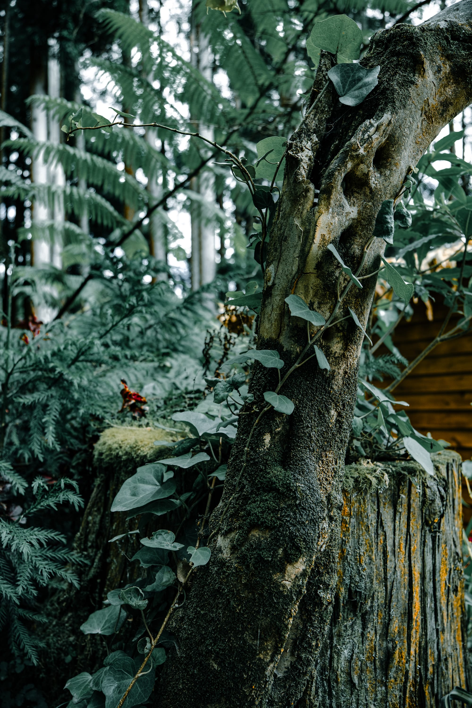 Elsewhere: eucalyptus stripped smooth, climbing ivy pulled high along pale trunks, scattered undergrowth of ginger, fern, and moss.