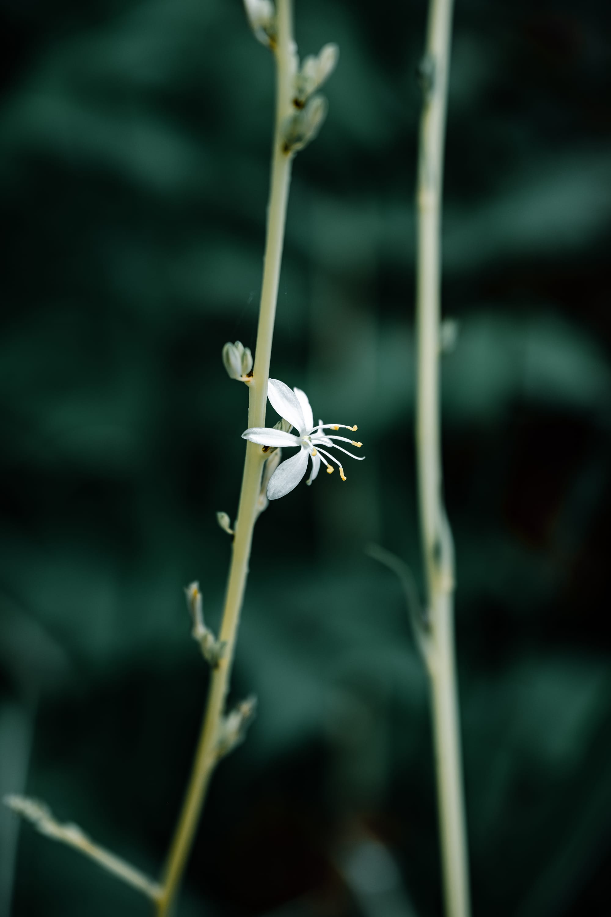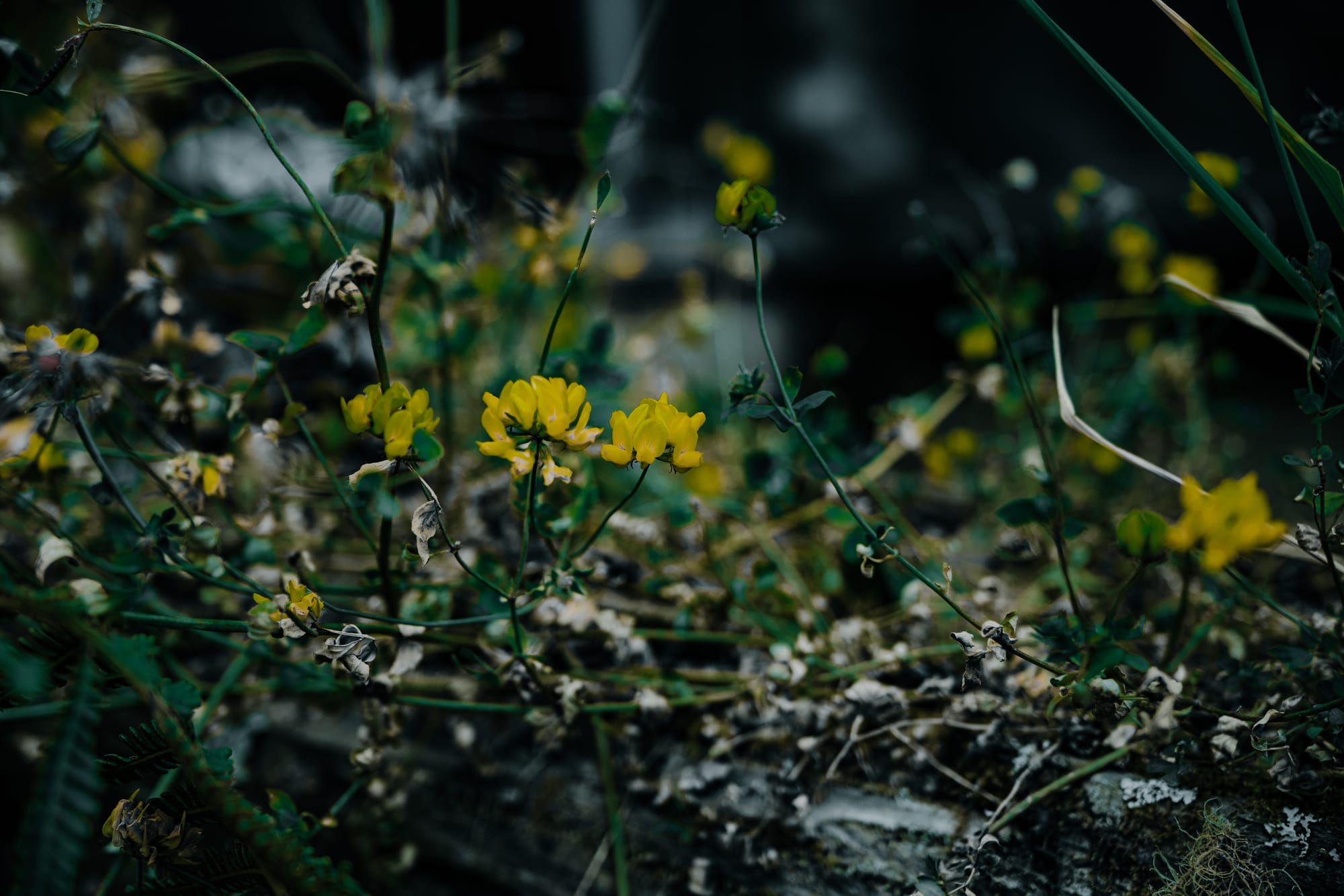 Delicate yellow bird’s-foot trefoil and a single white spider plant bloom punctuate the undergrowth with quiet precision