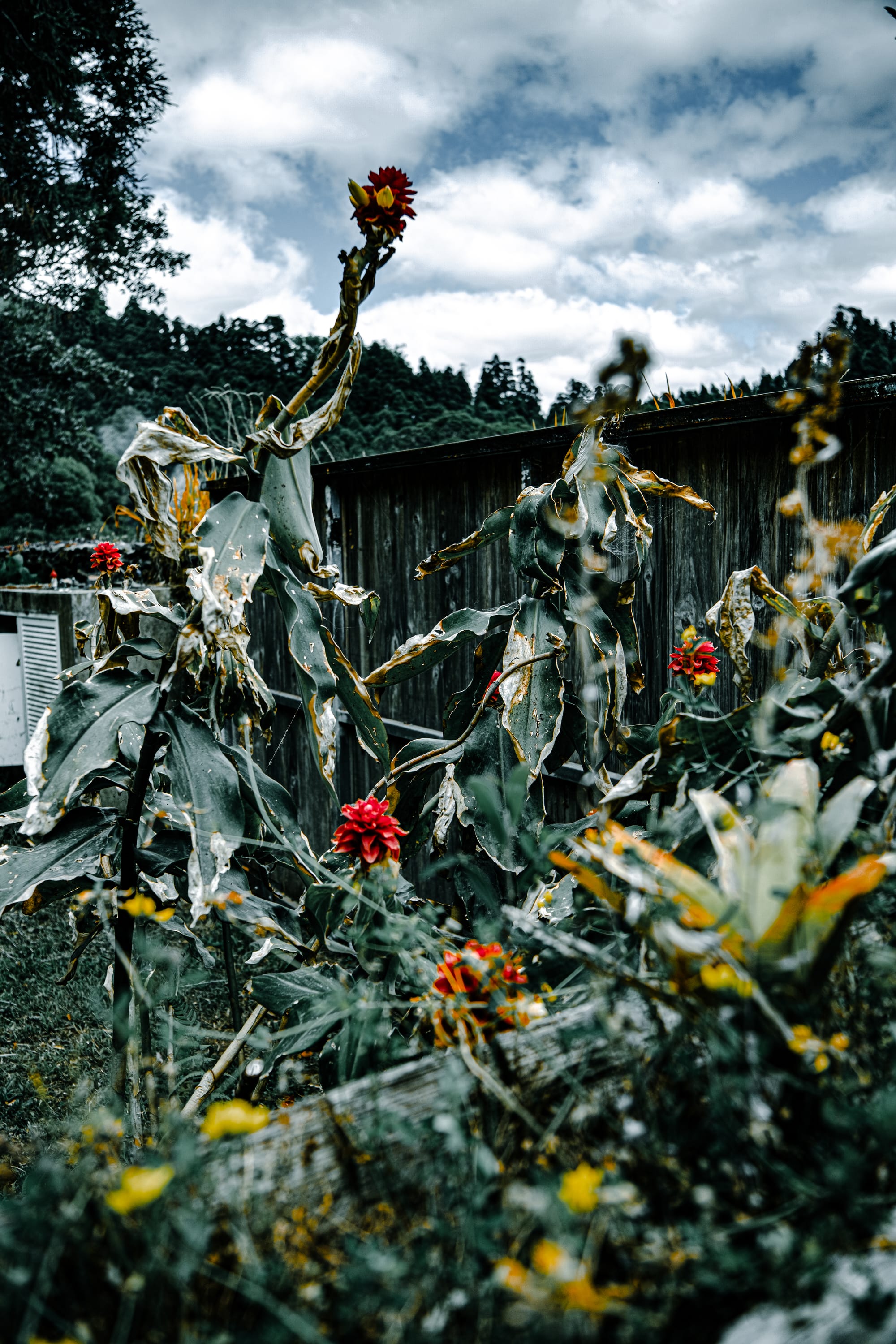 Grená Park hosts a series of less-traveled trails that wind through denser forest—marked by stretches of sweet chestnut, tall Cryptomeria japonica, and tangled understory. There are banks of flowering wild garlic (Allium ursinum), long ribbons of canna lilies in deep orange and crimson, and occasional flashes of calla lilies emerging from shadow. Closer to the gate, red-hot pokers (Kniphofia uvaria) bloom upright beside clusters of pale pink trumpet-shaped flowers, possibly Brugmansia.