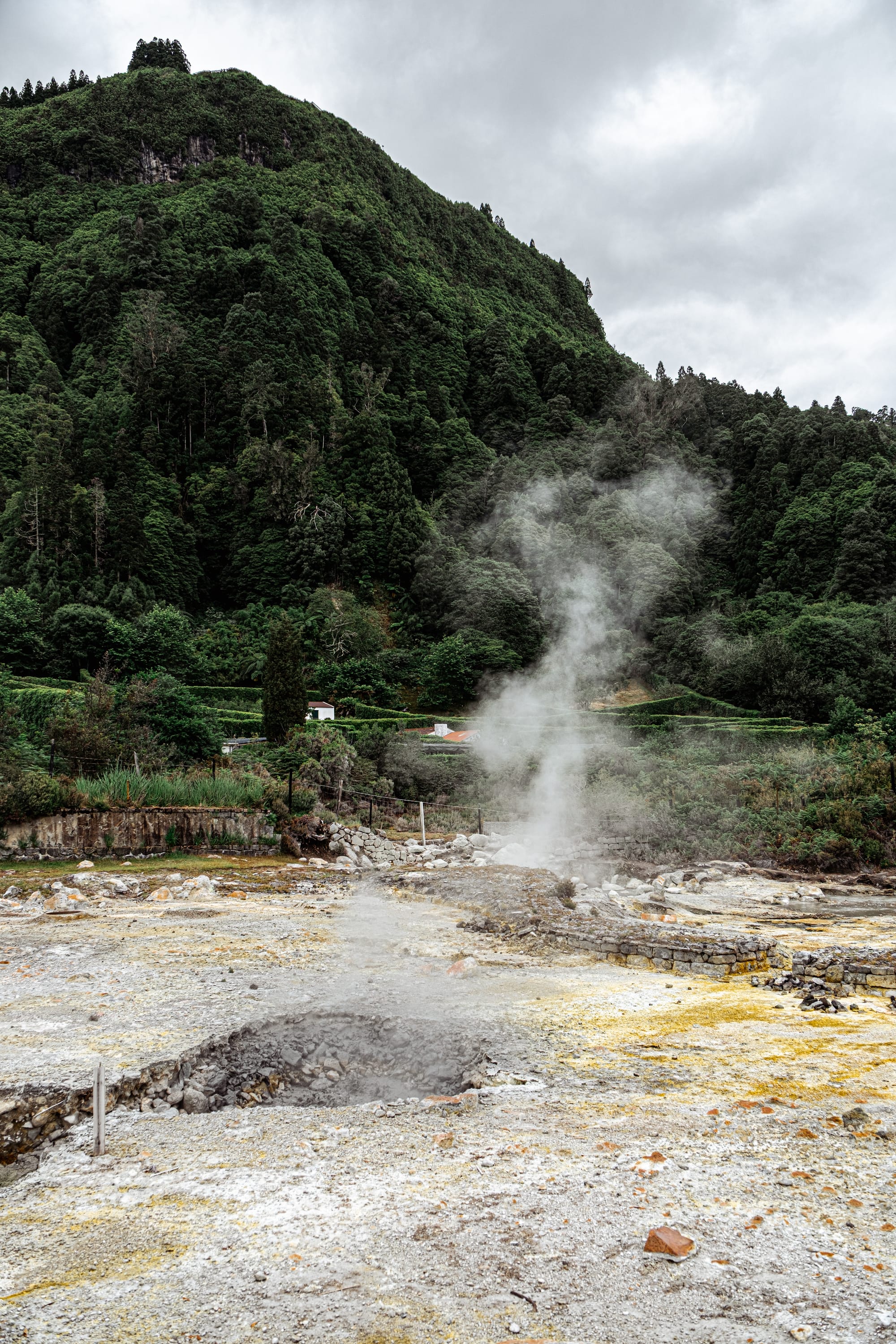 Geothermal vents and cozido cooking pits at Furnas, where steam rises from sulfur-streaked earth beneath dense volcanic forest