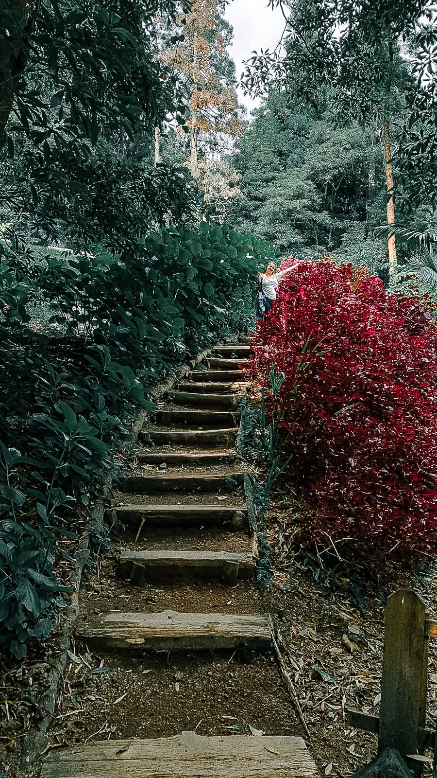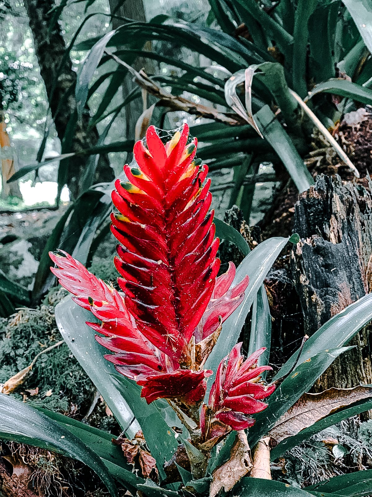 Wax ginger in full bloom, their red bracts and waxy stalks adding surreal bursts of color to the forested path
