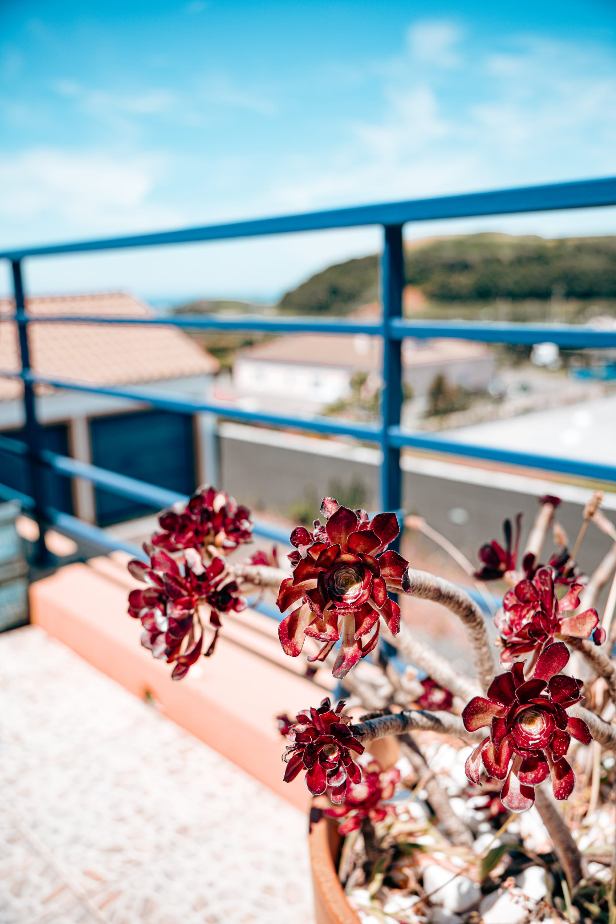 Colorful wooden bench and railing on a balcony at Lava Coliving, overlooking green hills, modern white buildings, and a blue sky filled with puffy clouds