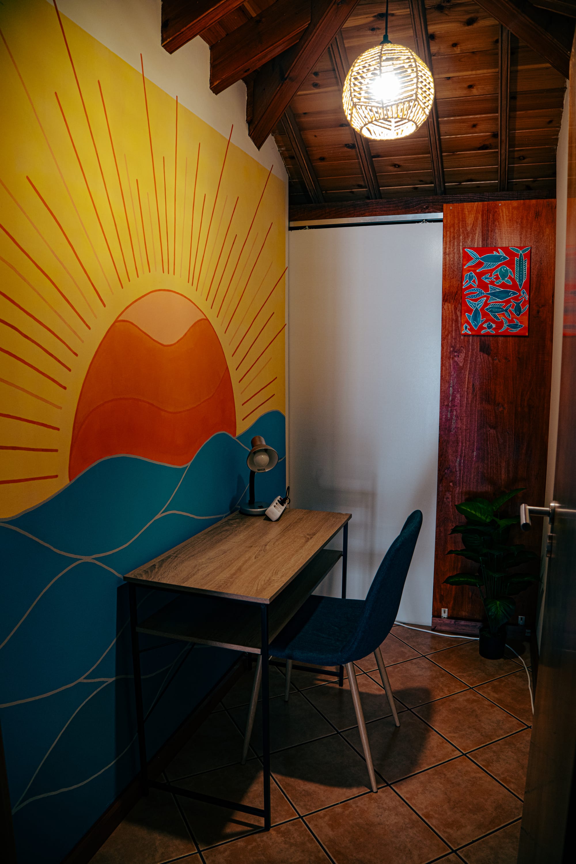 A warmly lit entryway at Lava Coliving featuring a sunburst mirror, orange wall, wooden dresser with decorative items, and a sign displaying the wifi code