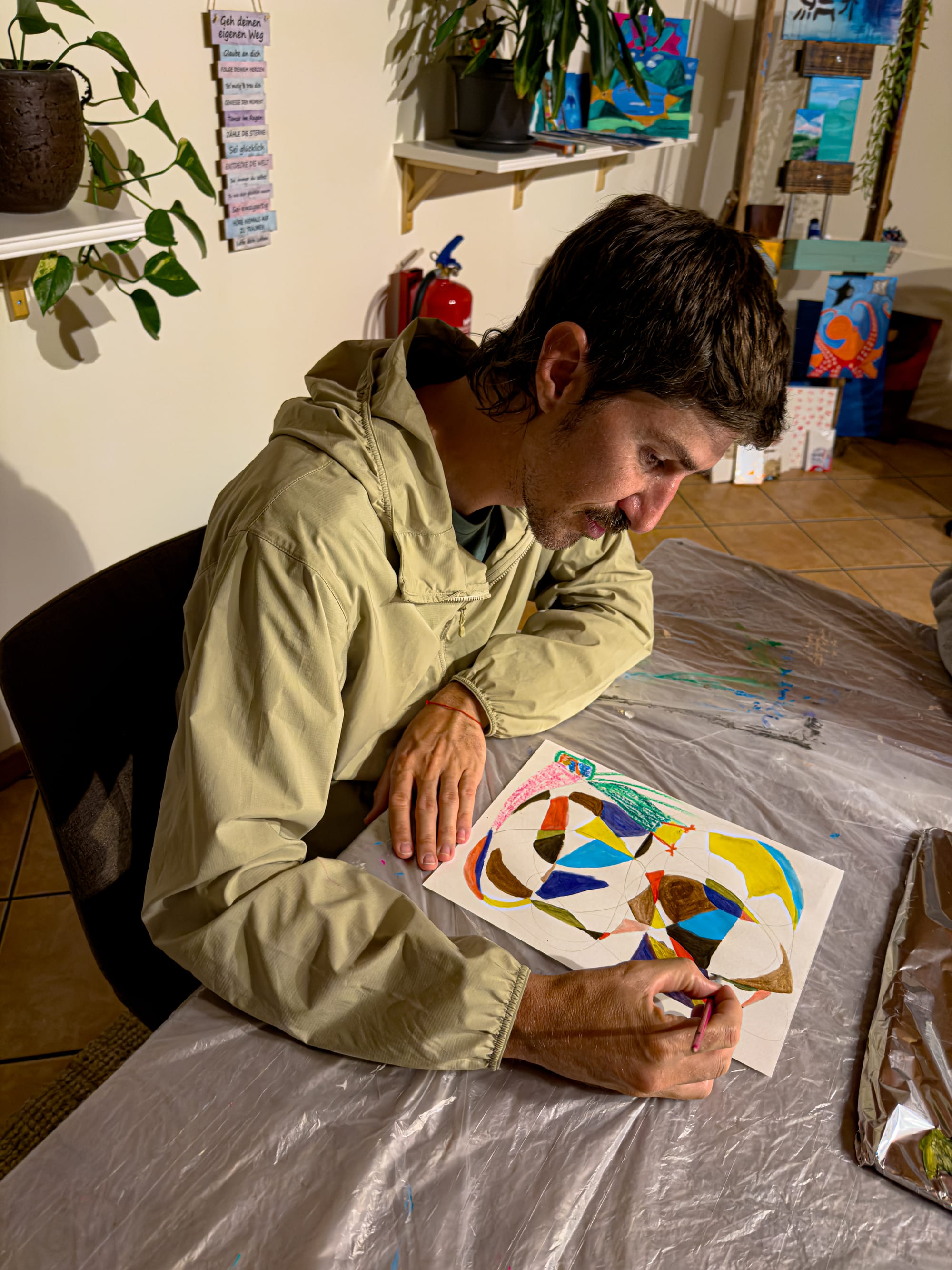 A cozy, sunlit co-working space at Lava Coliving with a large wooden table surrounded by mismatched chairs, plants on floating shelves, and art supplies in the background