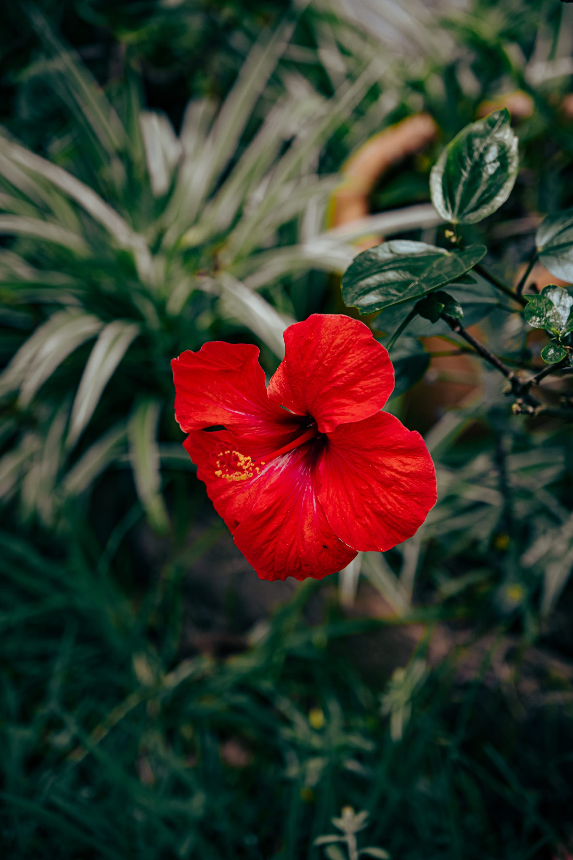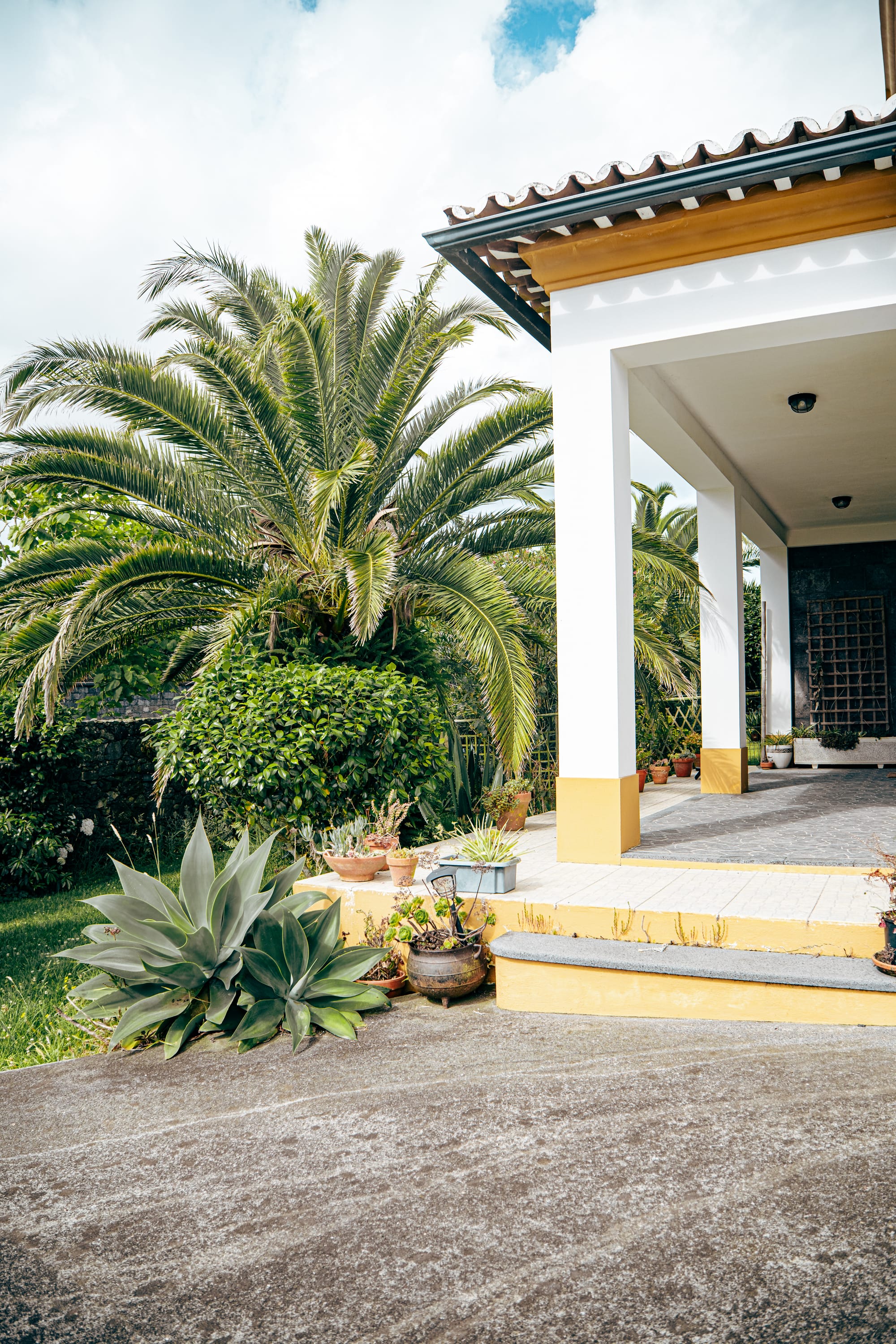 The front entrance of Lava Coliving, partially obscured by large palm fronds and dense garden plants, with white pillars and wooden door beneath a covered patio