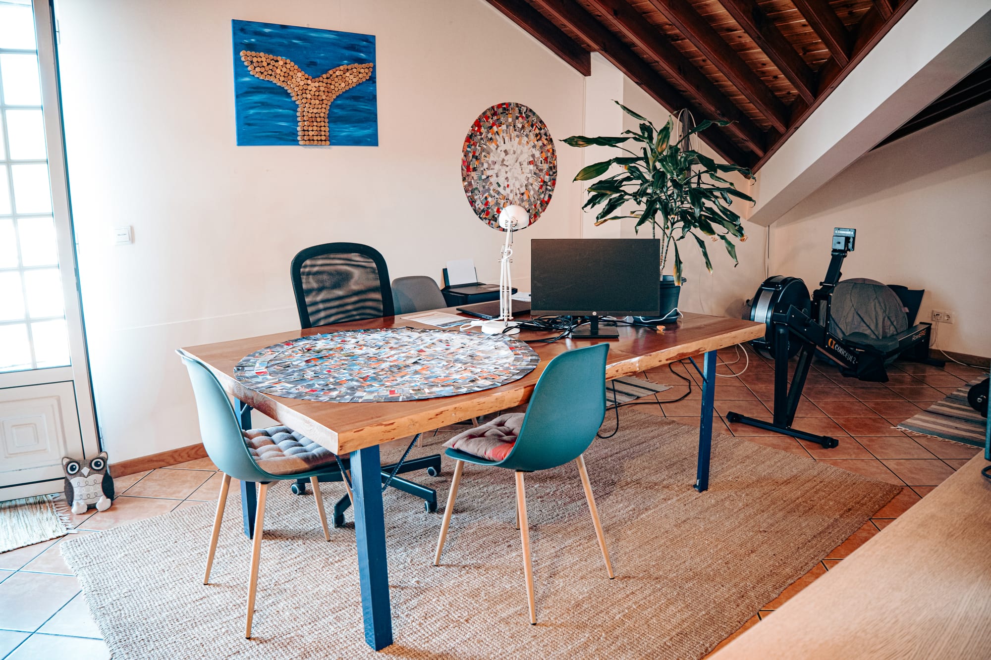 Spacious coworking area with large wooden table, office chairs, plants, and art supplies at Lava Coliving