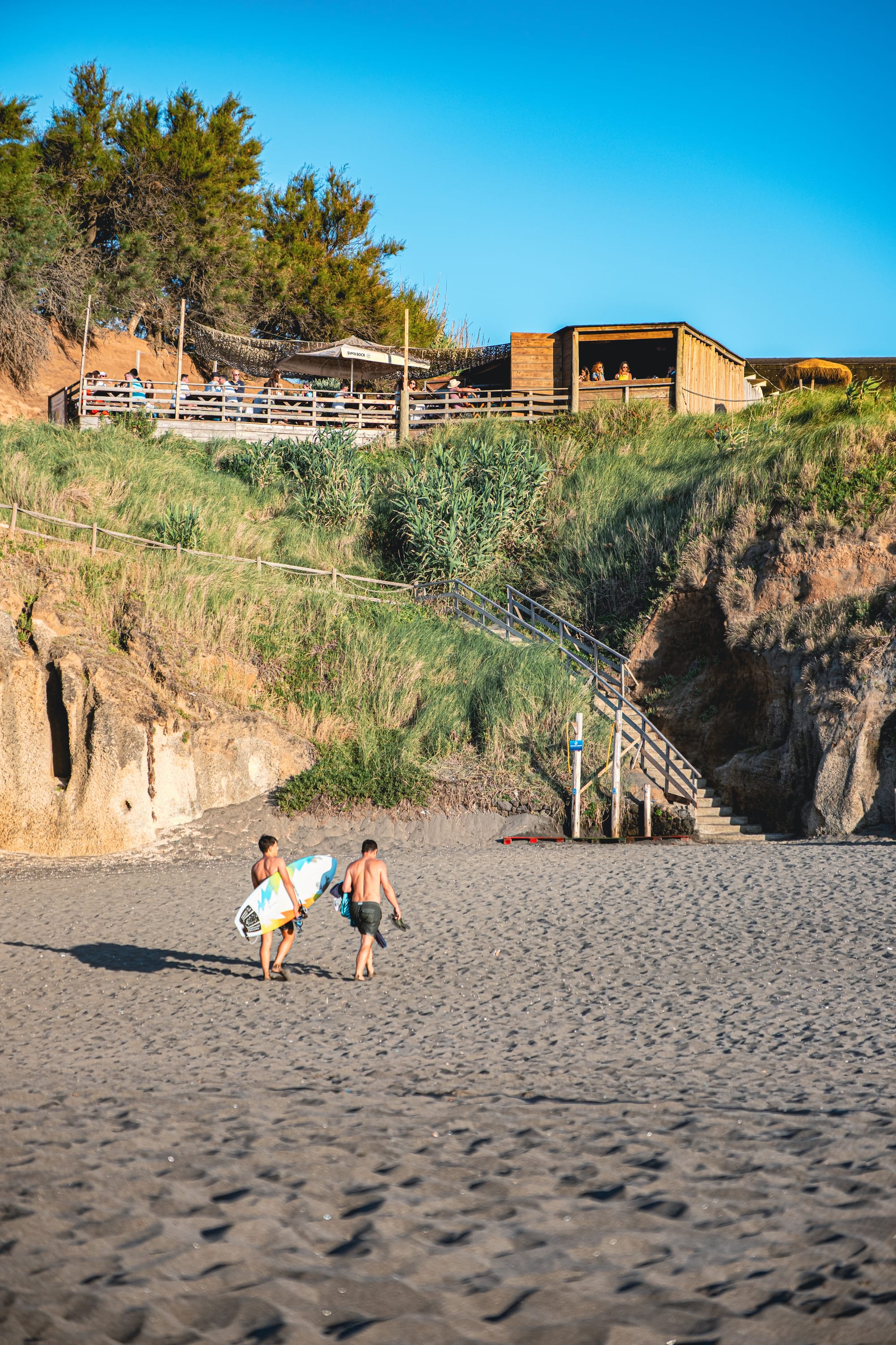 Praia do Areal de Santa Bárbara, a long black-sand beach perfect for surfing, sunsets, and beachside cafés