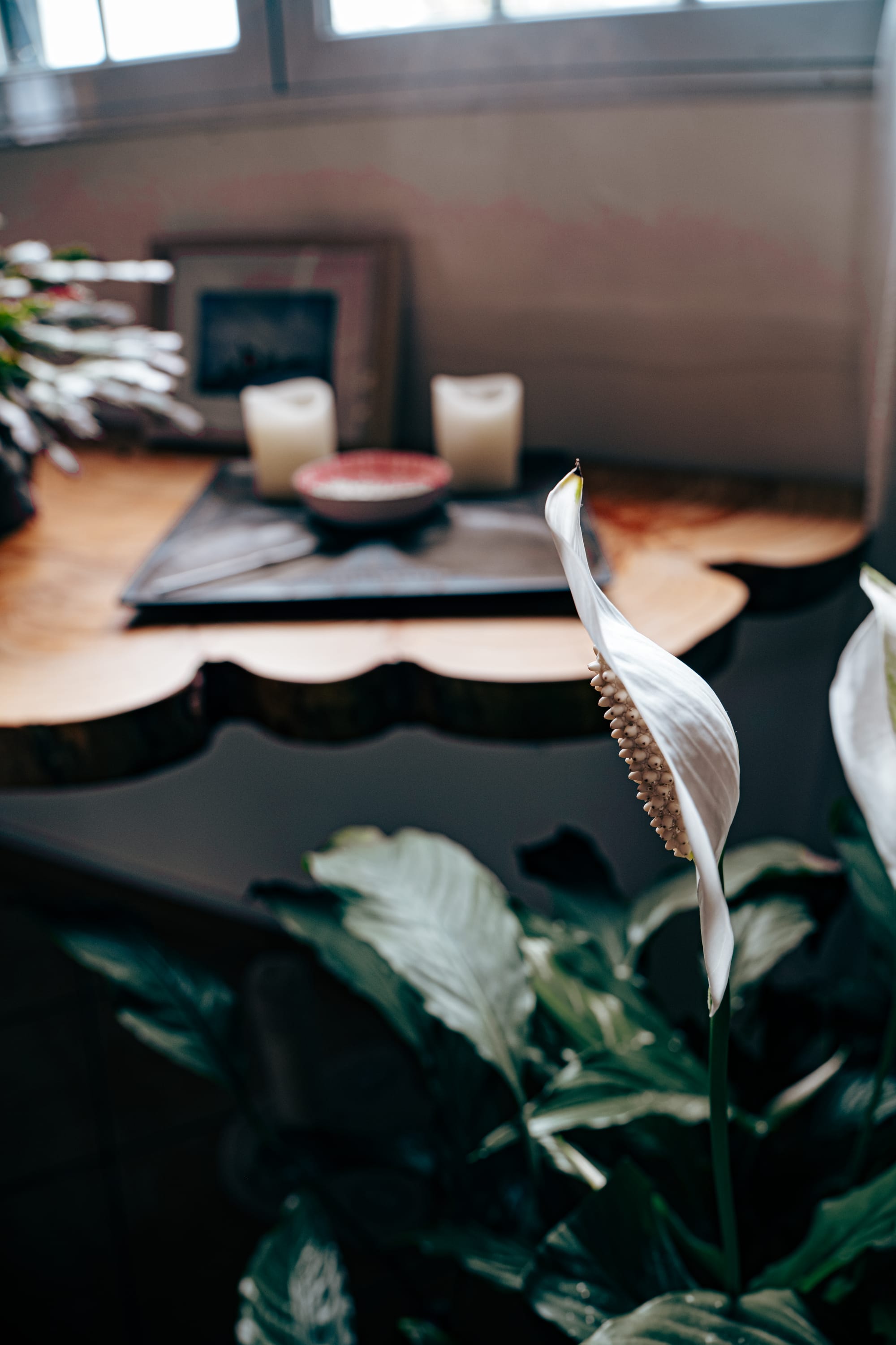 Scenes from Lava Coliving: a hand-painted workspace and leafy still life in the shared lounge