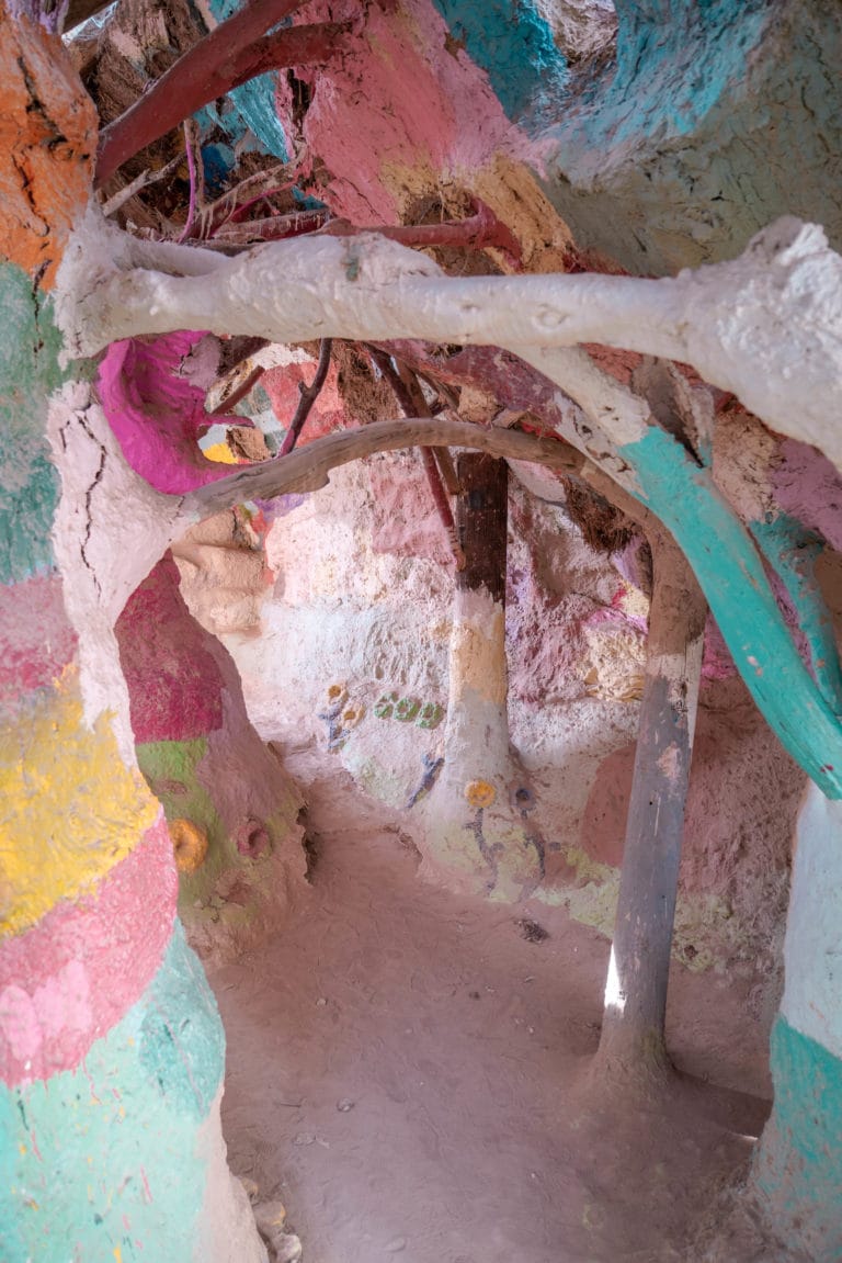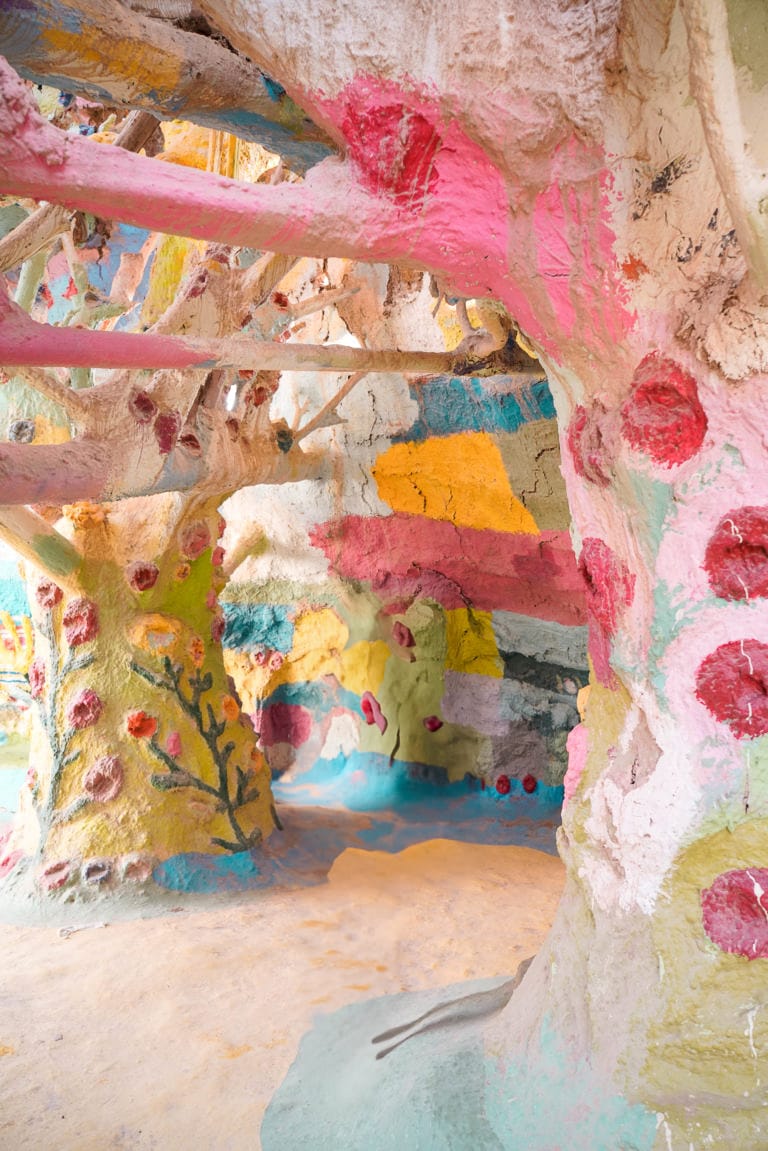 This time, he mixed adobe clay with straw, applied paint after paint until the surface hardened, until color itself became a kind of mortar. He scavenged telephone poles, tires, car parts. Donations of leftover house paint arrived by the bucketload. Over nearly three decades, he poured more than half a million gallons of paint into the desert, layering the slope with technicolor rivers, biblical verses, flowers, suns, trees. At its peak: three stories high, 100 feet wide, shimmering under the California sky. He called it Salvation Mountain.