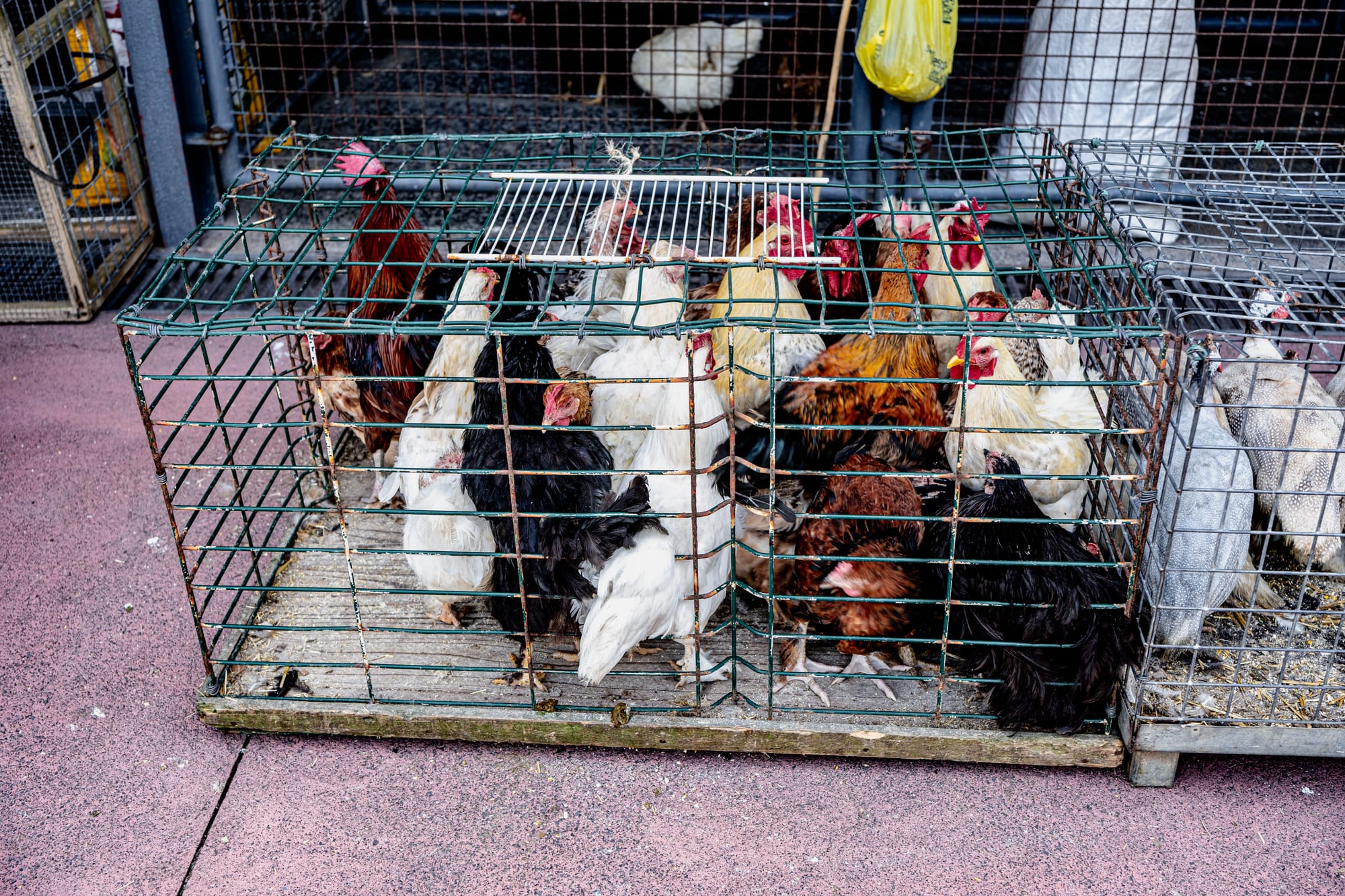 Chickens and ducks for sale—an unsettling but visible part of the market