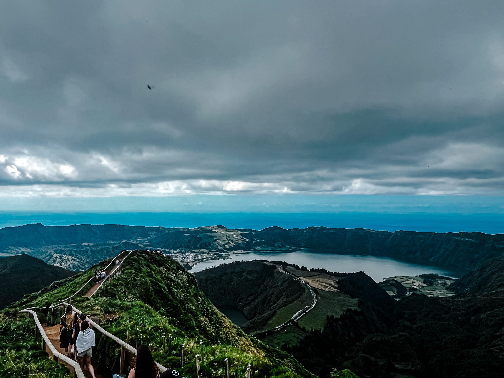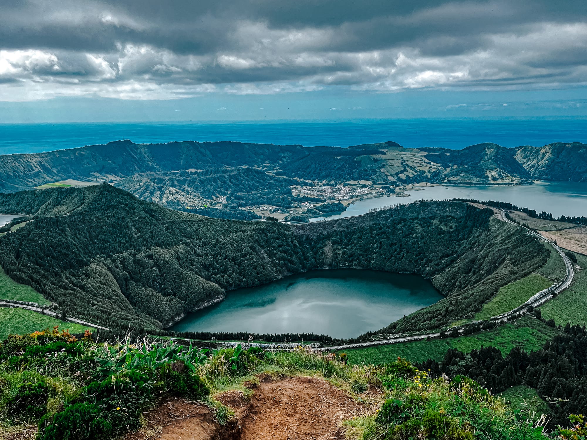 The viewpoint is named after King Carlos of Portugal, who visited in 1901, and it’s easy to see why the site carries royal weight. The lakes shine below, separated by a narrow isthmus and surrounded by the collapsed rim of the volcano.