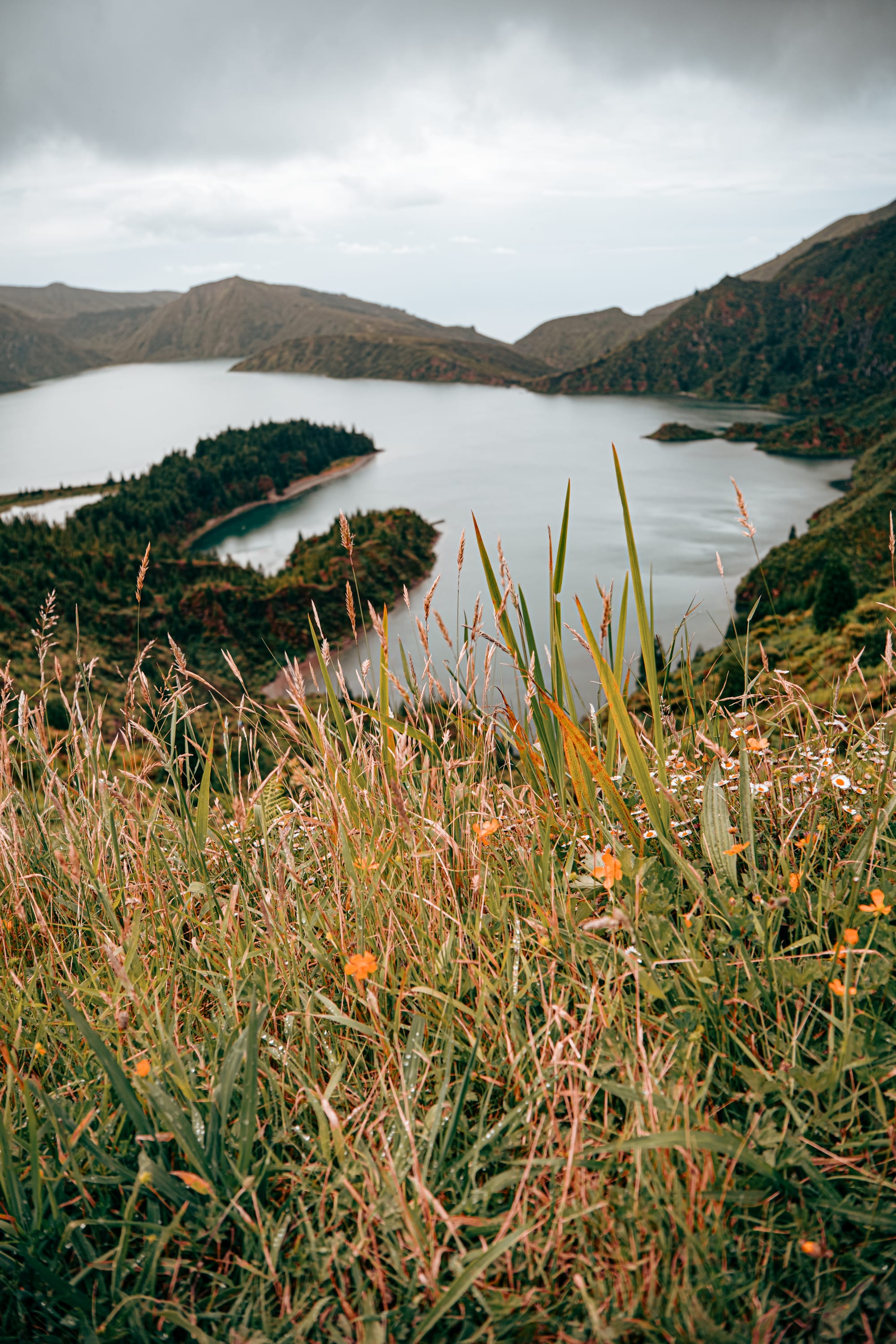 Wildflowers in the foreground of Lagoa do Fogo, with ridgeline trails weaving through volcanic peaks