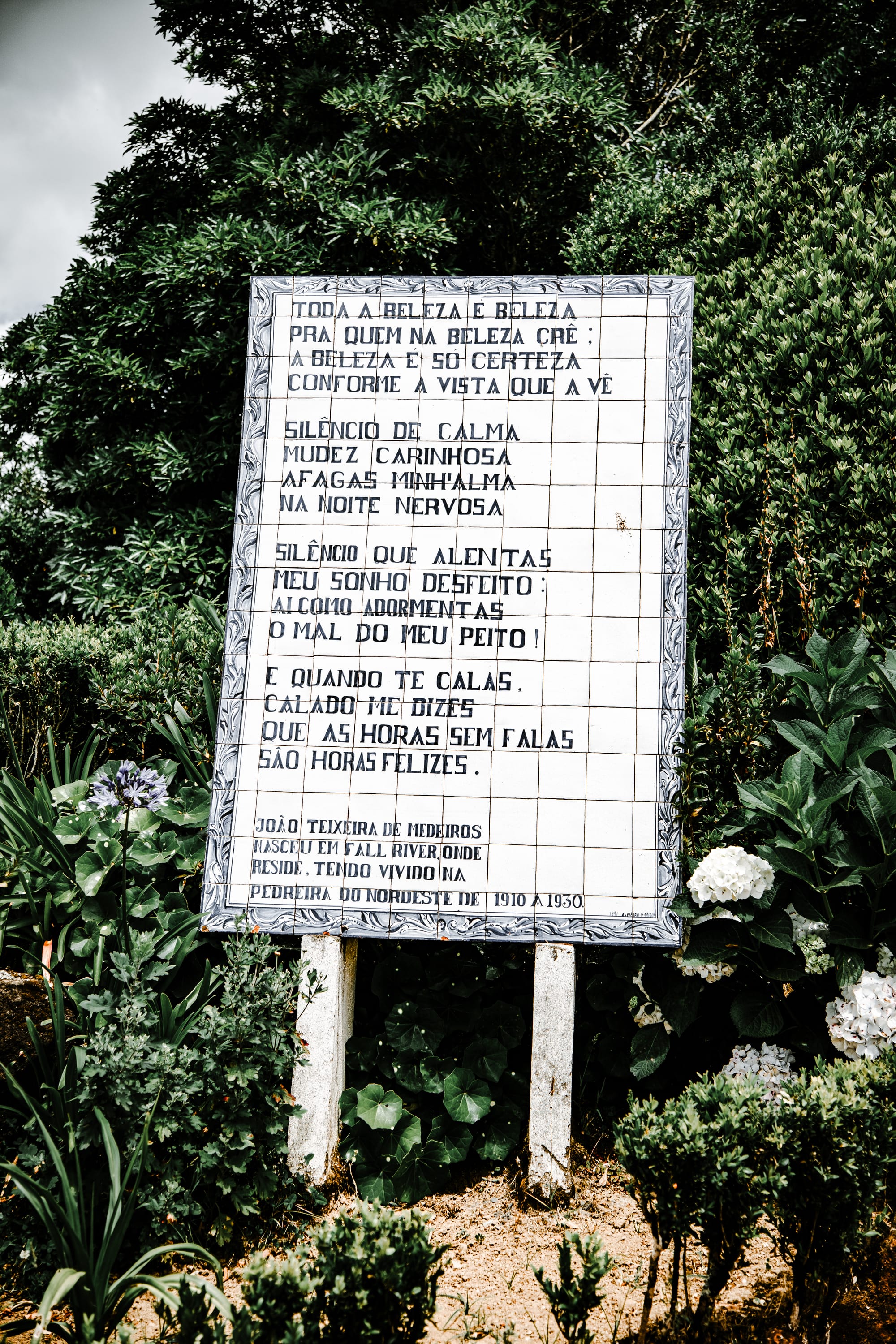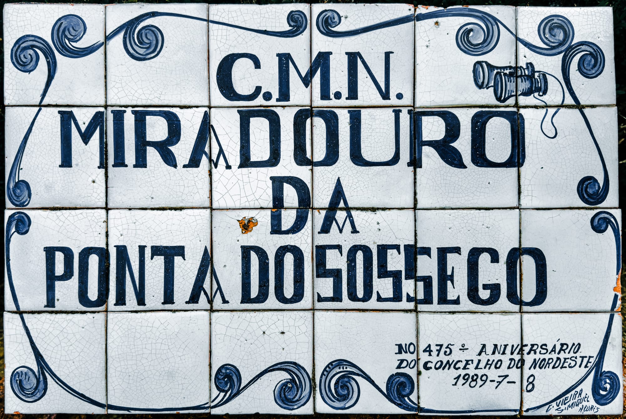 Poetic tiles and hand-lettered signage welcome visitors to Miradouro da Ponta do Sossego