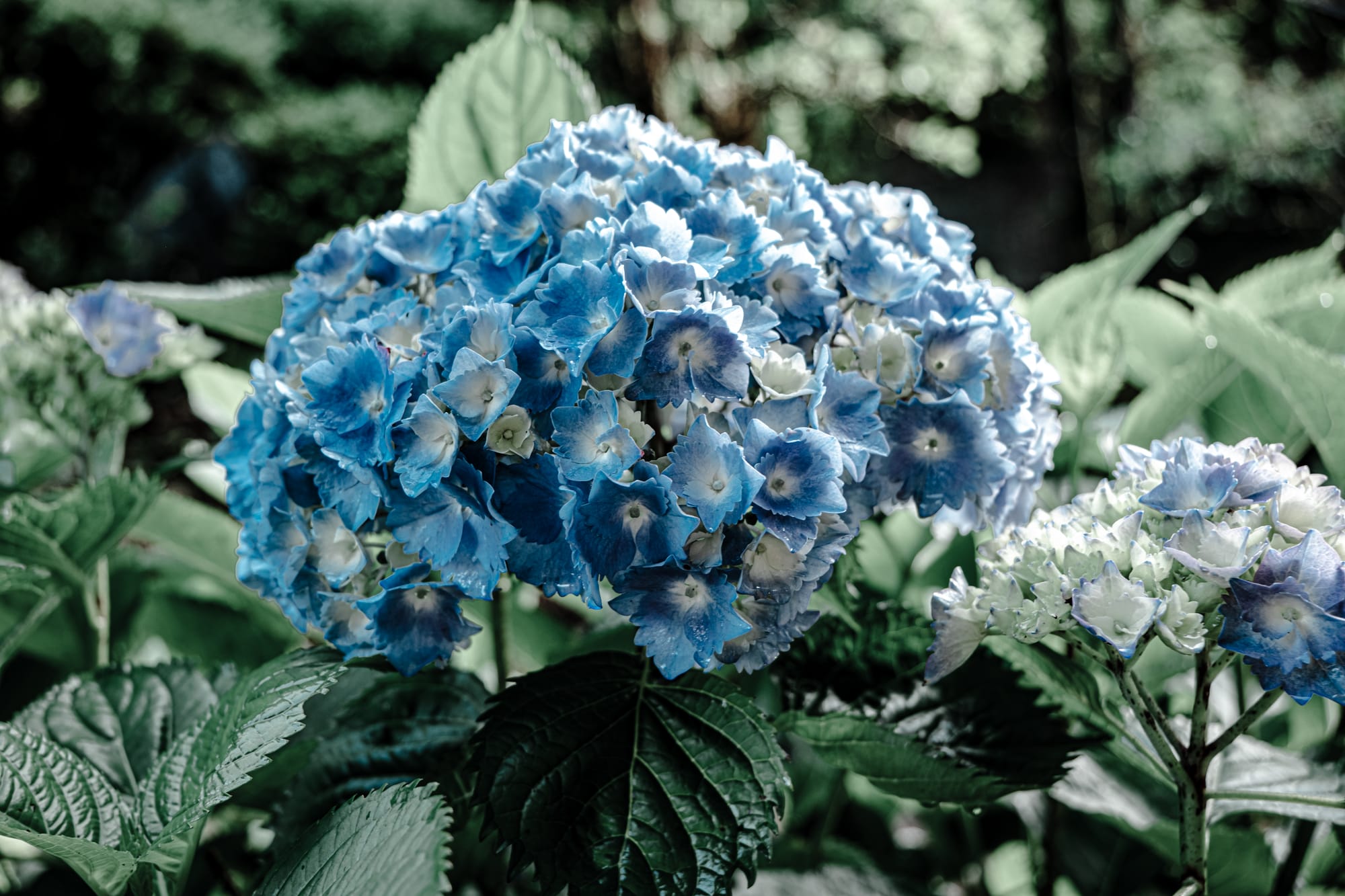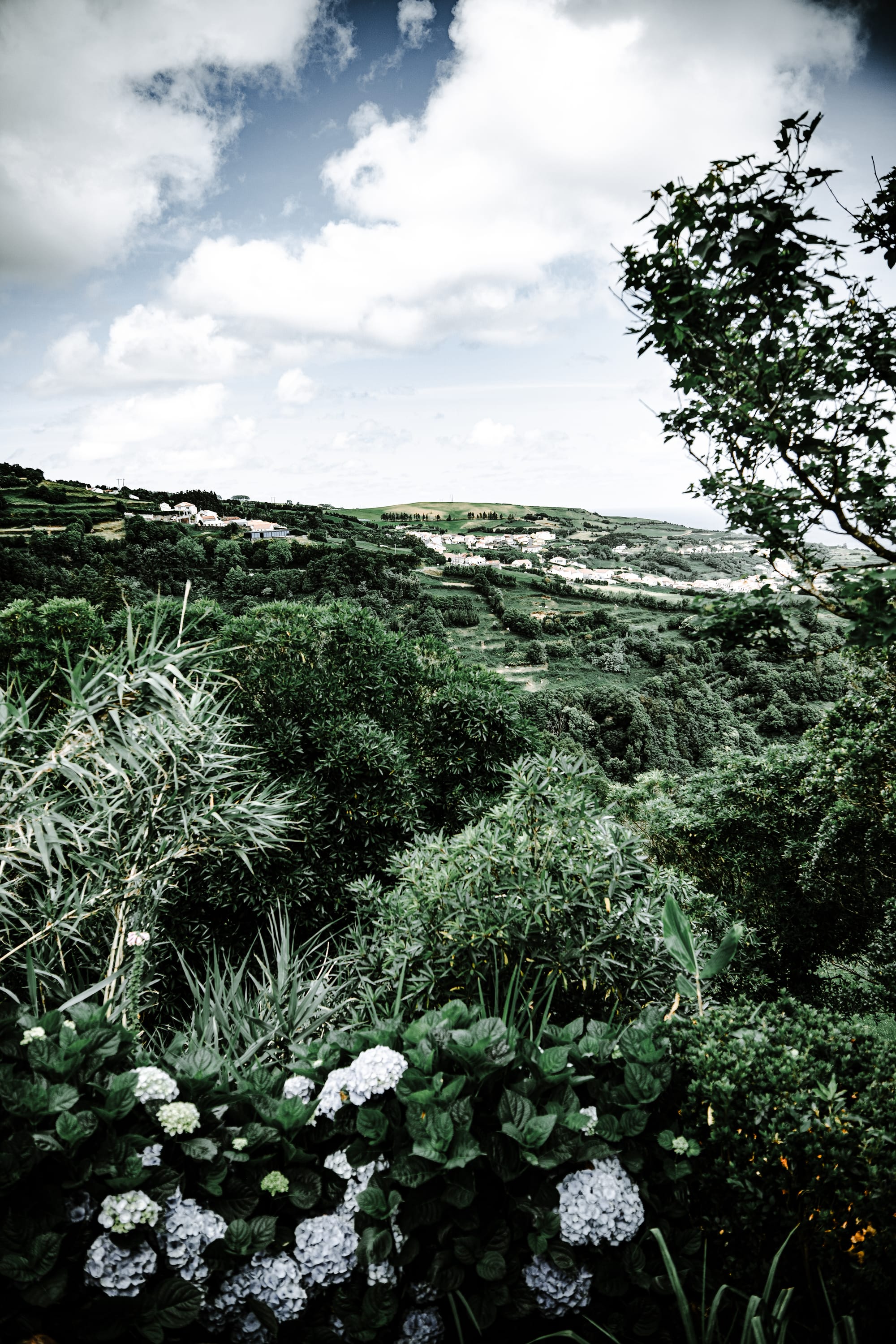 Hydrangeas crowd the hillside near the miradouro, their blooms sometimes catching ocean breeze and framing the view with deep blues and pale whites.