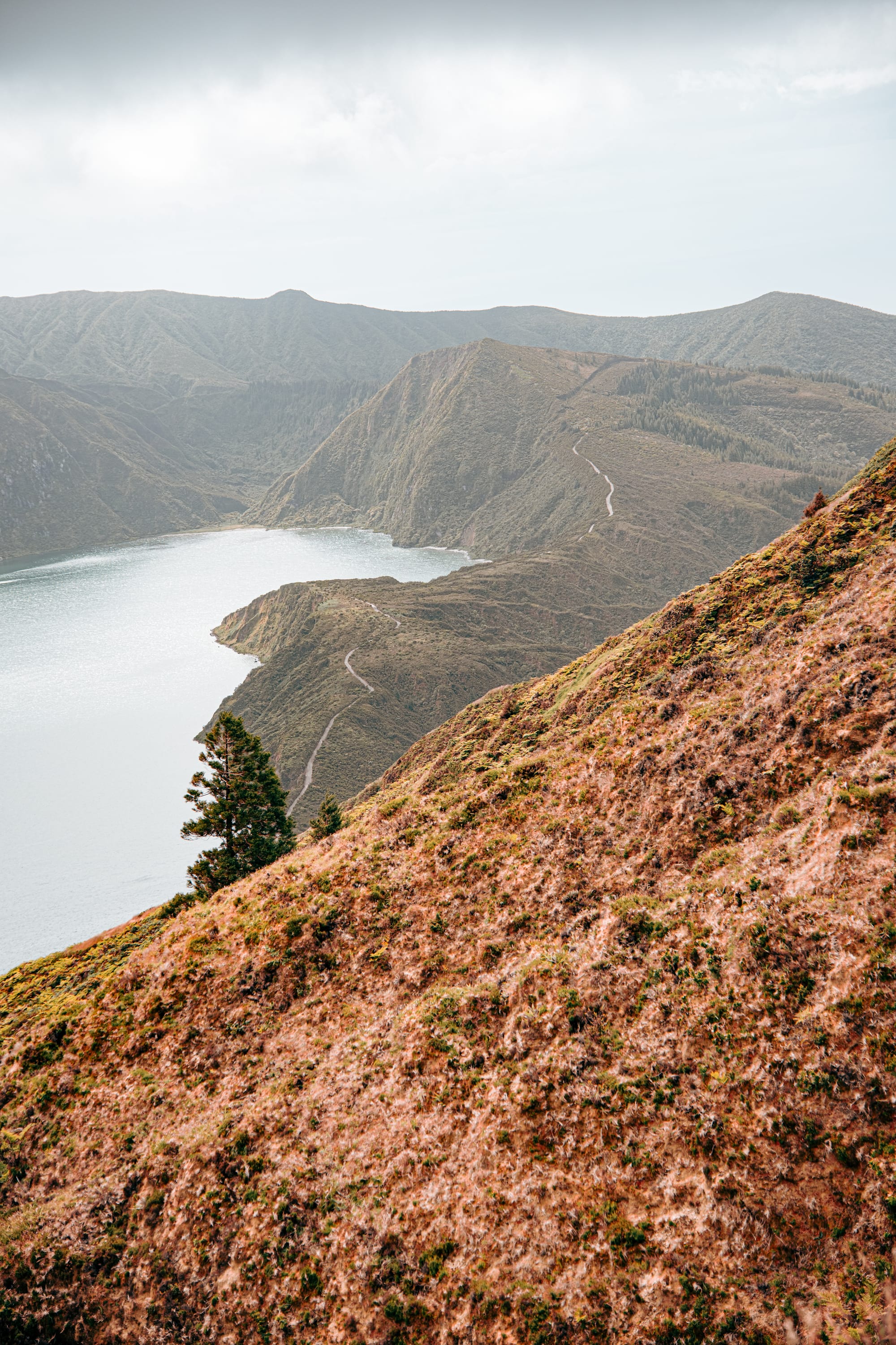 Lagoa do Fogo, or “Lake of Fire,” sits in the collapsed caldera of an extinct volcano—a jagged, green-brown basin of wilderness that feels almost otherworldly. And there are two major ways to see it: from Miradouro da Lagoa do Fogo and from Miradouro do Pico da Barrosa. Both sit along the high mountain road that slices through the central spine of the island, offering sweeping, elevated perspectives of the crater lake below.